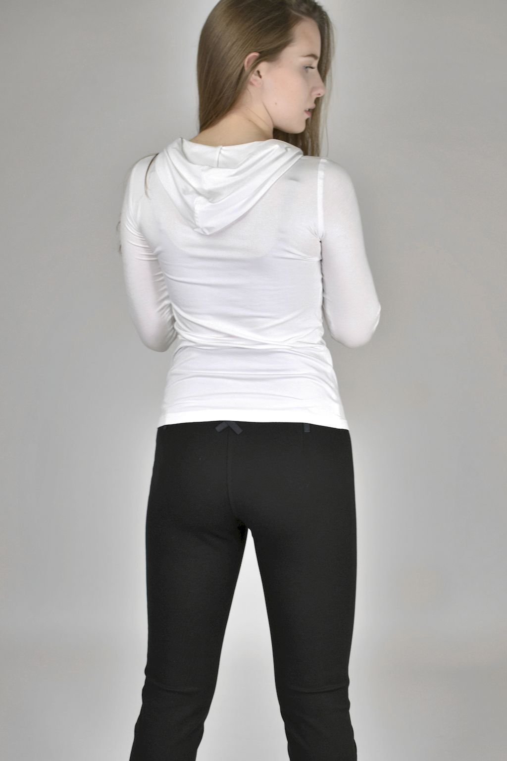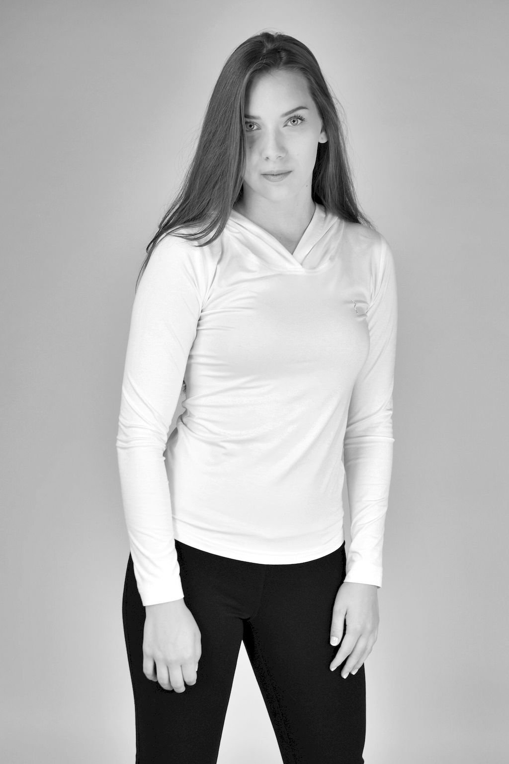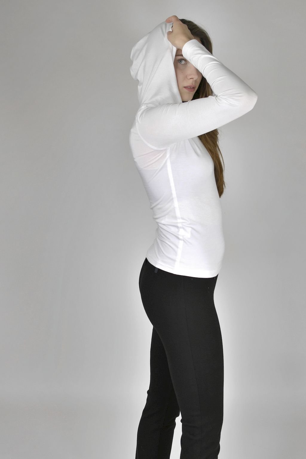 Dámské, minimalistické, bílé triko s kapucí ve sportovně elegantním designu s dlouhým rukávem, velmi příjemný a odolný materiál, autorské logo z broušených kamínků.