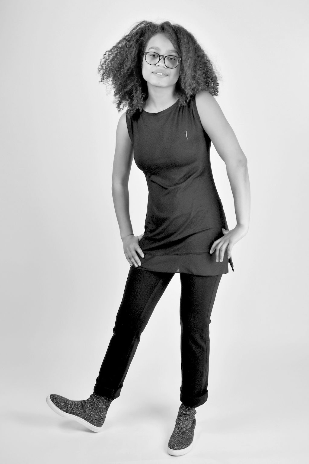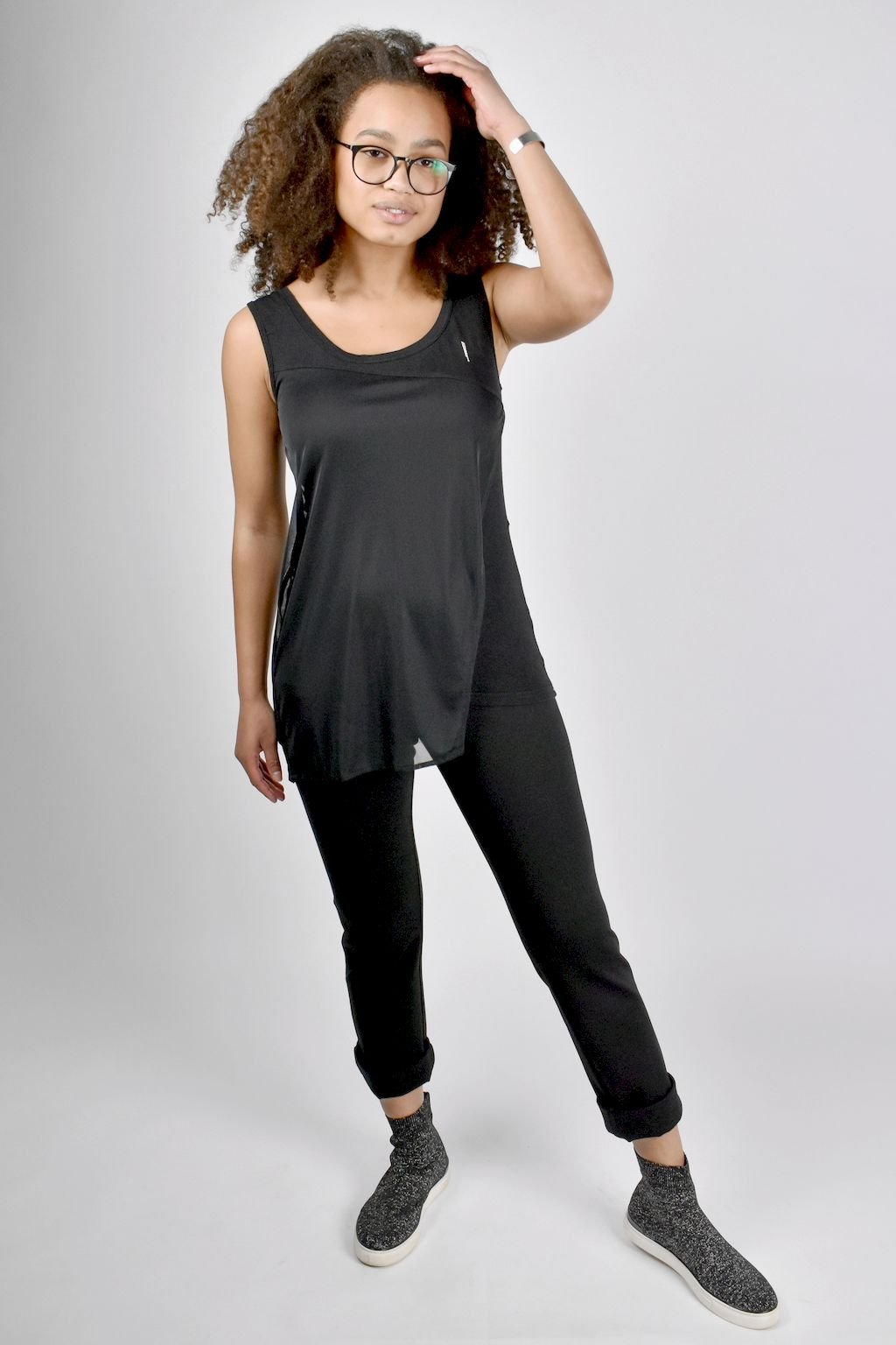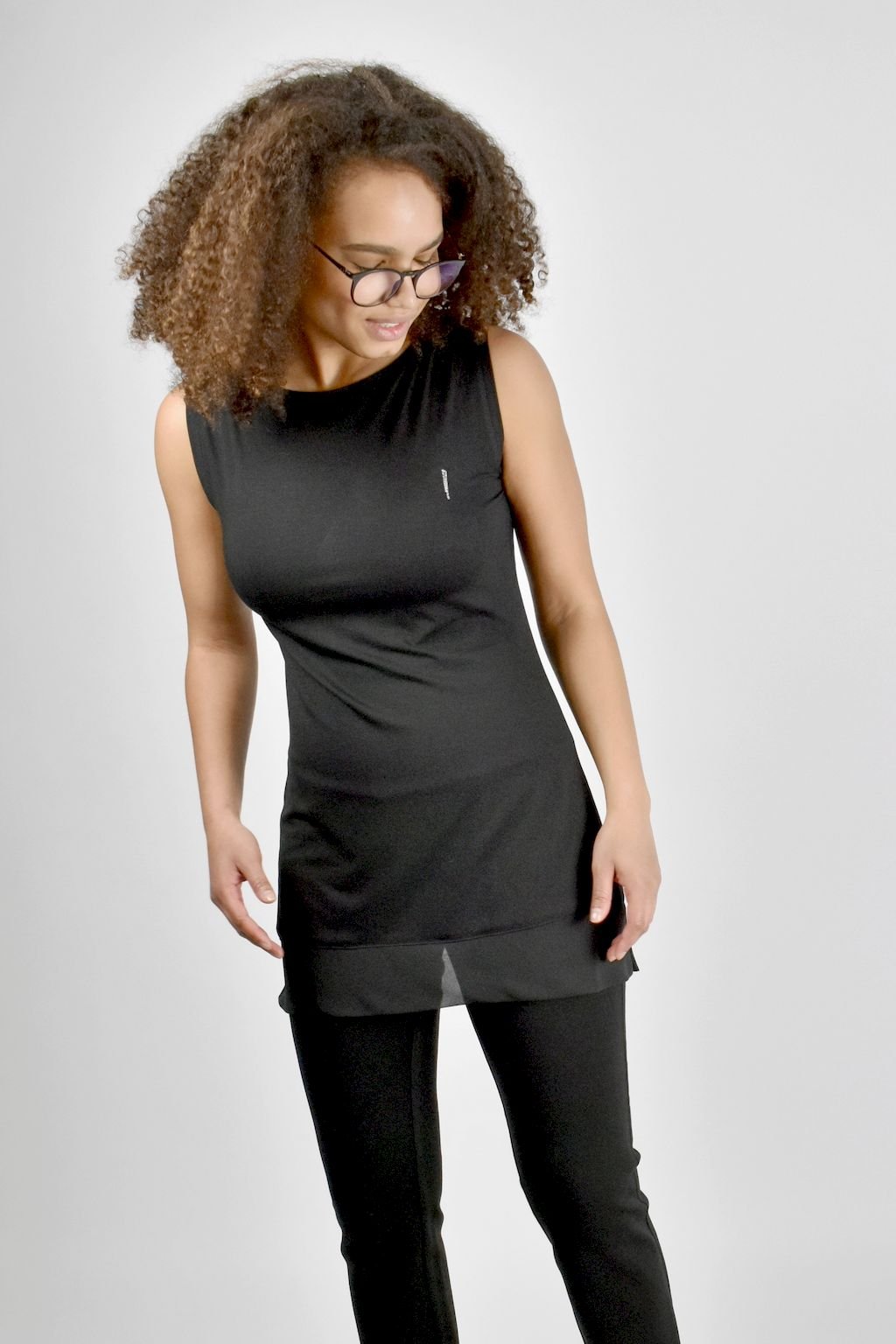 Dámská, černá tunika bez rukávů s efektním šifónovým lemem a rozparky. Součástí modelu je autorské logo z broušených kamínků Swarovski.