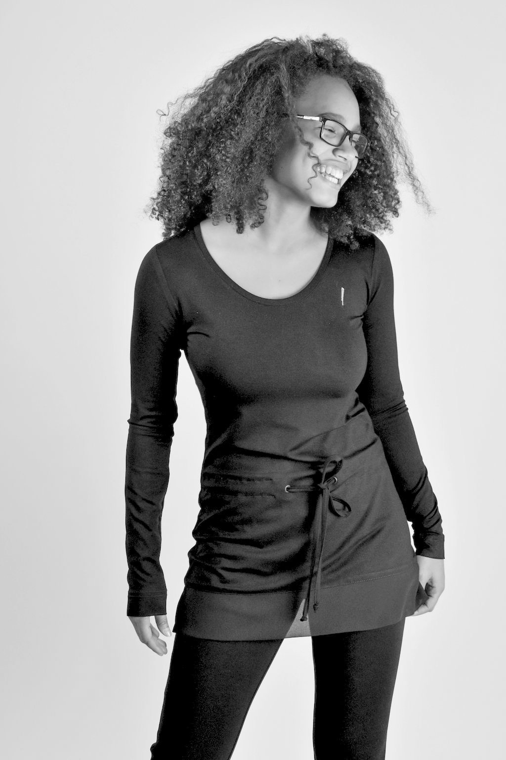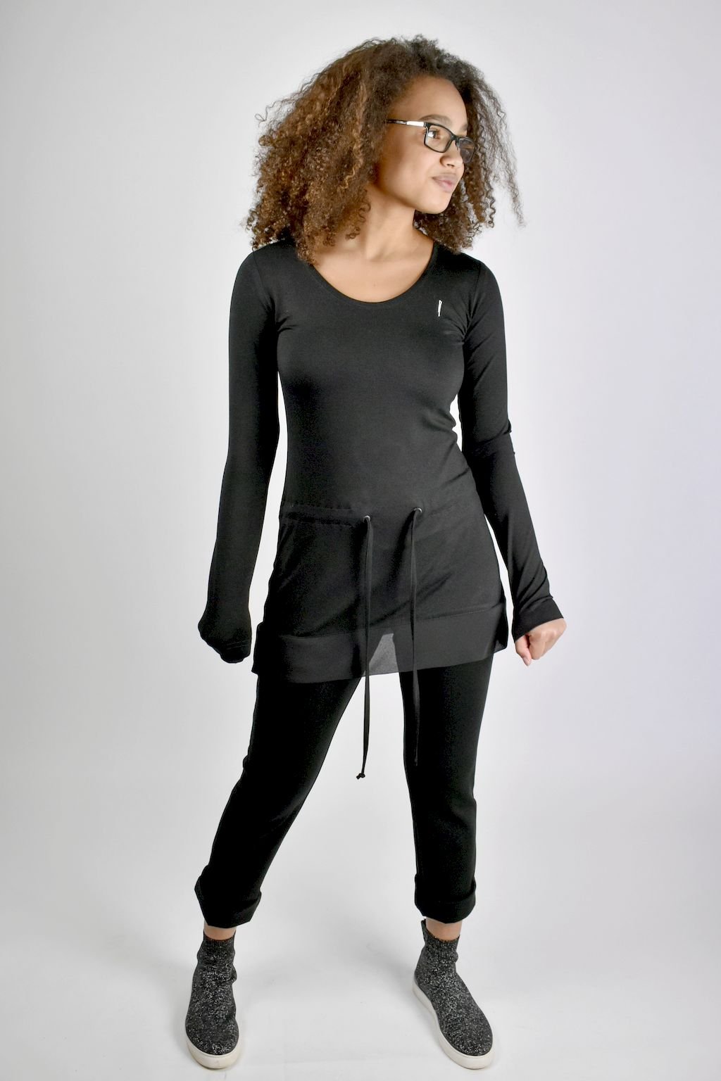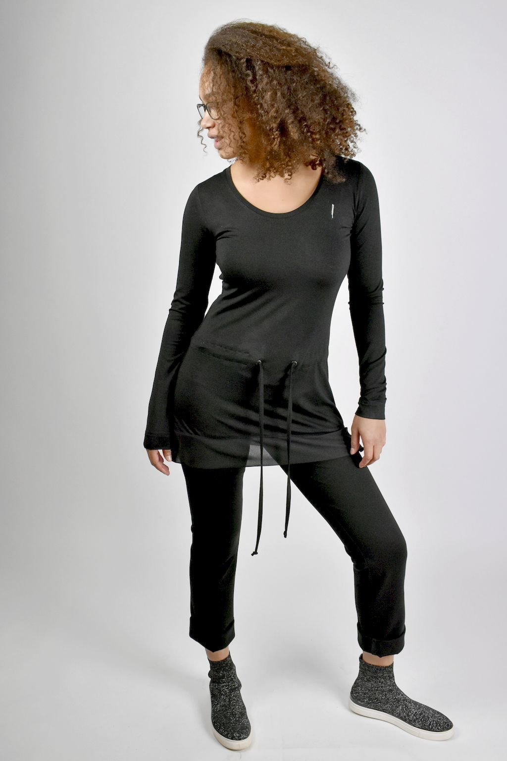 Černá tunika má v pase tunýlek s vazačkou na stahování, větší slušivý výstřih a dlouhý rukáv. Součástí modelu je autorské logo z broušených kamínků Swarovski.