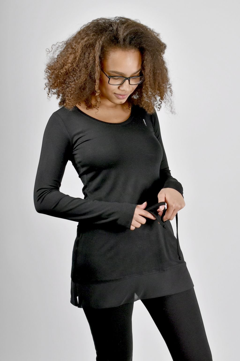 ČERNÁ TUNIKA S VÝSTŘIHEM V PASE NA STAHOVÁNÍ DLOUHÝ RUKÁV