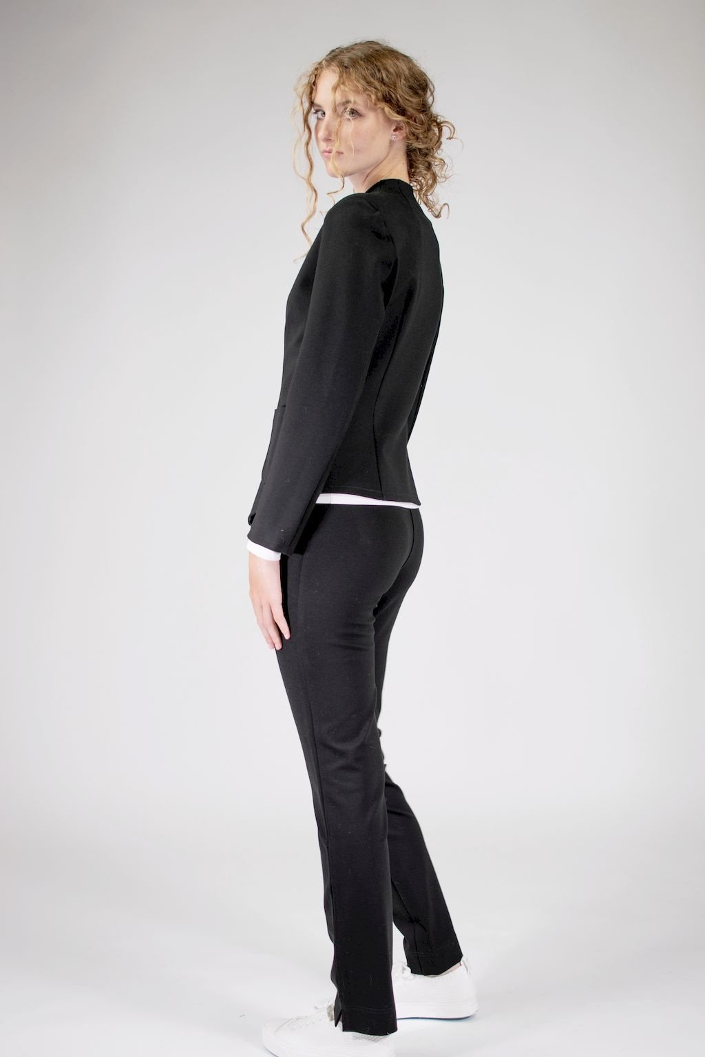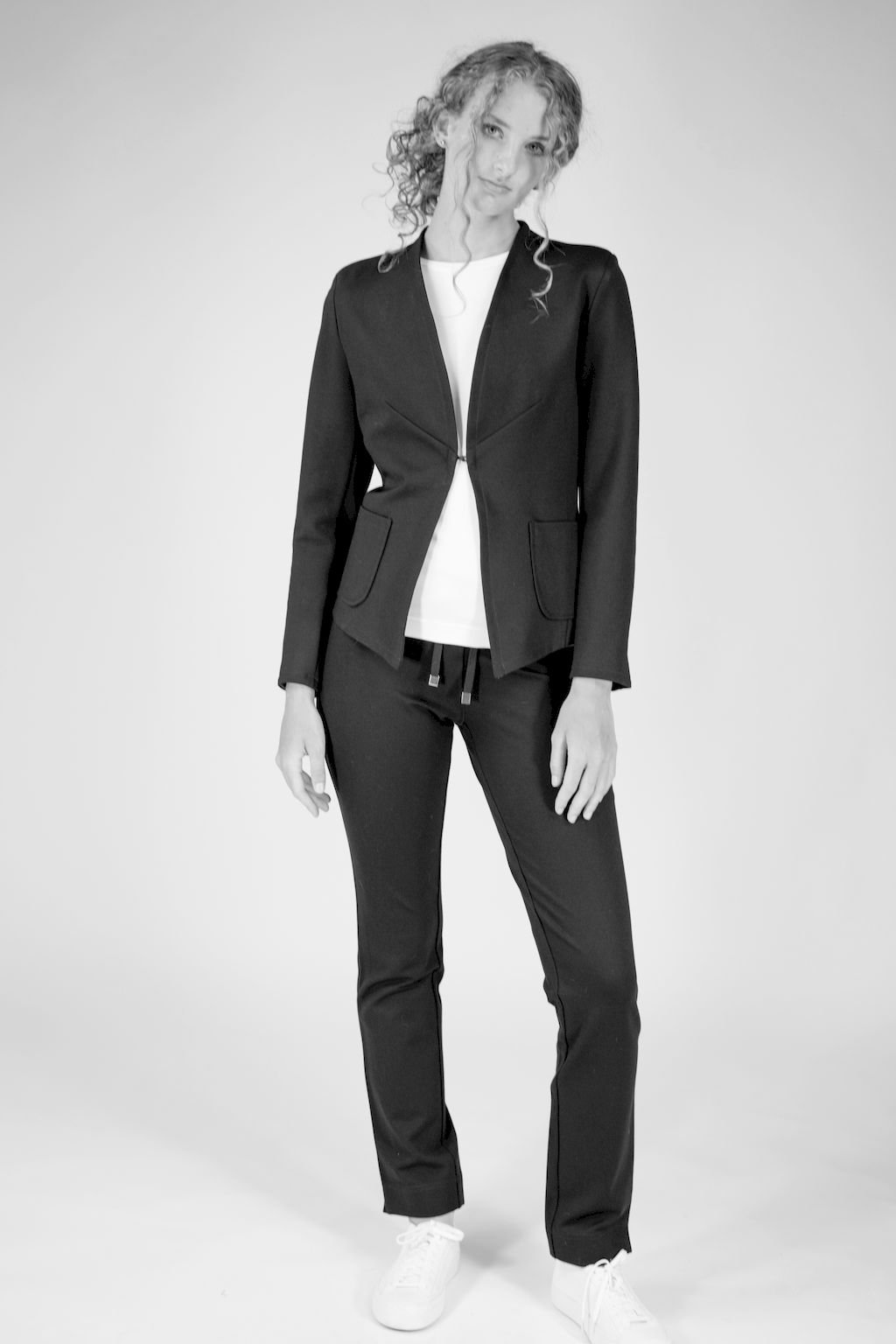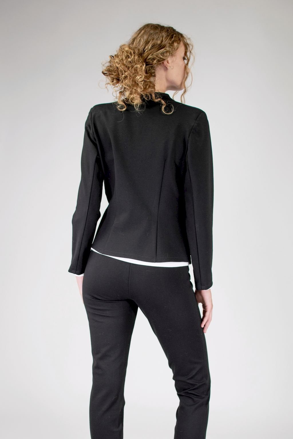 Černé, lehké sako bez podšívky, vypasovaného střihu. Dotykové zapínání na nenápadný opletený háček, dvě nakládané kapsy.