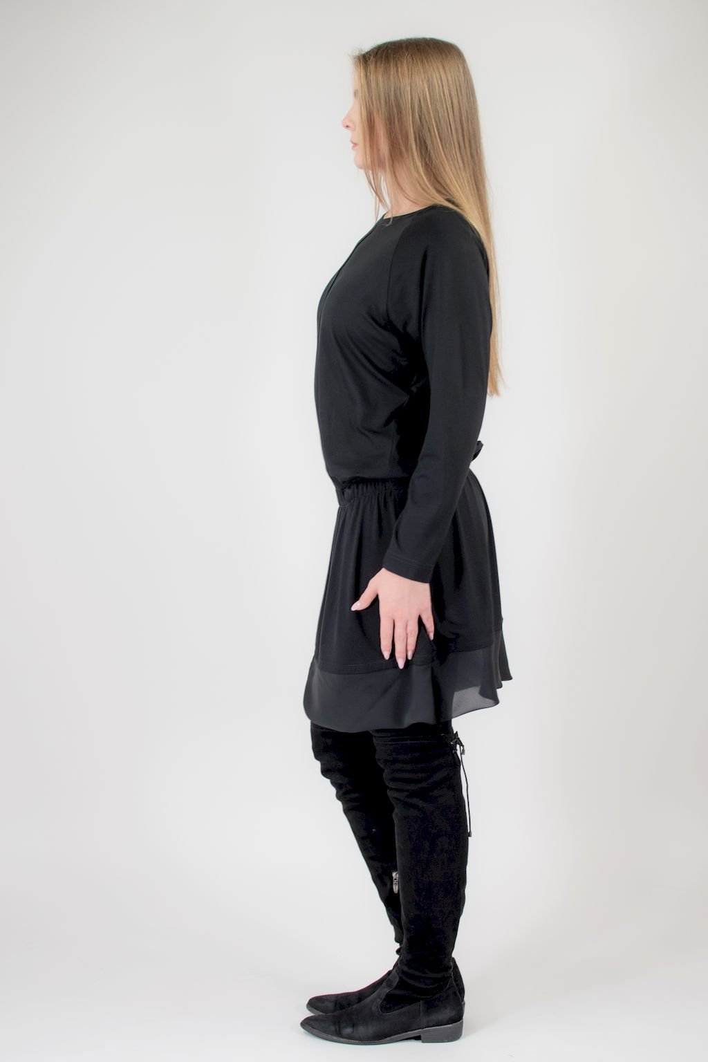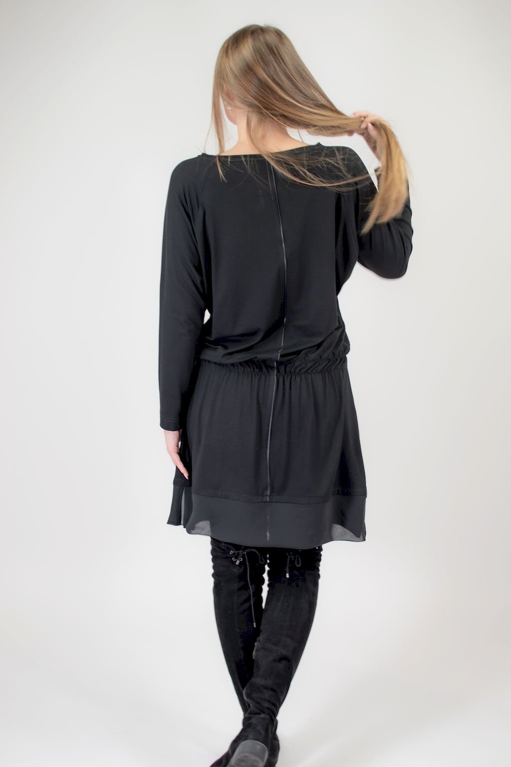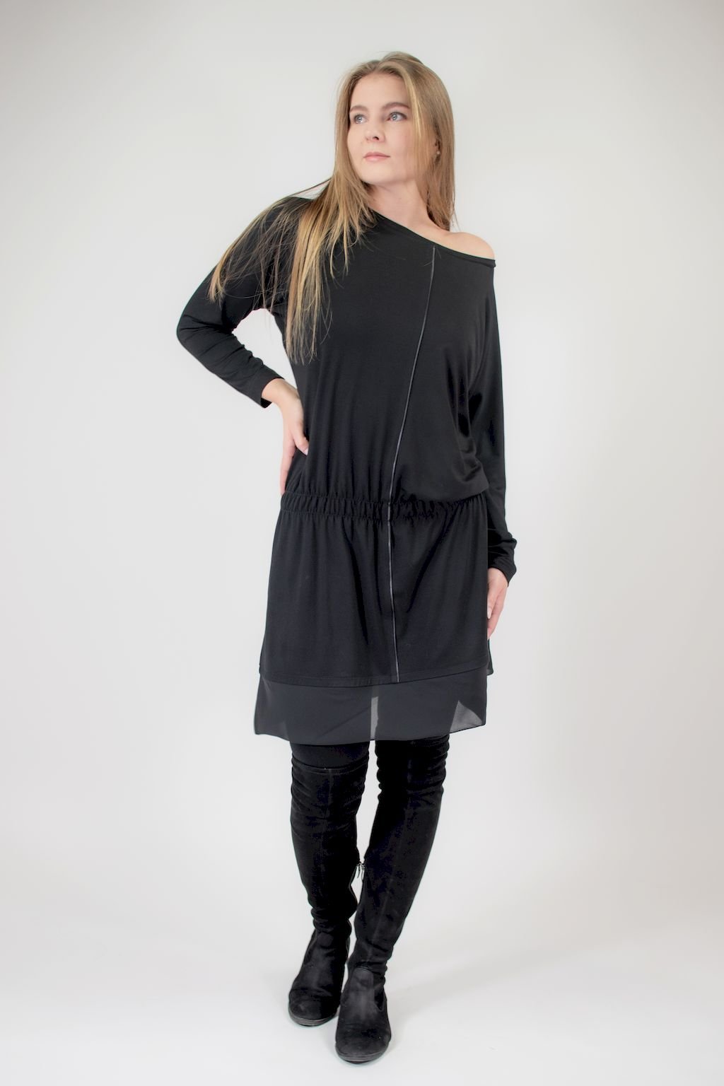 Dámské šaty pro každou příležitost. Lodičkový výstřih, dlouhý rukáv, přední díl lichotivě rozčleněný lesklou výpustkou, v pase nabírané do měkké gumy. Okraj sukně zdobí šifonový lem.