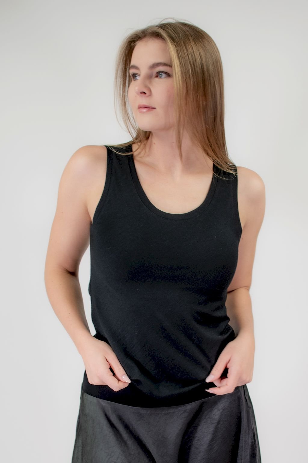 Dámské černé tílko, využijete jako spodní vrstvu oblečení i jako samostatnou součást outfitu. Šikmo střižený materiál na tílku krásně kopíruje vaše křivky. Merino vlna se vyznačuje skvělými termoregulačními a přirozeně antibakteriálními vlastnostmi.