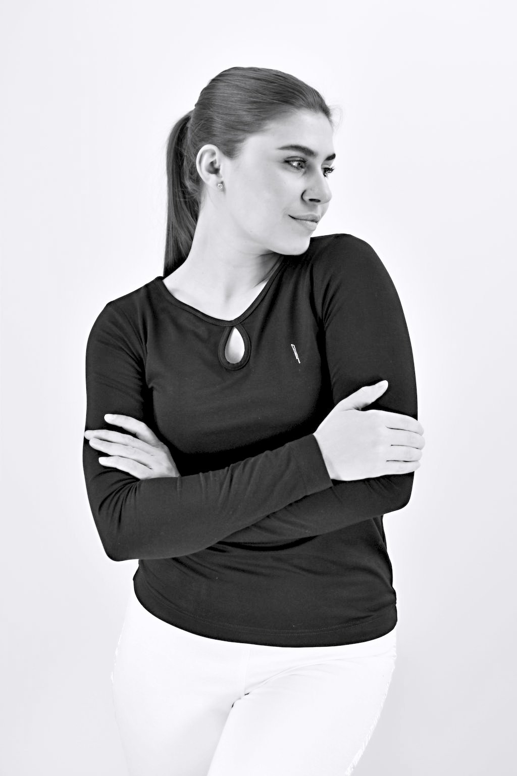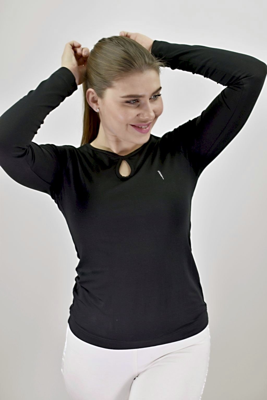 Dámské, černé triko se slzičkou ve výstřihu s dlouhým rukávem, součástí modelu je autorské logo z broušených kamínků Swarovski.