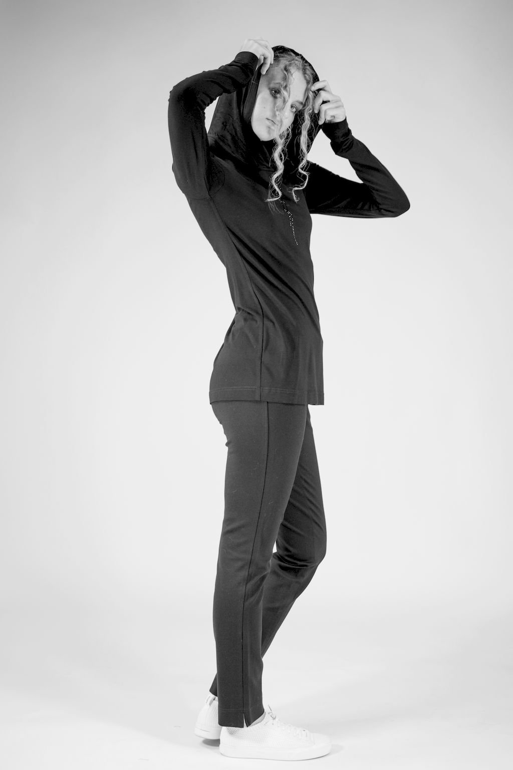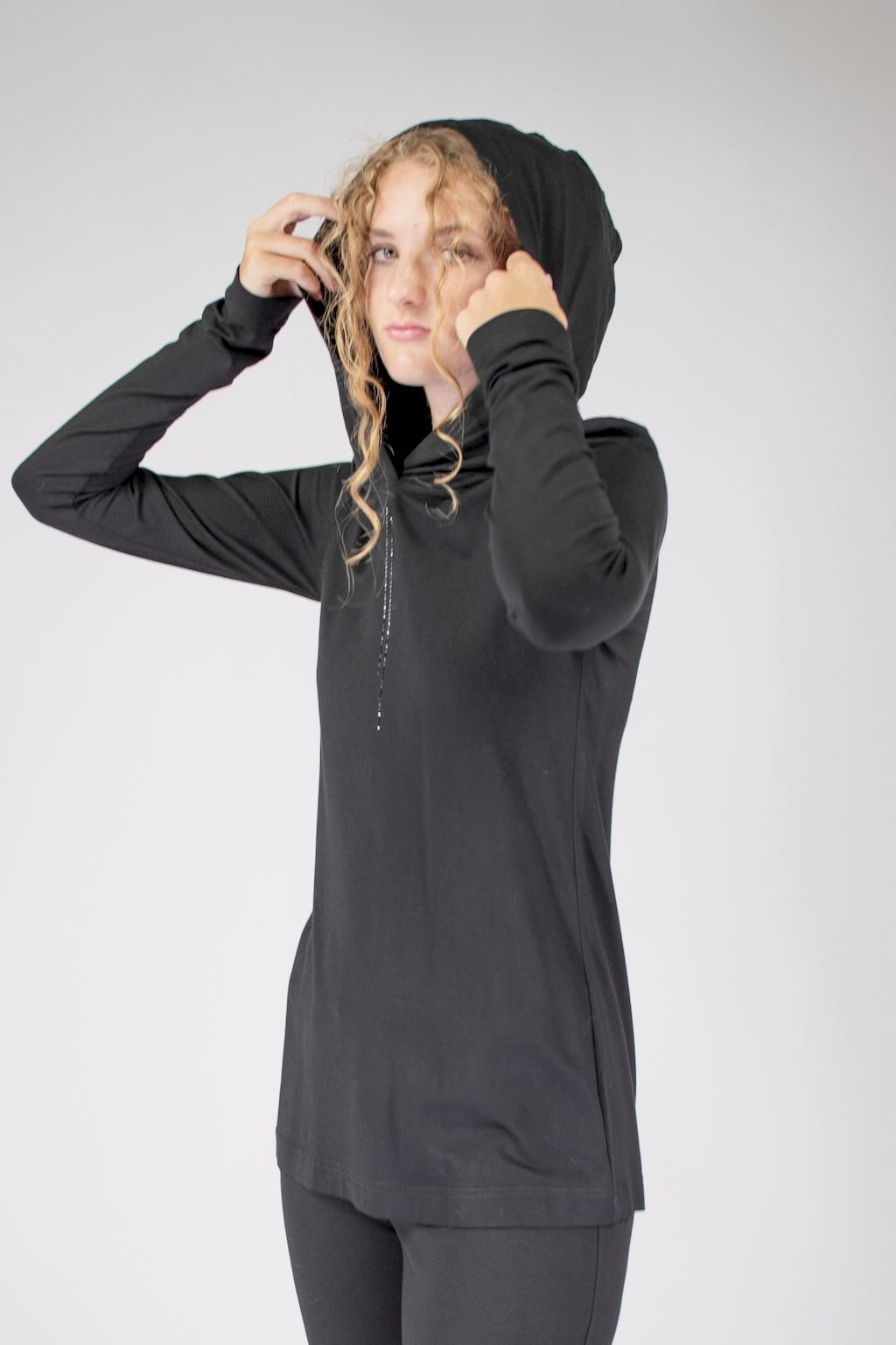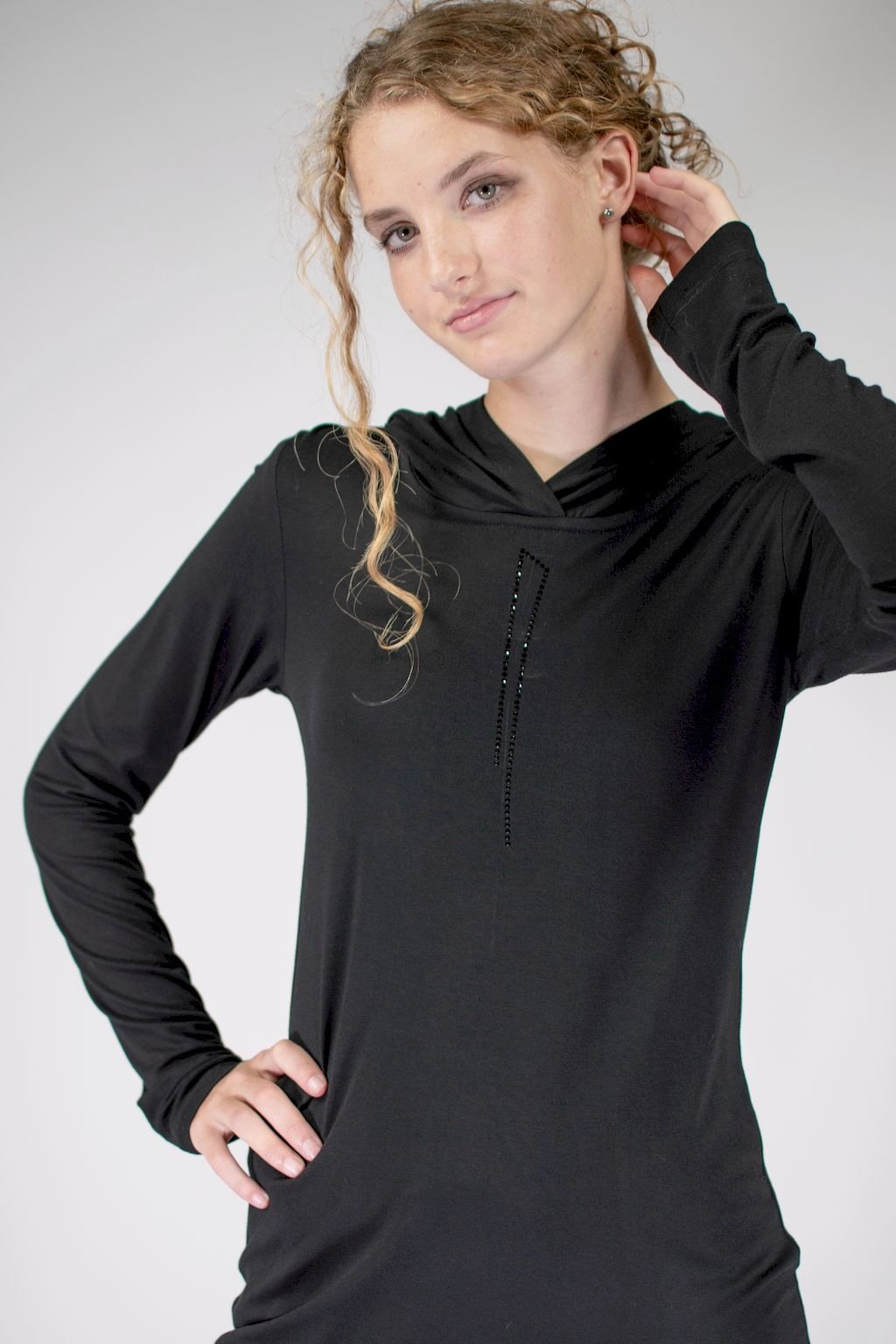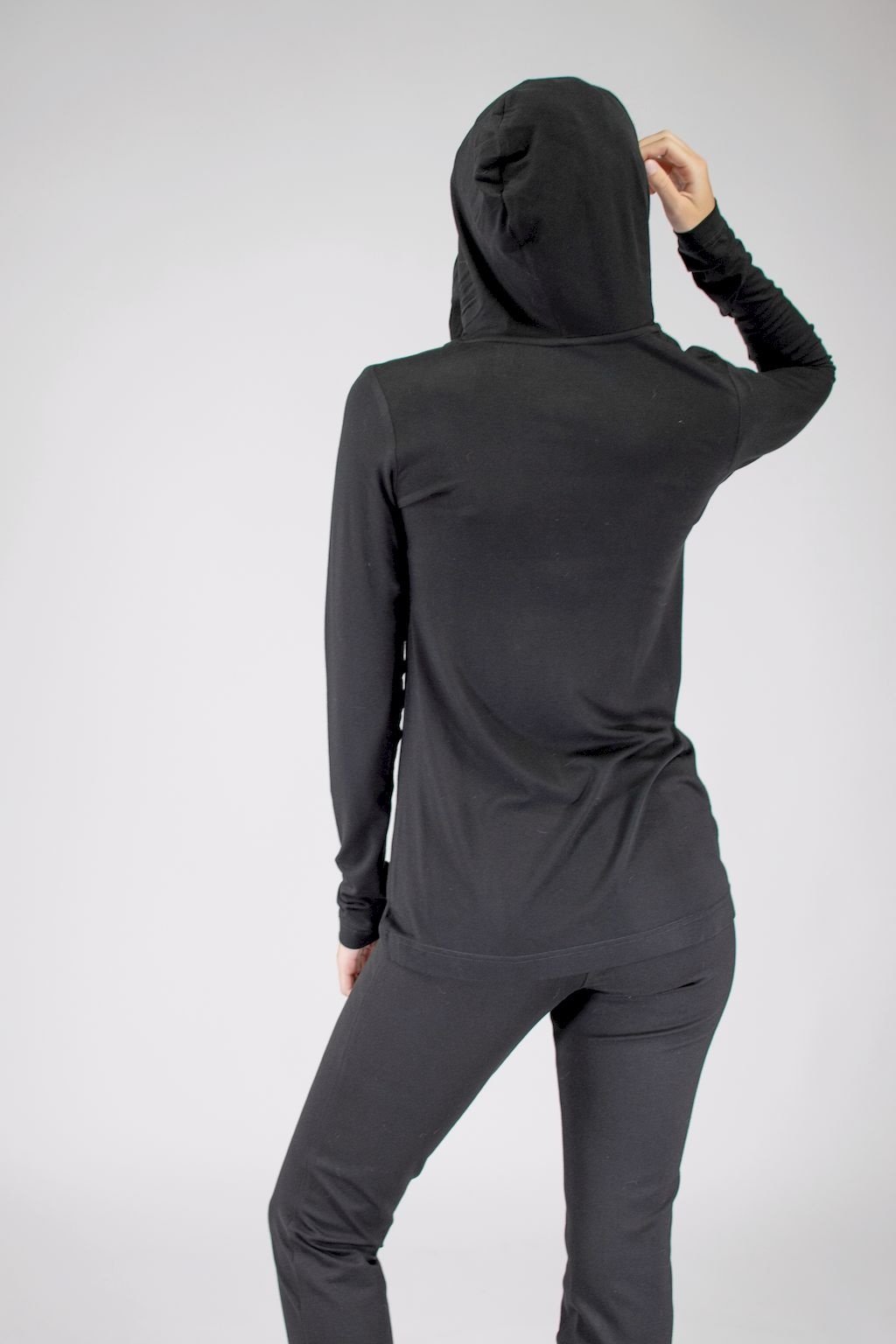 Dámské černé triko v prodloužené délce s kapucí, které lze nosit místo svetříku. Vyrobeno je ze speciálně upraveného materiálu, z opalovaného viskózového vlákna. Toto vlákno je extrémně odolné vůči oděru. A právě díky této vlastnosti si triko zachovává po dlouhý čas svůj luxusní vzhled. Je proto vhodné pro jakoukoliv příležitost, lze ho kombinovat v nekonečném počtu outfitů.
