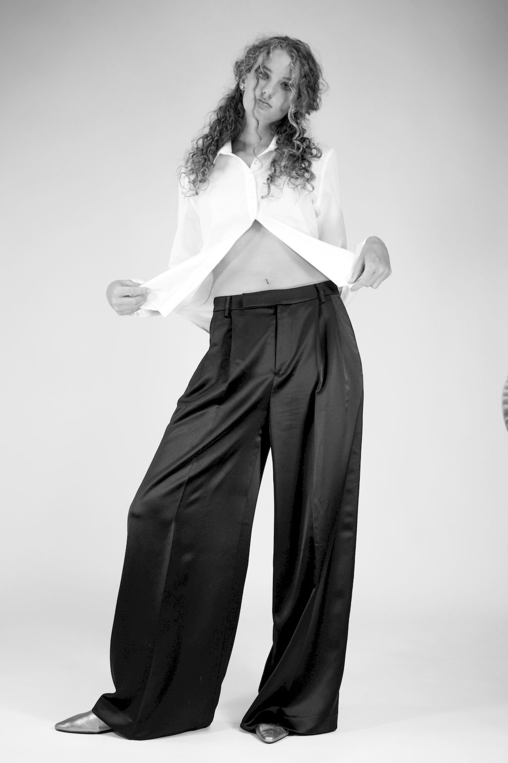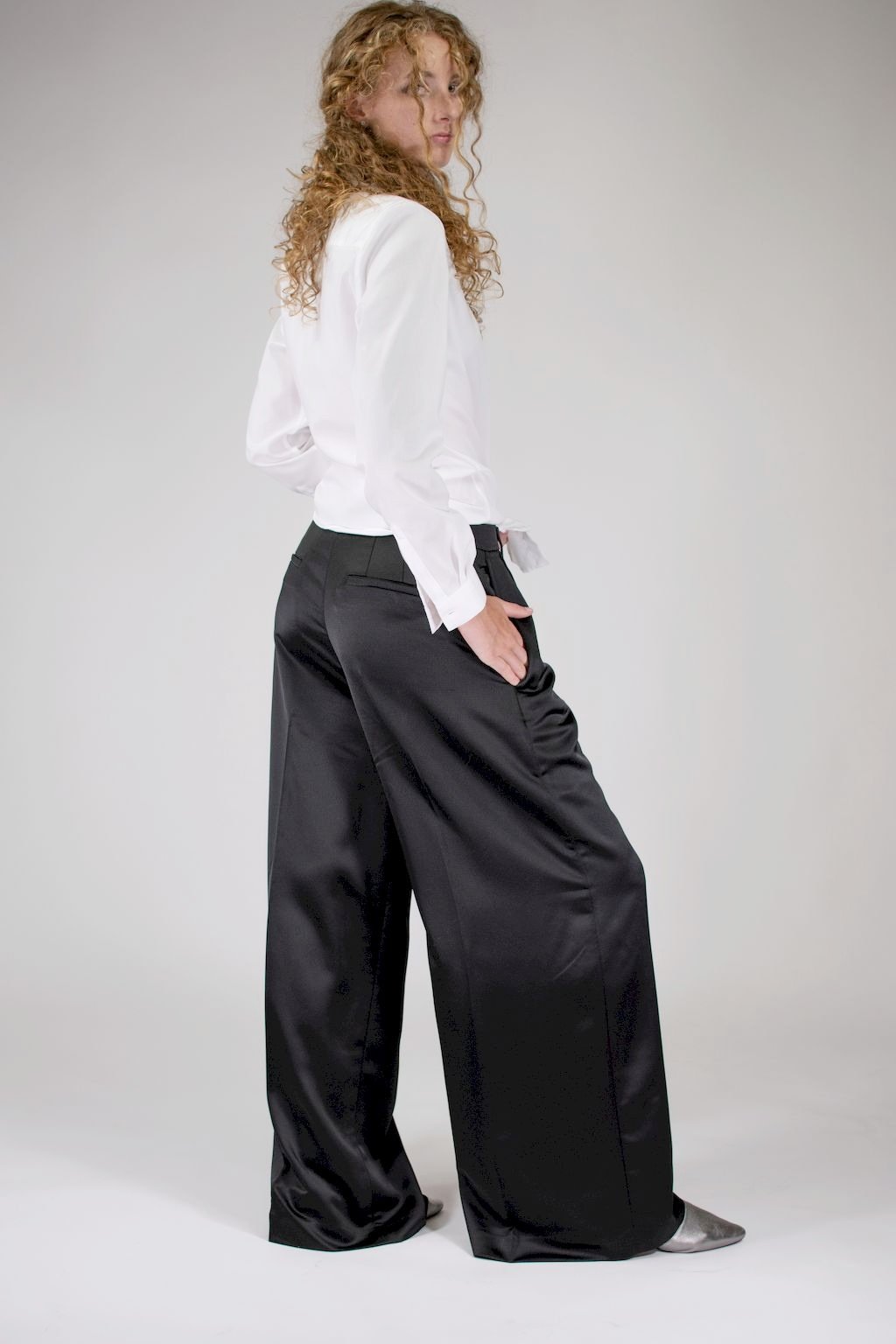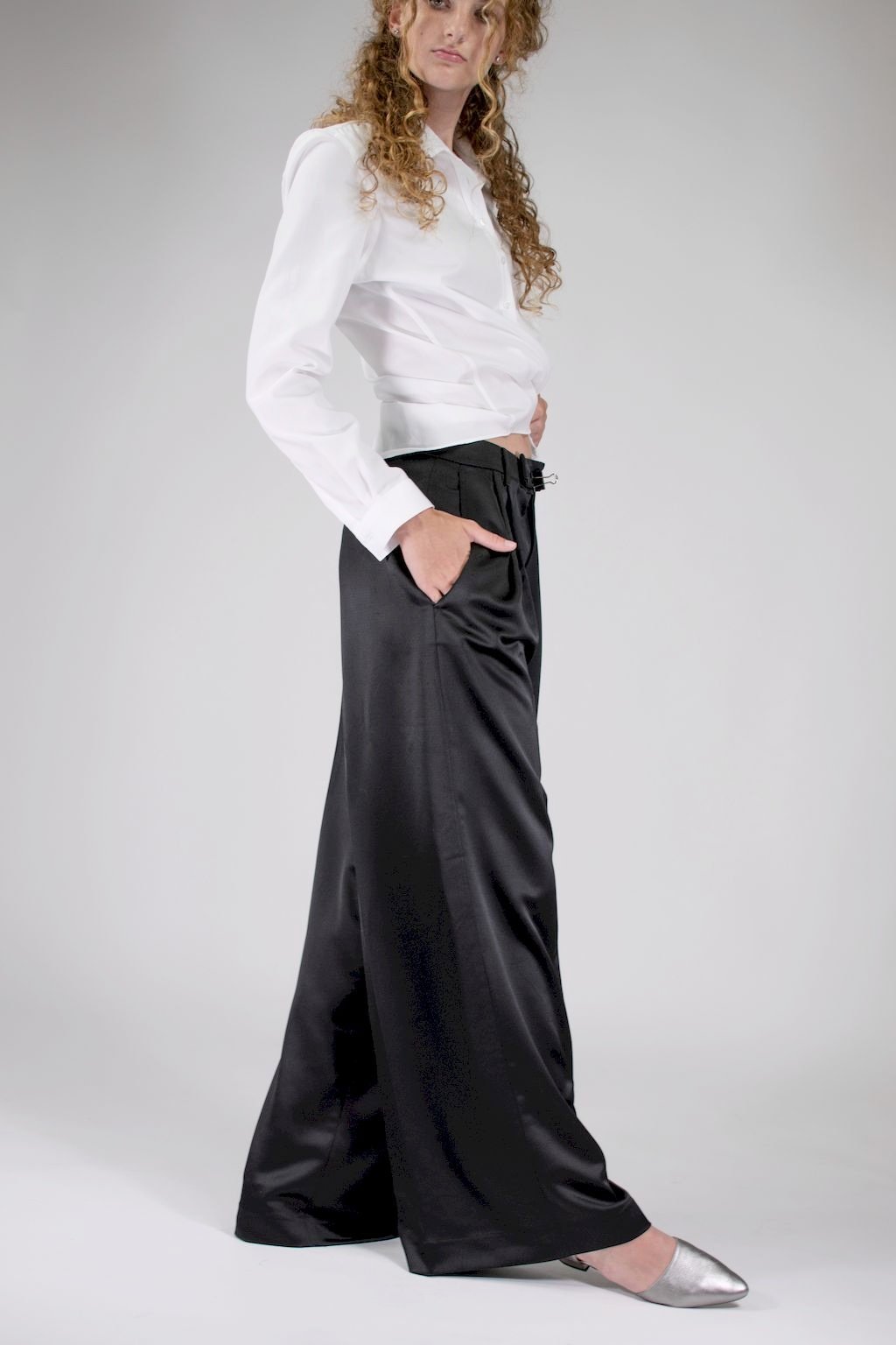 Dámské, široké, saténové kalhoty s hlubokým skladem, klasický pásek s poutky, na zip a knoflík. Přední díl s klínovými kapsami, další dvě kapsy jsou místěny na zadním díle kalhot.