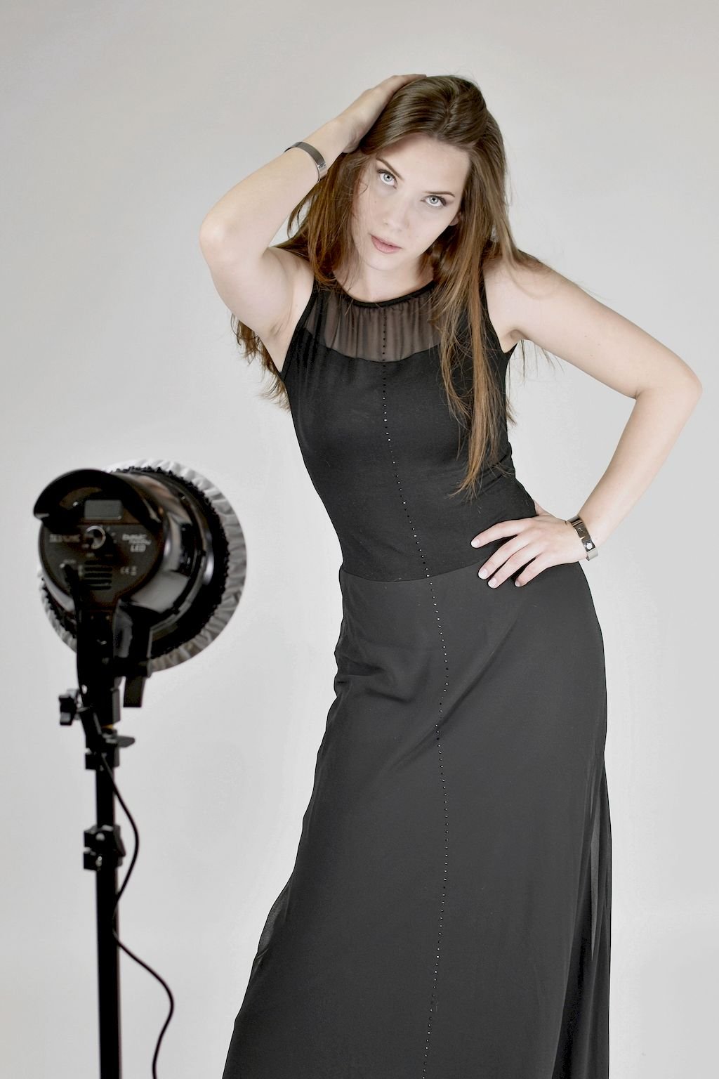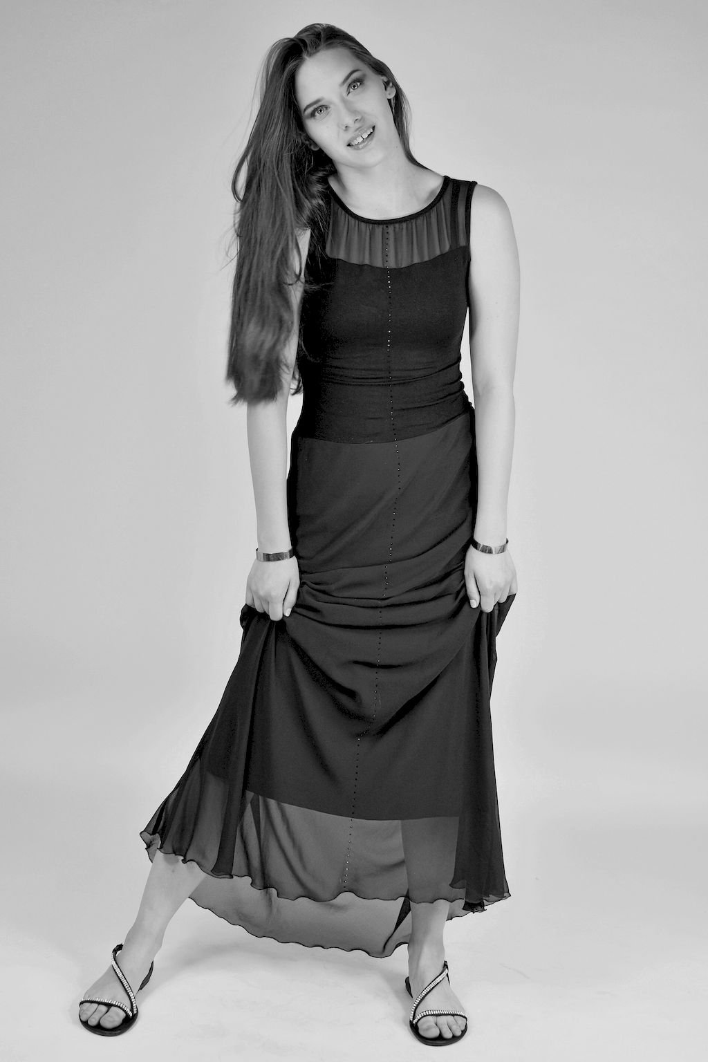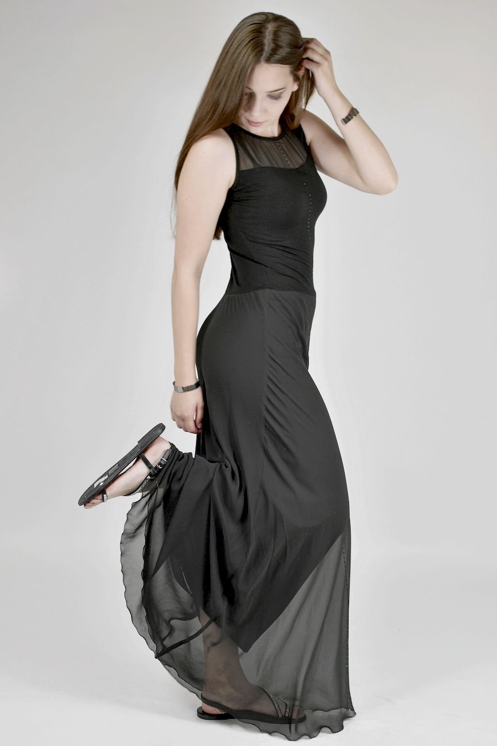 Dámské, večerní, dlouhé, dvouvrstvé, černé šaty z příjemného úpletu a šifónu s efektními linkami z broušených kamínků Swarovski.