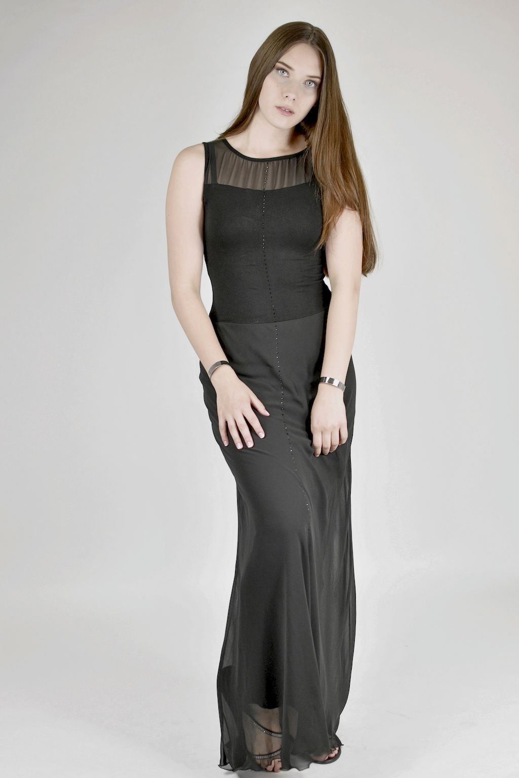 Večerní, společenské, dlouhé, černé šaty z příjemného úpletu a šifónu s efektními linkami z broušených kamínků. Živůtek šatů s efektním průsvitným sedlem.