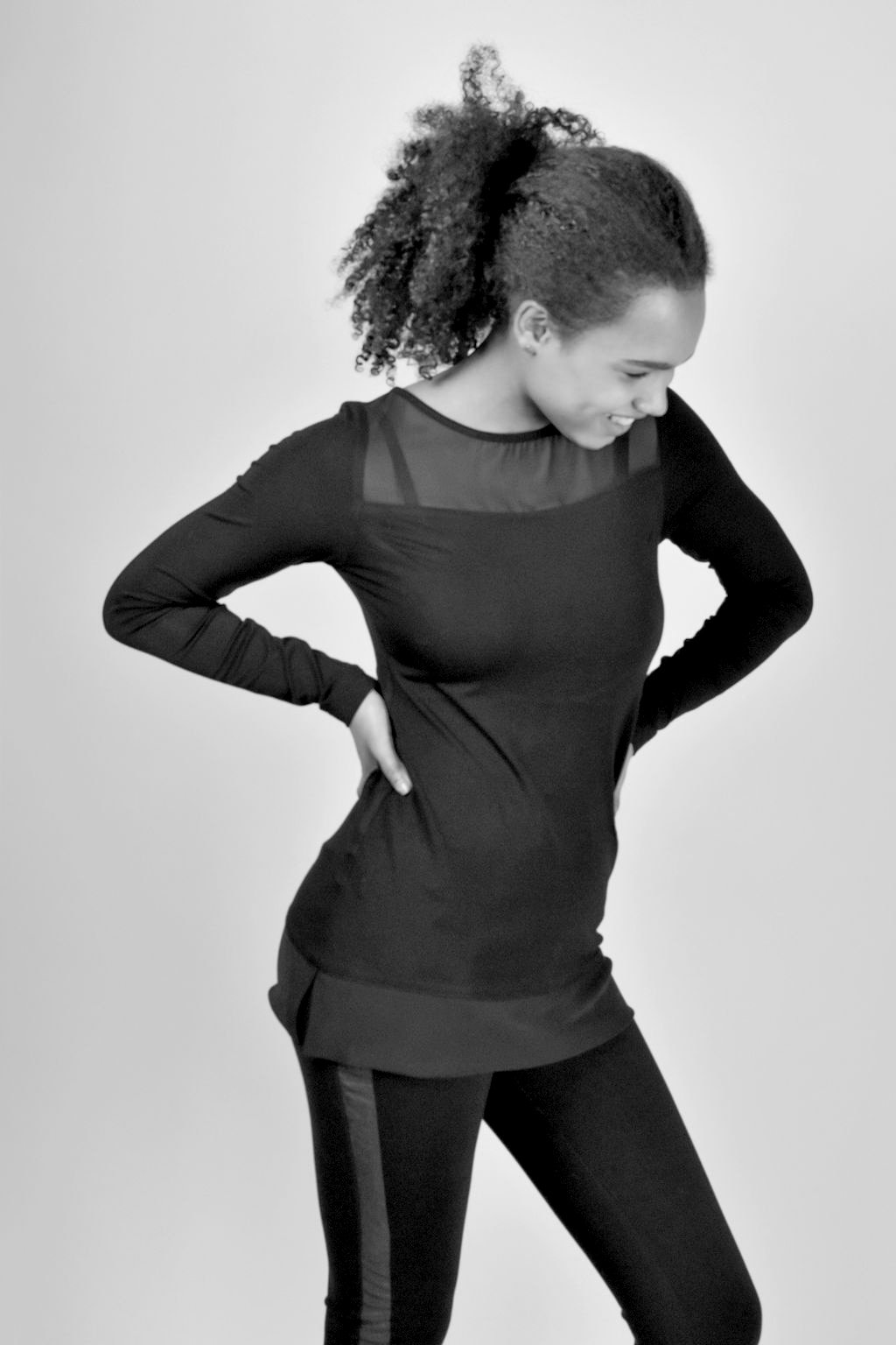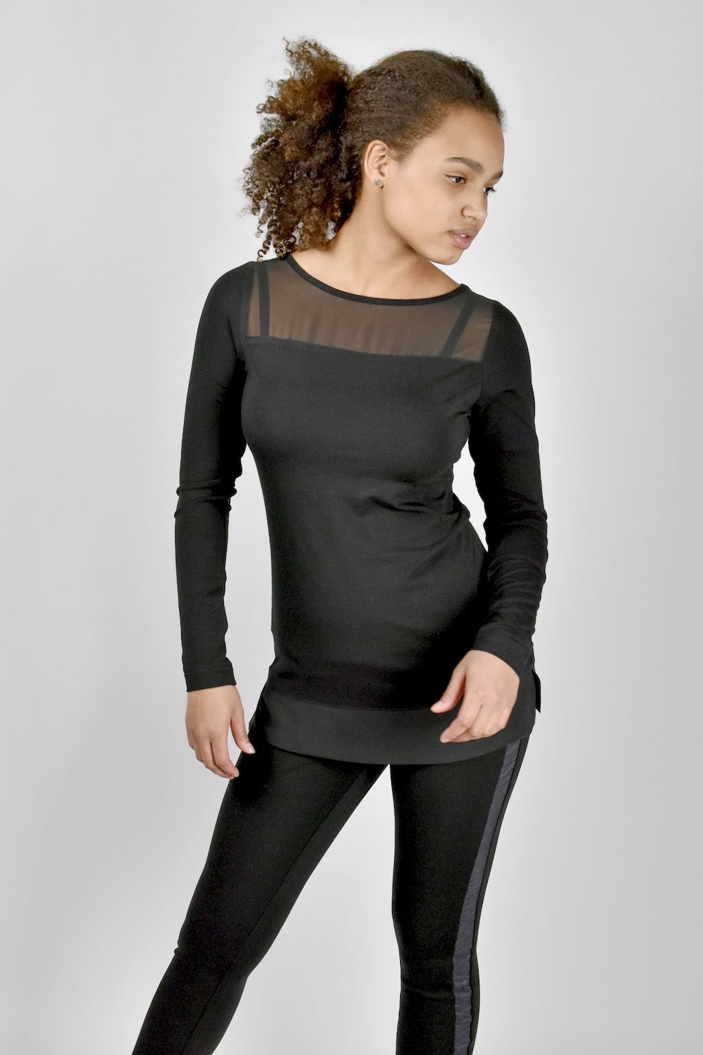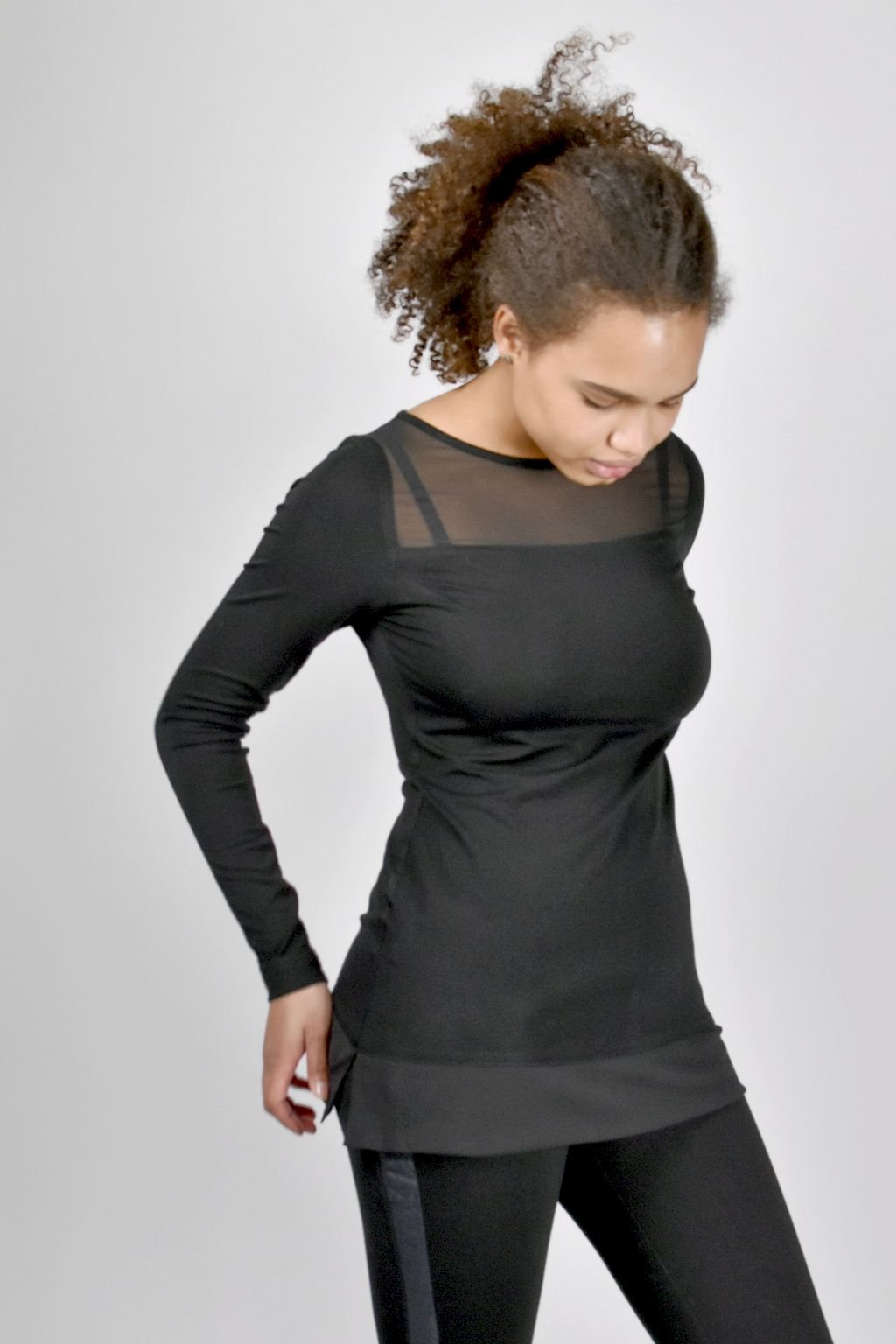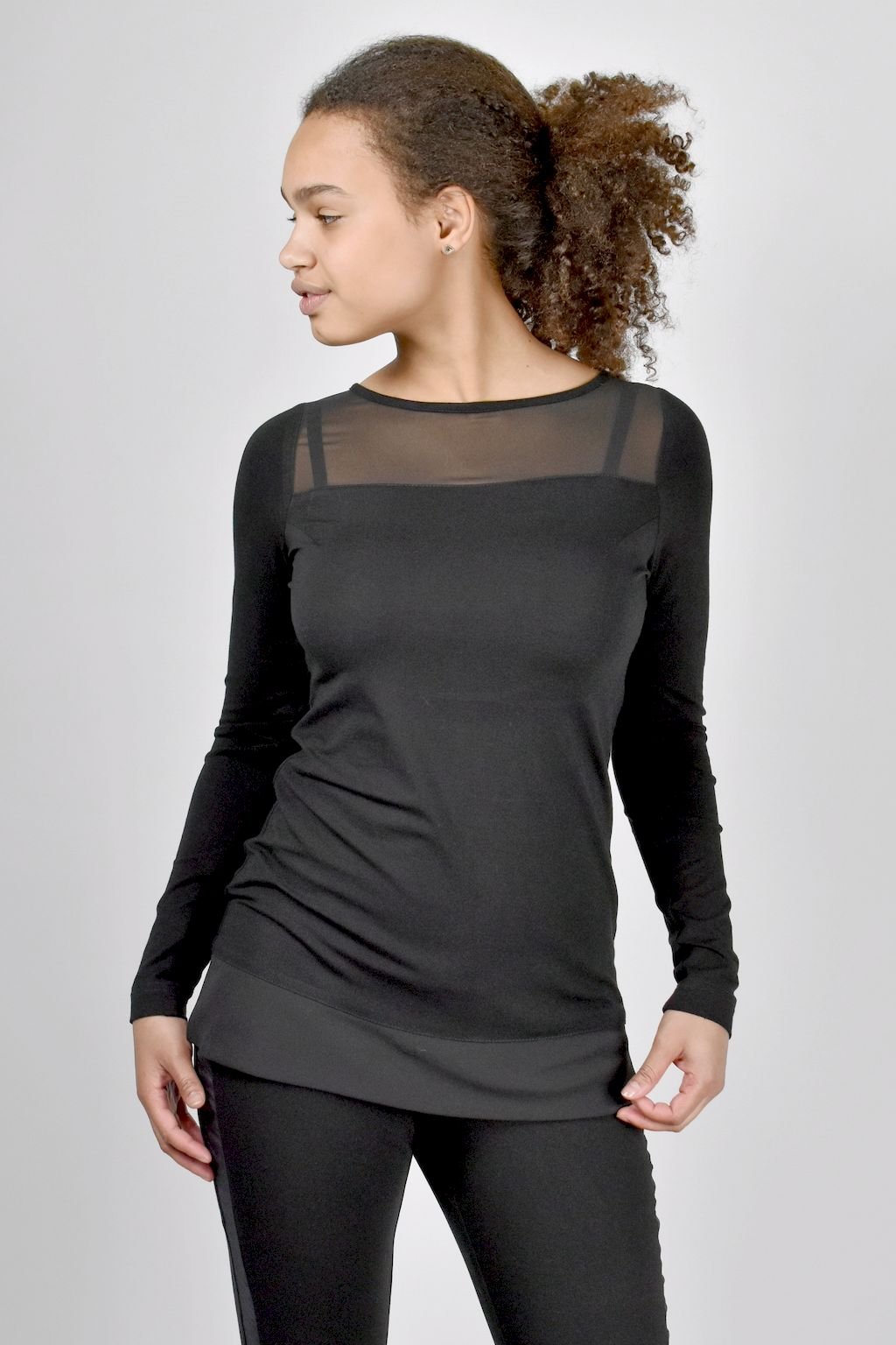 Dámský černý top s průsvitným, šifonovým sedlem, lemem na délce s rozparky a dlouhým rukávem. Velmi kvalitní materiál i profesionální zpracování.