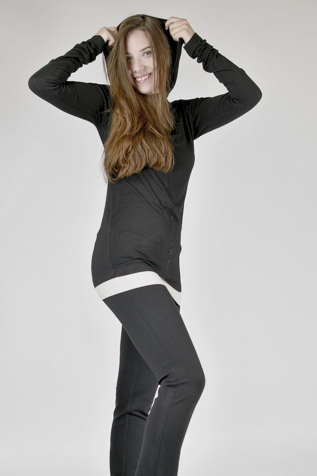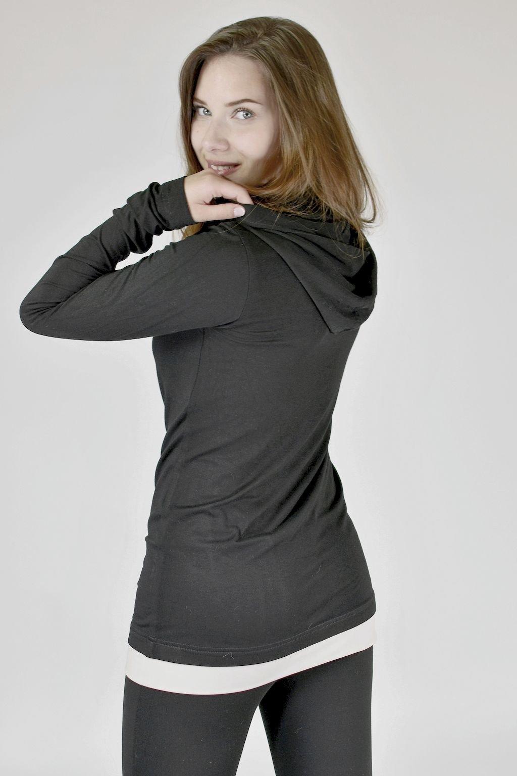 Dámské černé triko v prodloužené délce s kapucí, které lze nosit místo svetříku. Vyrobeno je ze speciálně upraveného materiálu, z opalovaného viskózového vlákna. Toto vlákno je extrémně odolné vůči oděru. A právě díky této vlastnosti si triko zachovává po dlouhý čas svůj luxusní vzhled. Je proto vhodné pro jakoukoliv příležitost, lze ho kombinovat v nekonečném počtu outfitů.