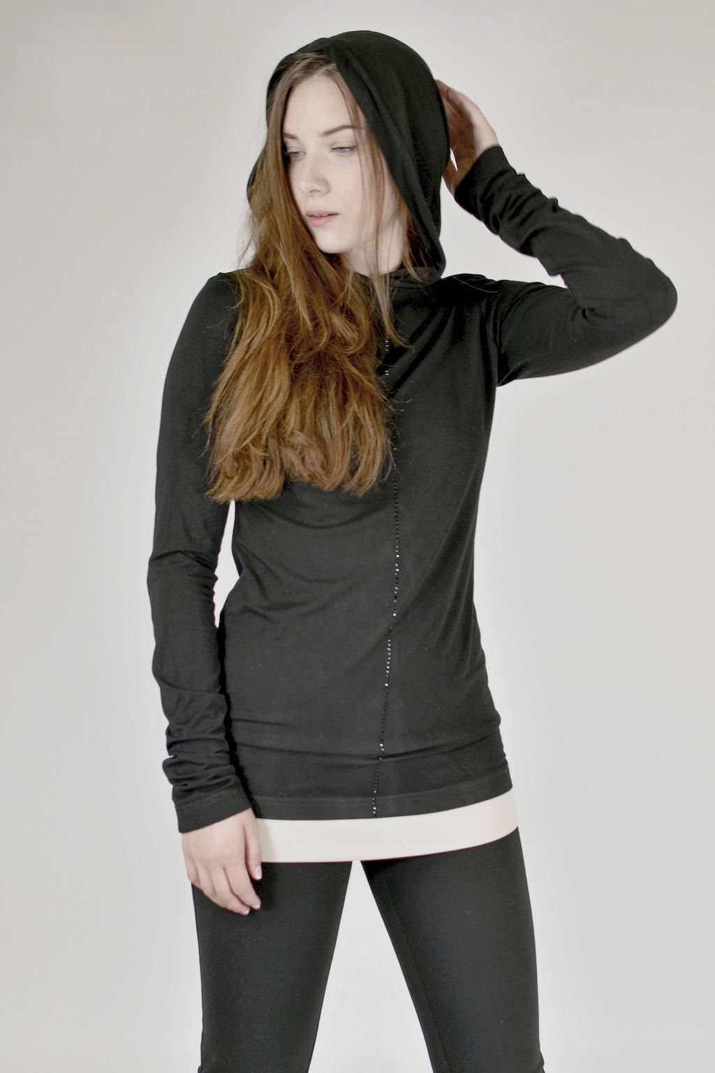 Dámské černé triko v prodloužené délce s kapucí, dlouhý rukáv, ozdobná linka z broušených kamínků, krémový lem kolem boků. Ideální k vrstvení na další tričko, místo svetříku. délka trička - 75cm, délka rukávu - 70cm