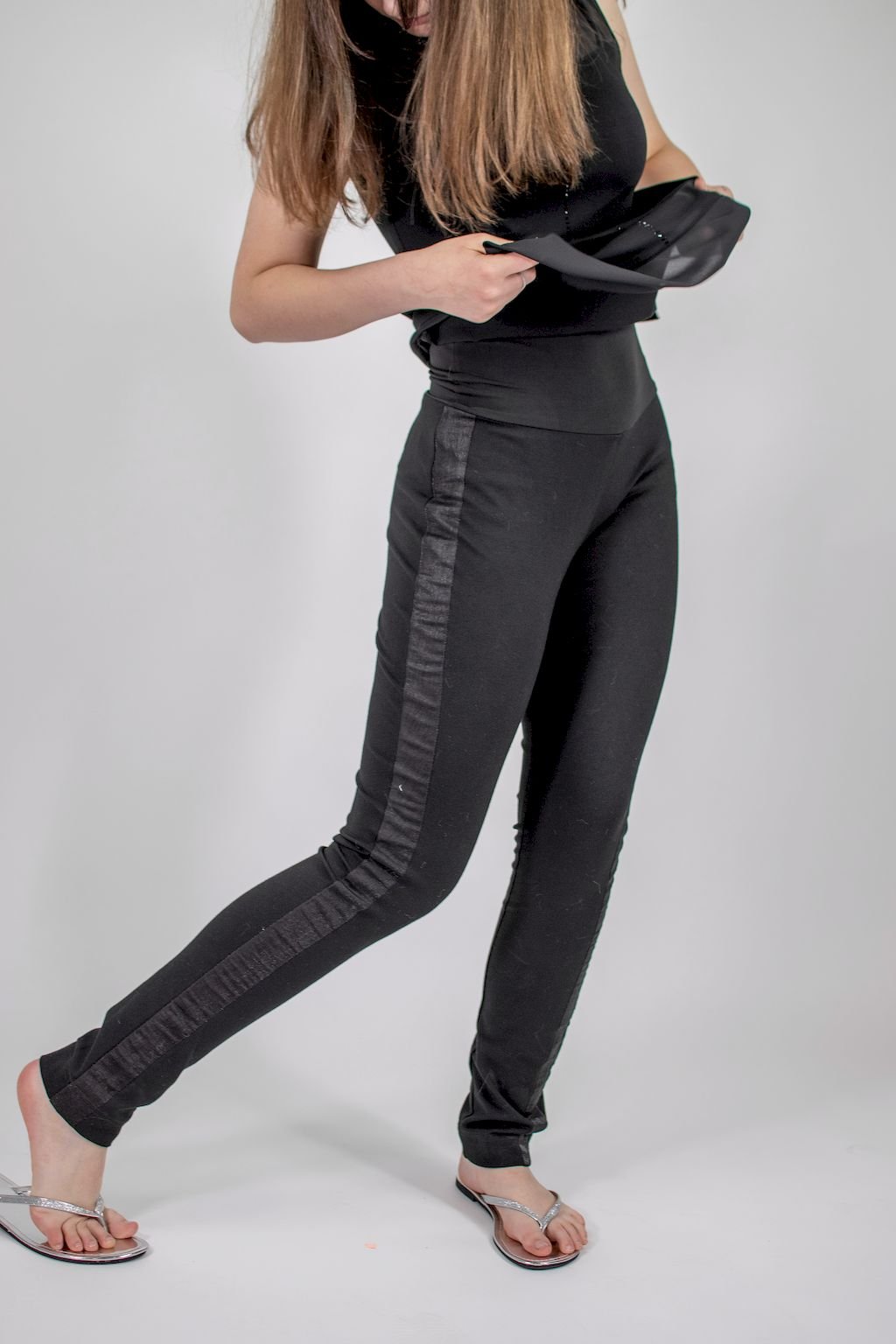 Dámské černé legínové kalhoty, na bocích ozdobené lichotivým, saténovým lemem, příjemný, pevný, úpletový materiál, pohodlný pružný pas.