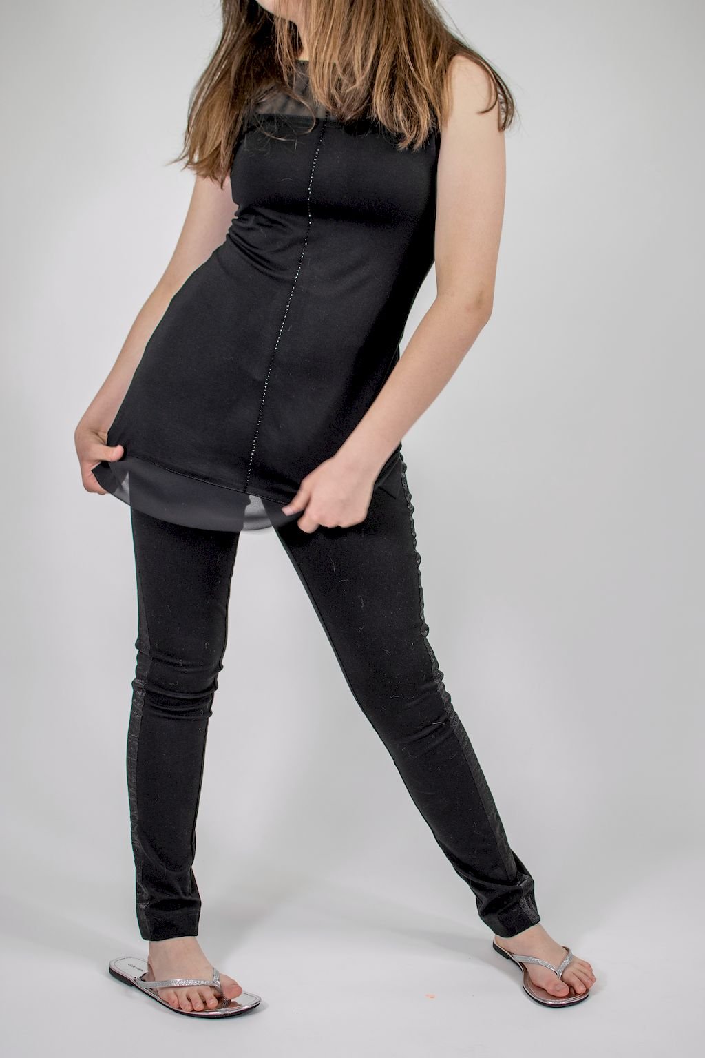 Dámské černé, úzké, legínové kalhoty, jsou vyrobeny ze speciálně upraveného materiálu, z opalovaného viskózového vlákna. Toto vlákno je extrémně odolné vůči oděru. A právě díky této vlastnosti si produkt zachovává po dlouhý čas svůj luxusní vzhled. Je proto vhodný pro jakoukoliv příležitost, lze ho kombinovat v nekonečném počtu outfitů.