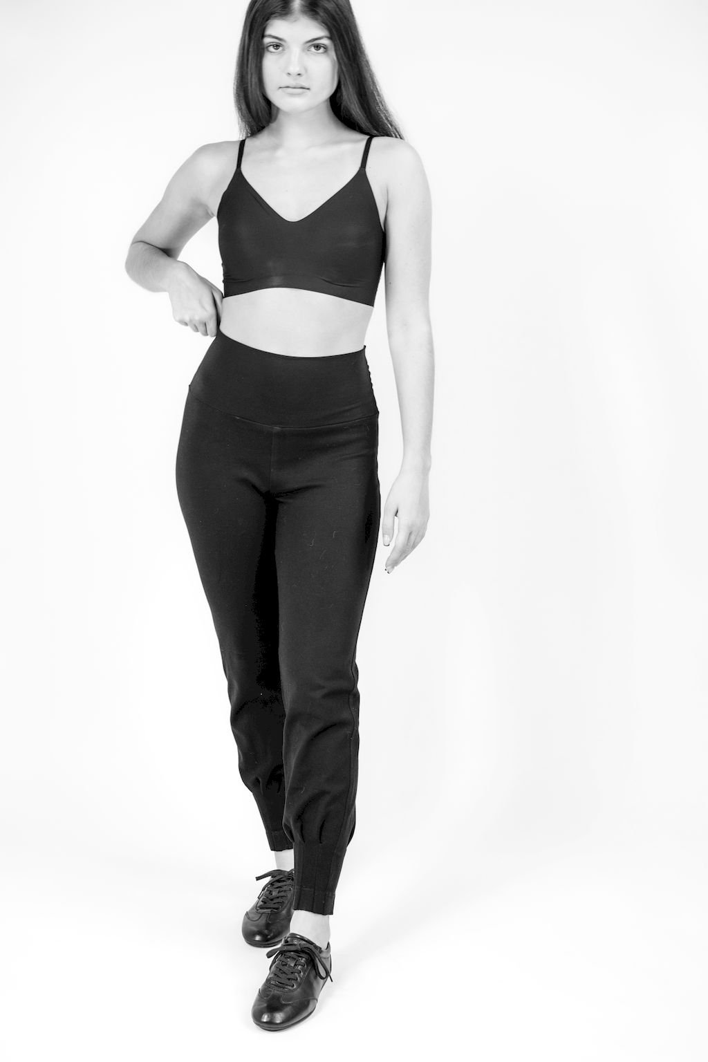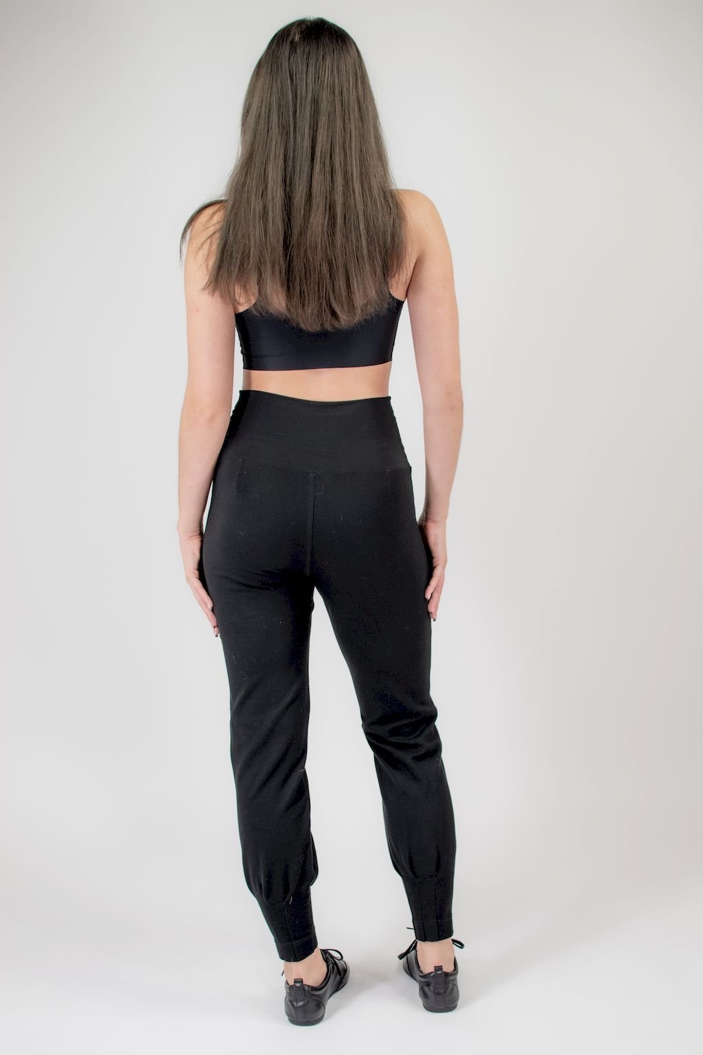 Dámské černé úpletové kalhoty, u kotníků zakončené efektní sámkovou manžetou, s pohodlným pružným pasem.