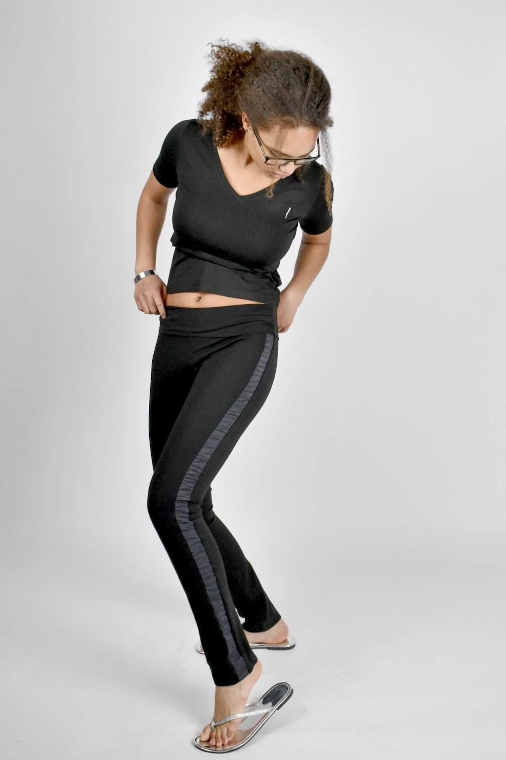 Dámské, černé kalhoty úzkého, legínového střihu s ozdobným lampasem na bocích, který opticky zeštíhlí vaší postavu. Vyrobené jsou z pevného úpletového materiálu s pohodlným pružným pasem.