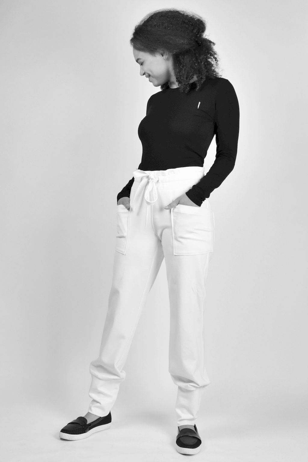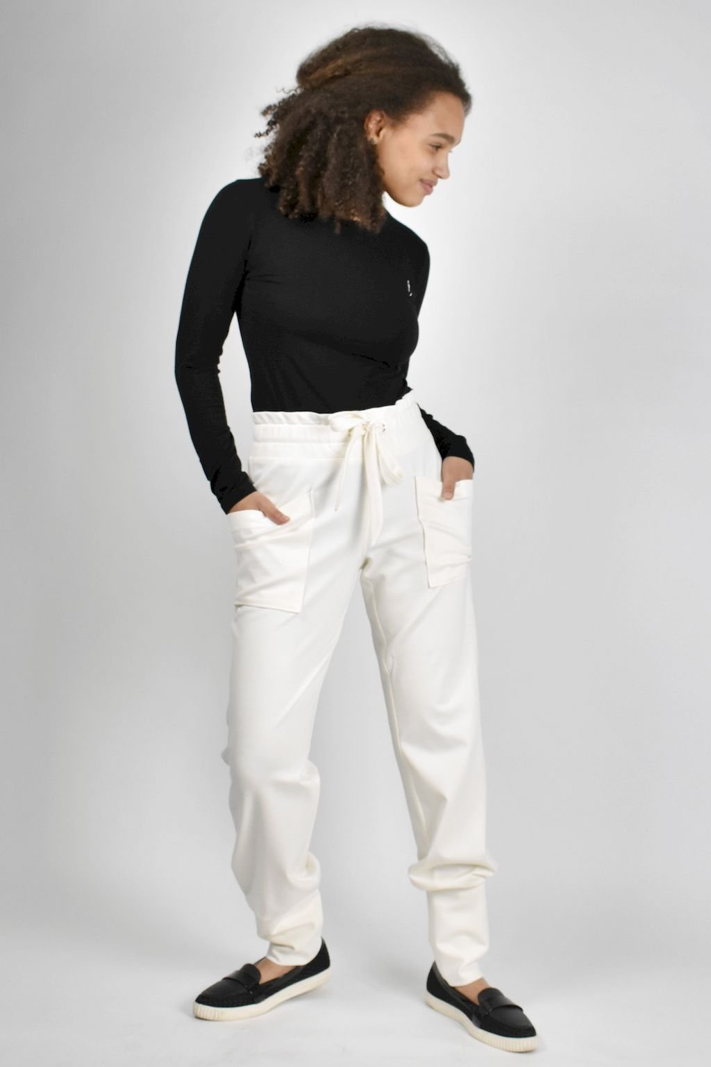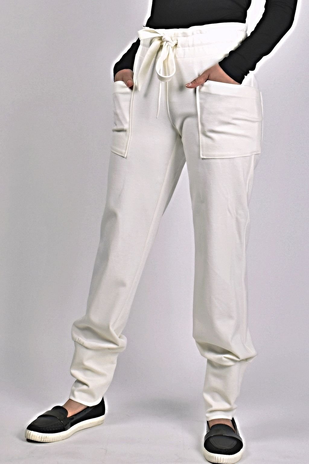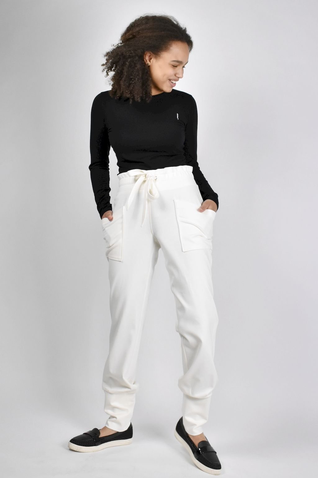 Dámské, úpletové kalhoty s vyšším pasem na stažení, zajímavou vysokou manžetou v délce kalhot, pomocí které si můžete pohodlně korigovat jejich délku. Nakládané kapsy, originální provedení.