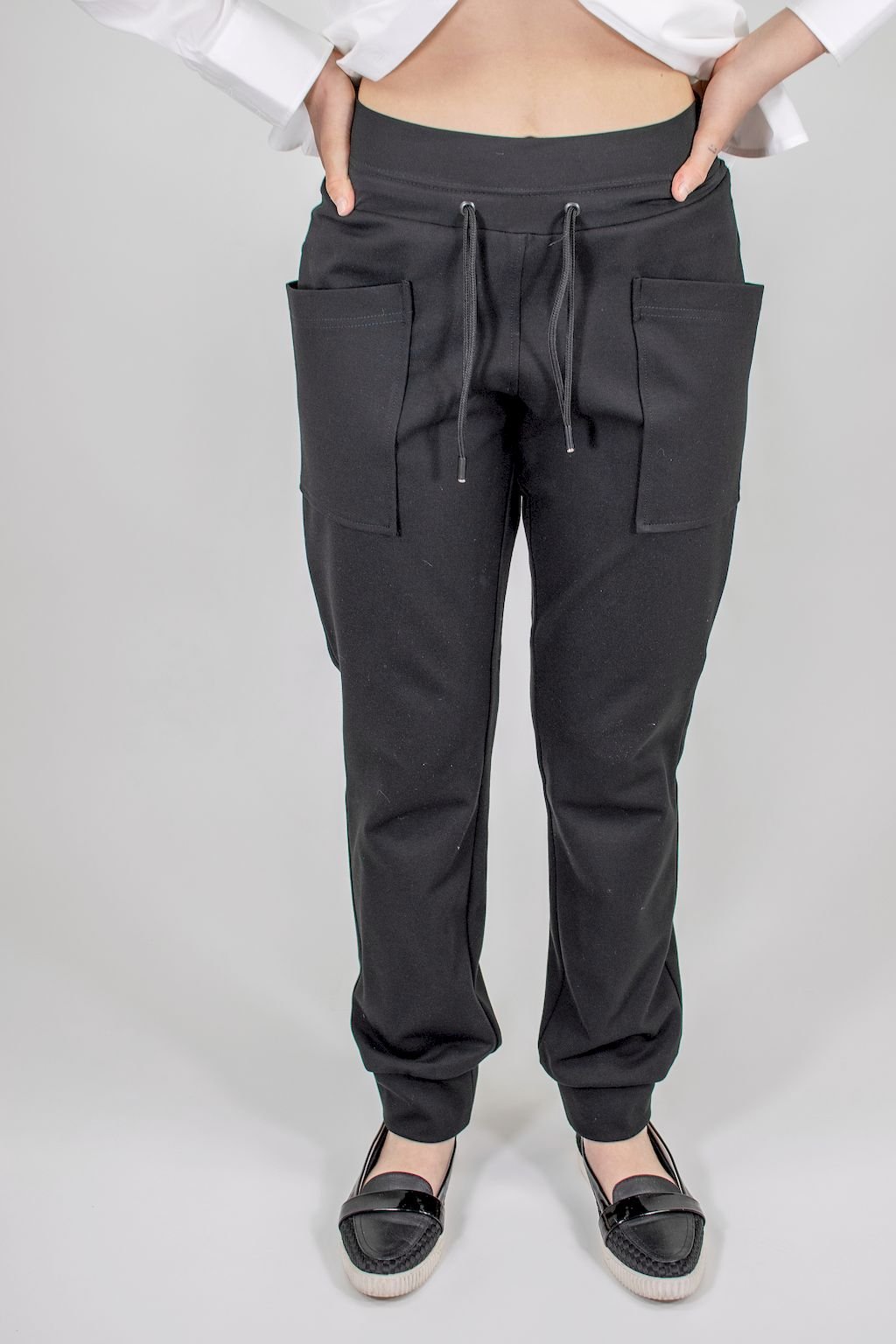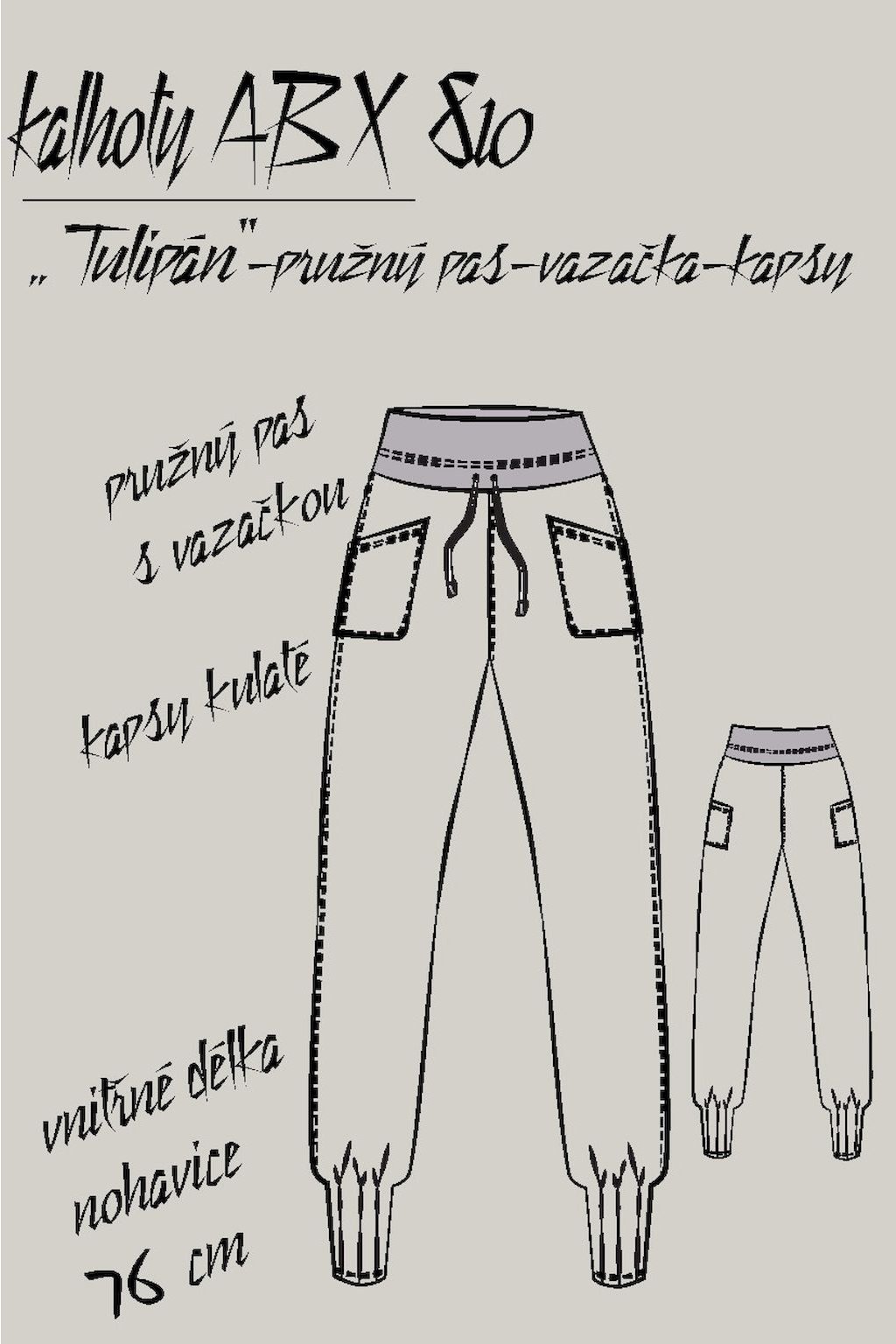 Dámské úpletové kalhoty ,,Tulipán'' u kotníků zakončené efektní sámkovou manžetou, v pase do pohodlného nápletu s vazačkou, na bocích velké nakládané kapsy.