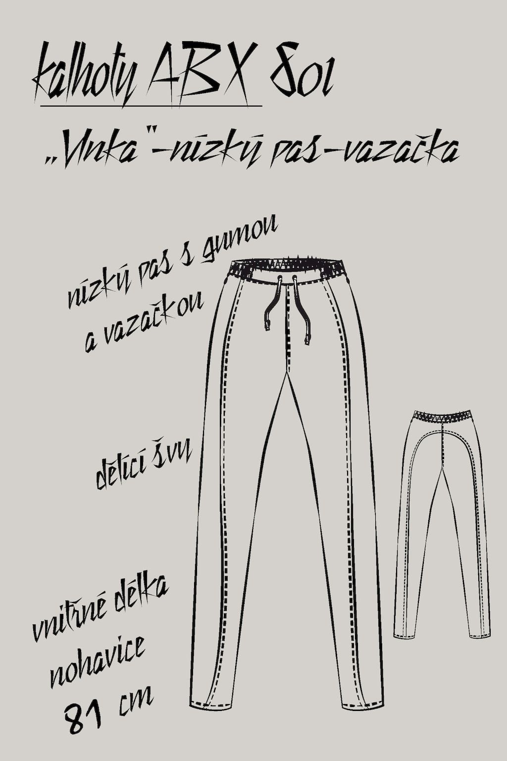 Dámské úpletové kalhoty ,,Vlnka'' úzkého třídílného střihu s nízkým pasem do gumy s vazačkou, který se dle potřeby přizpůsobí vašemu pasu, lichotivý, ozdobný, členící šev, vaší postavu opticky zeštíhlí.