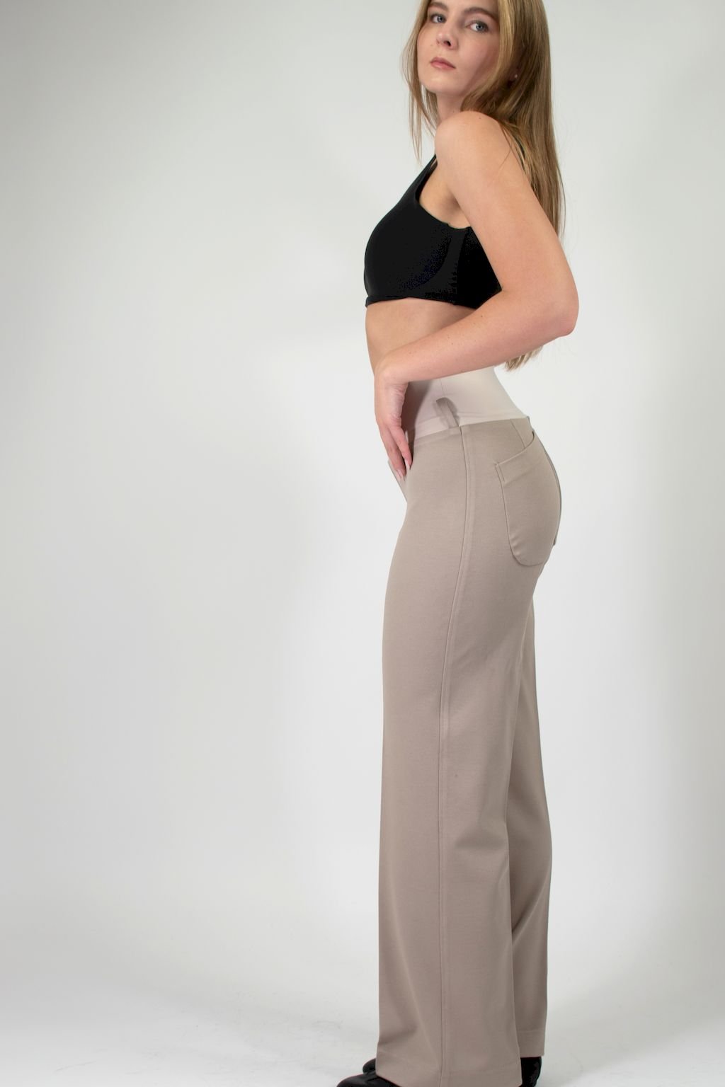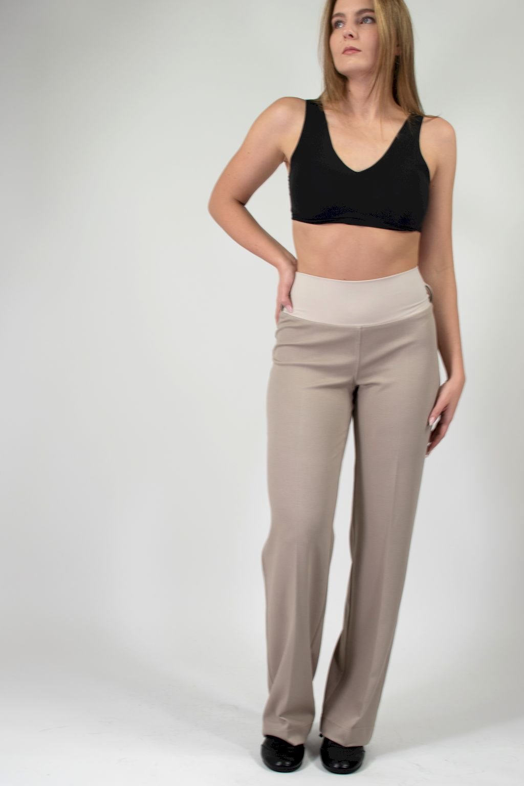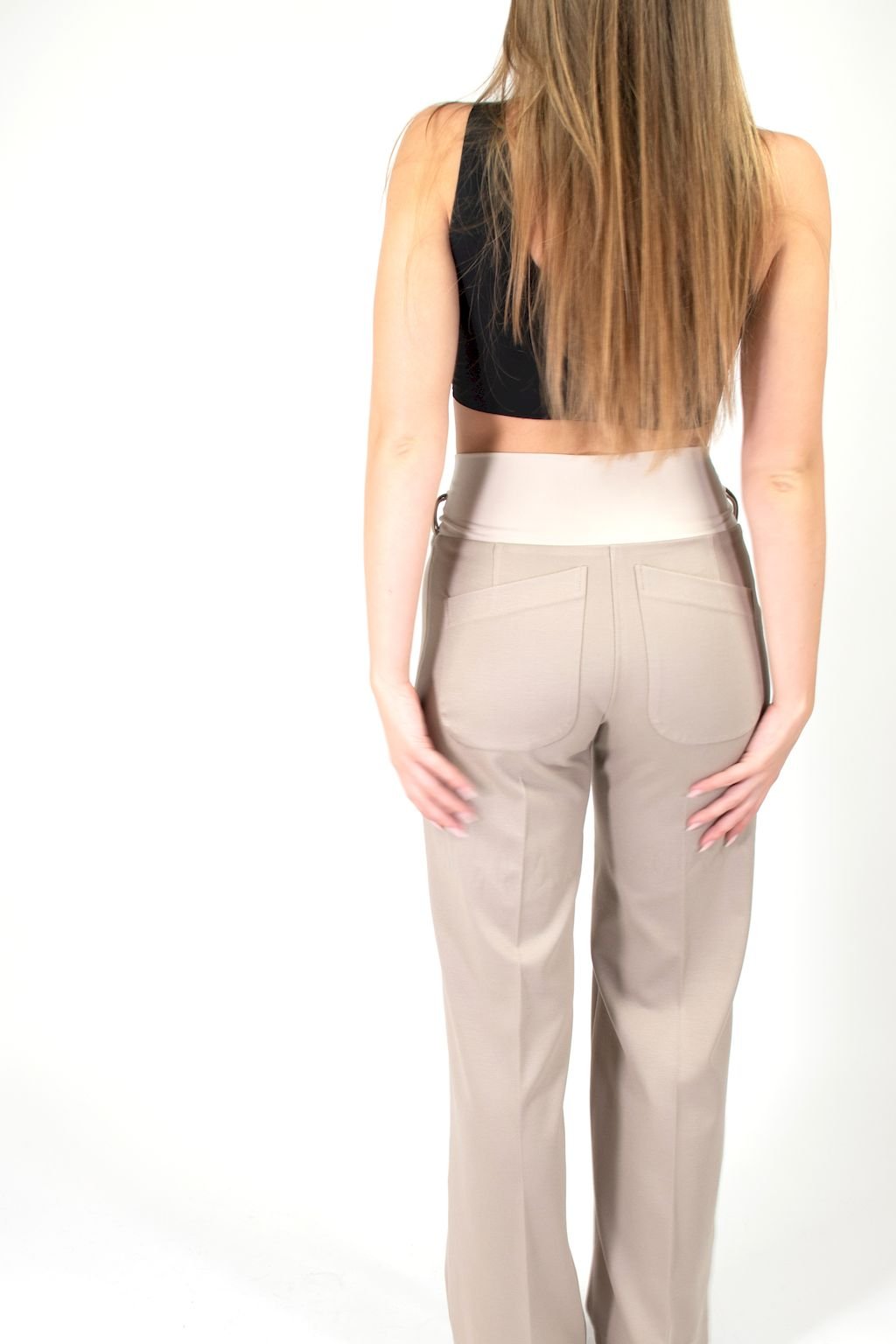 DÁMSKÉ ŠIROKÉ BÉŽOVÉ KALHOTY S PRUŽNÝM PASEM A KAPSAMI