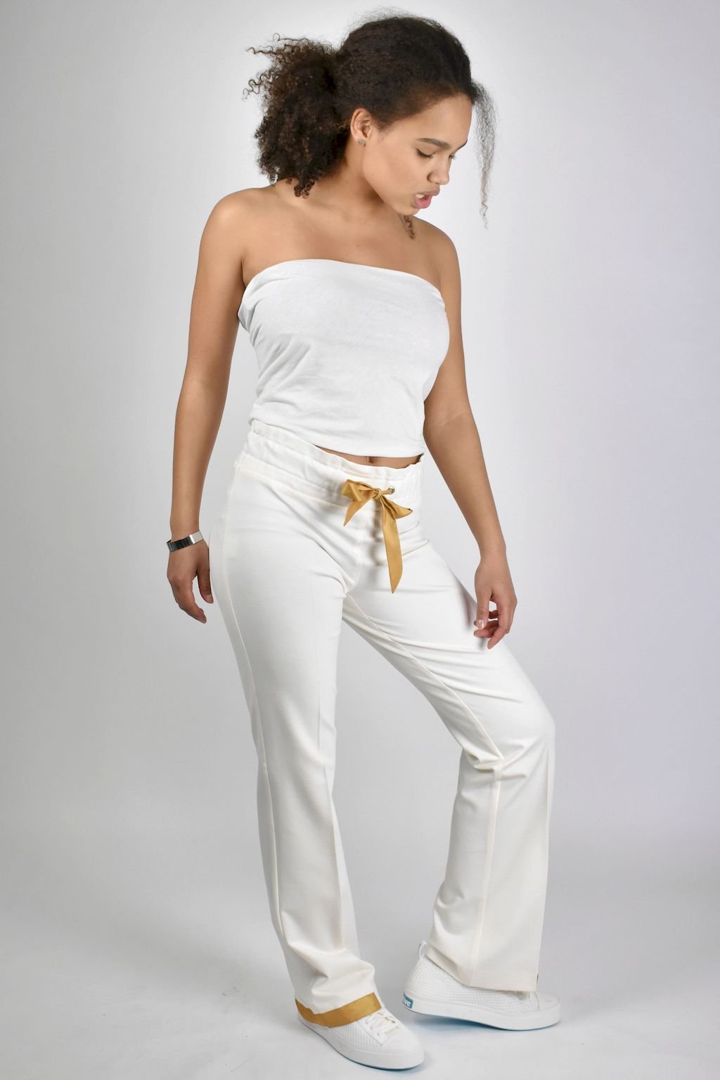 Dámské, smetanové kalhoty rovného střihu, vysokým pasem s vazačkou a barevnou vsadkou na délce.
