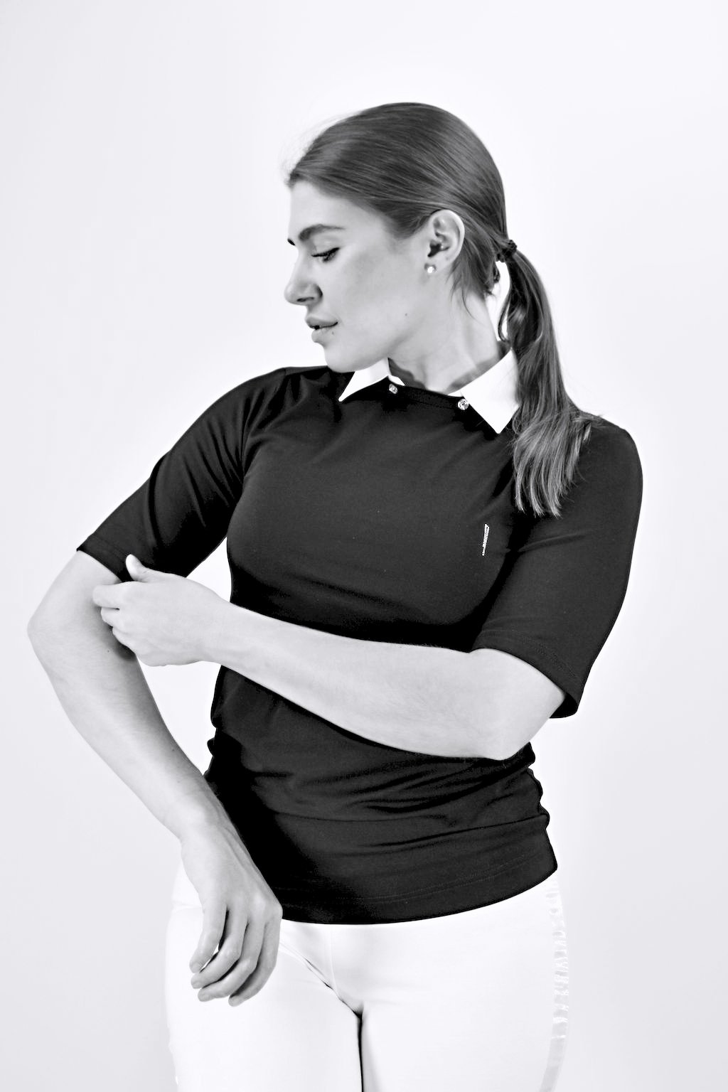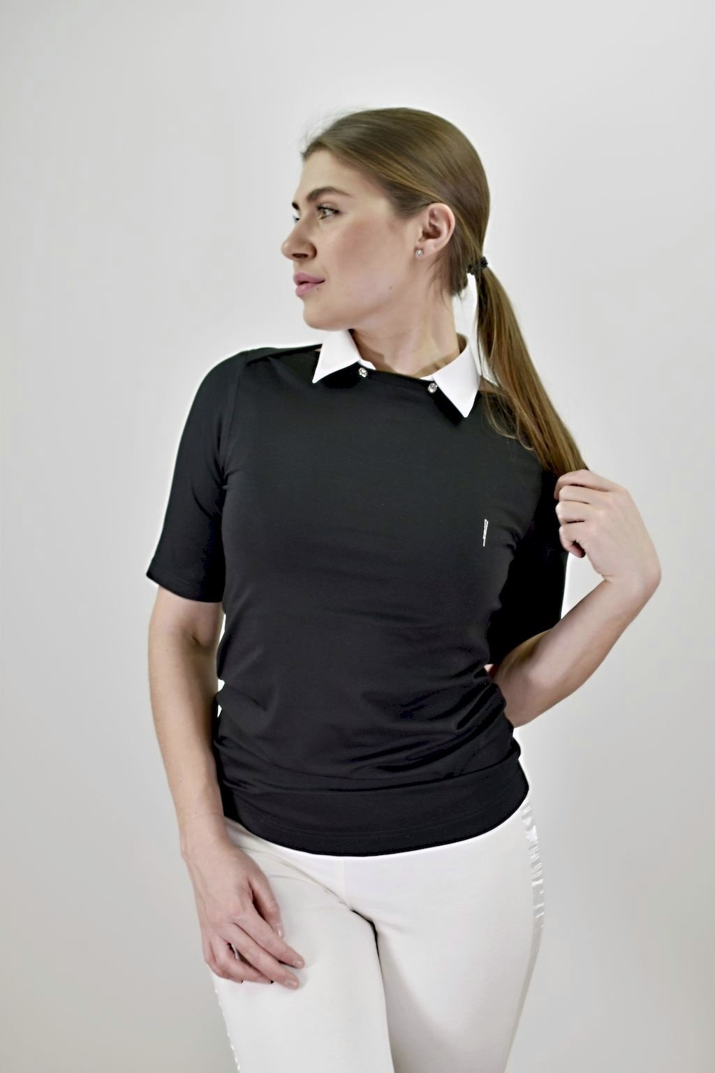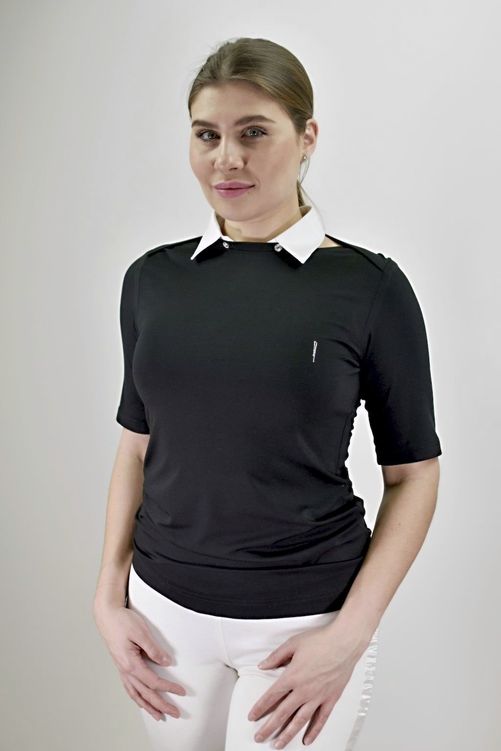 Černé triko s přívlastkem ,,věčné'' s netradičně zpracovaným lodičkovým výstřihem a rukávem k lokti, vylepšené o bílý odepínací košilový límeček, které povýší jeho vzhled na ,,elegantní''. Triko si po dlouhý čas zachovává svůj původní vzhled, vypadá tak stále "jako nové".