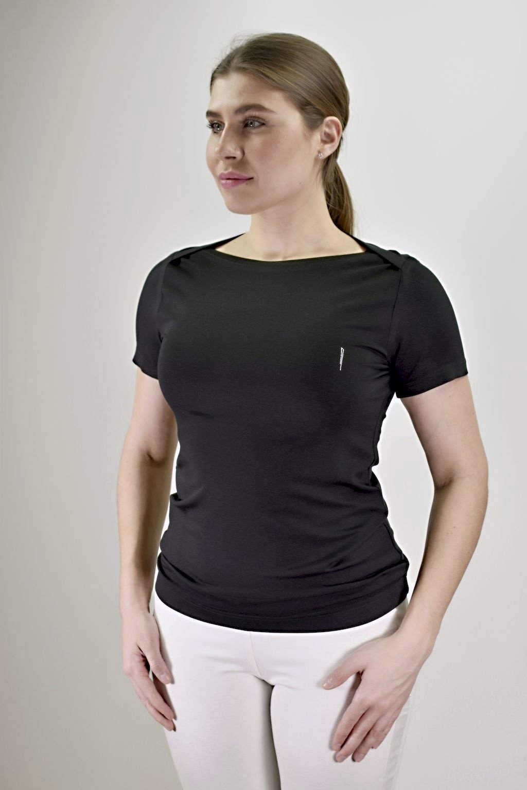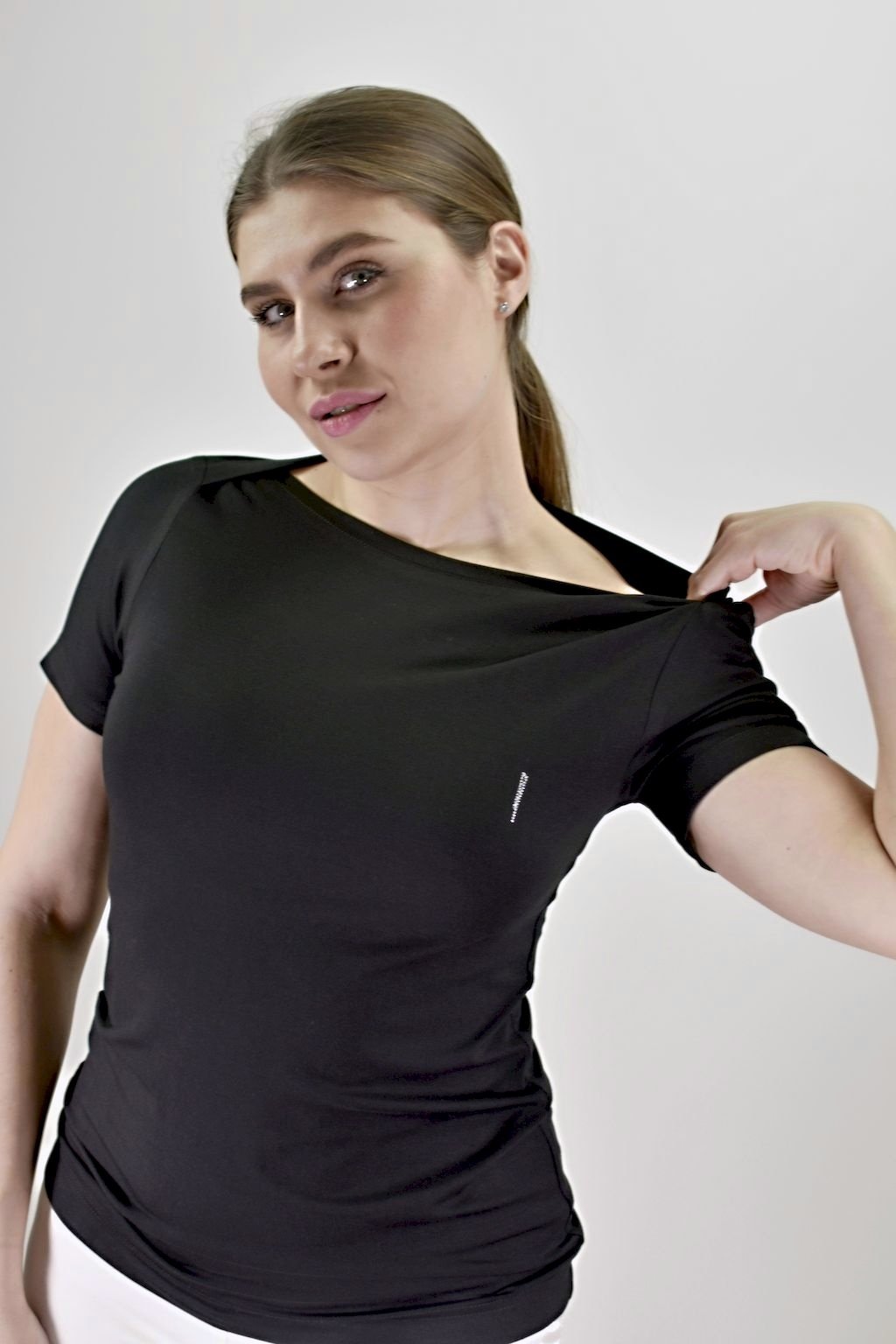 Černé "věčné" triko s netradičně zpracovaným lodičkovým výstřihem a krátkým rukávem. Velmi kvalitní, odolný a příjemný materiál, díky kterému si triko po dlouhý čas zachovává svůj původní vzhled a vypadá tak stále "jako nové".