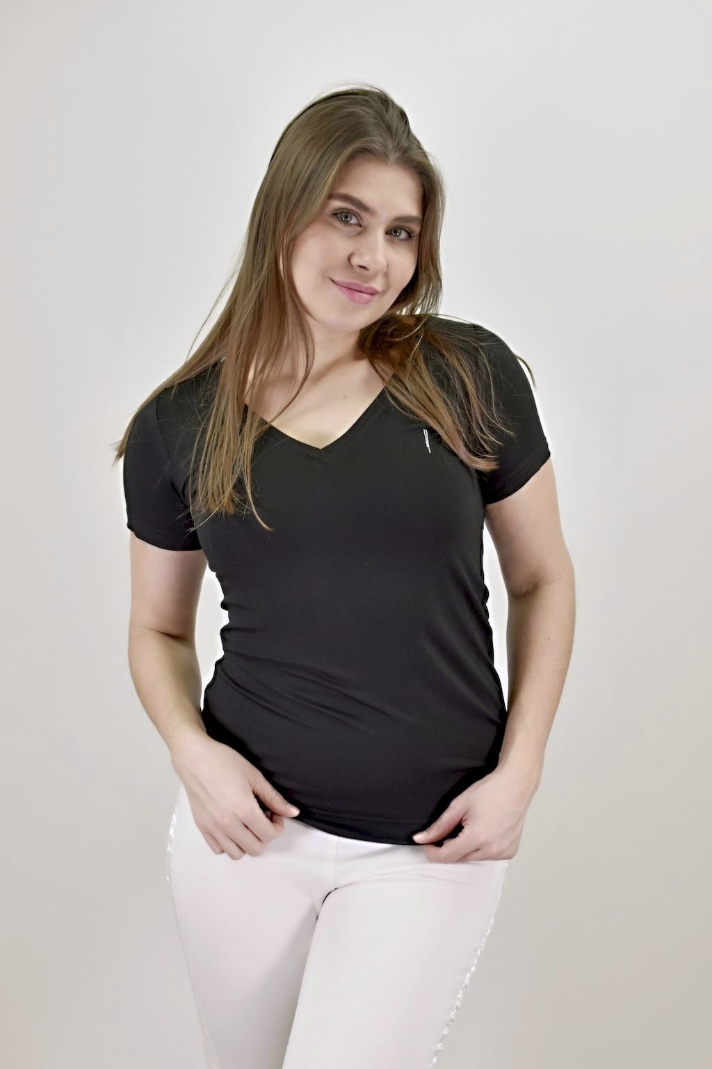 Dámské, černé, klasické triko s přívlastkem "věčné" s véčkovým výstřihem a krátkým rukávem. Velmi kvalitní, odolný a příjemný materiál, triko po dlouhý čas zachovává svůj původní vzhled, vypadá tak stále "jako nové".