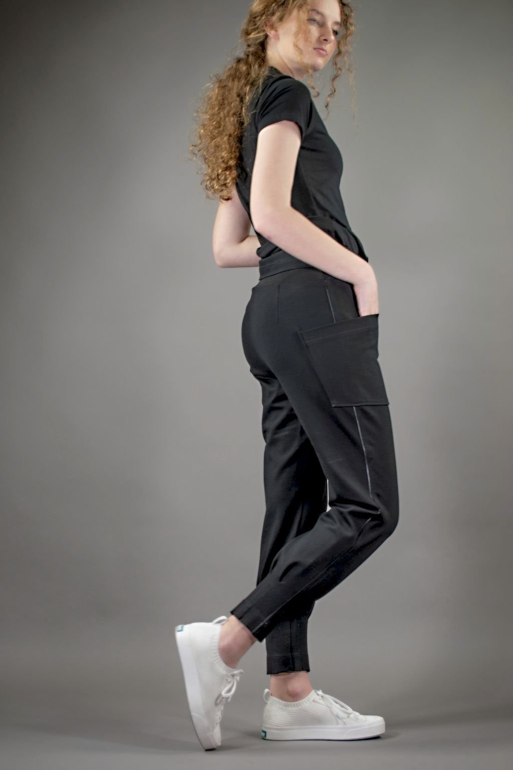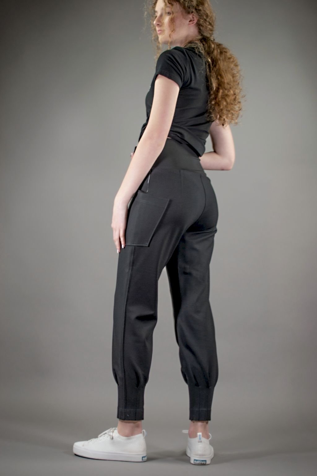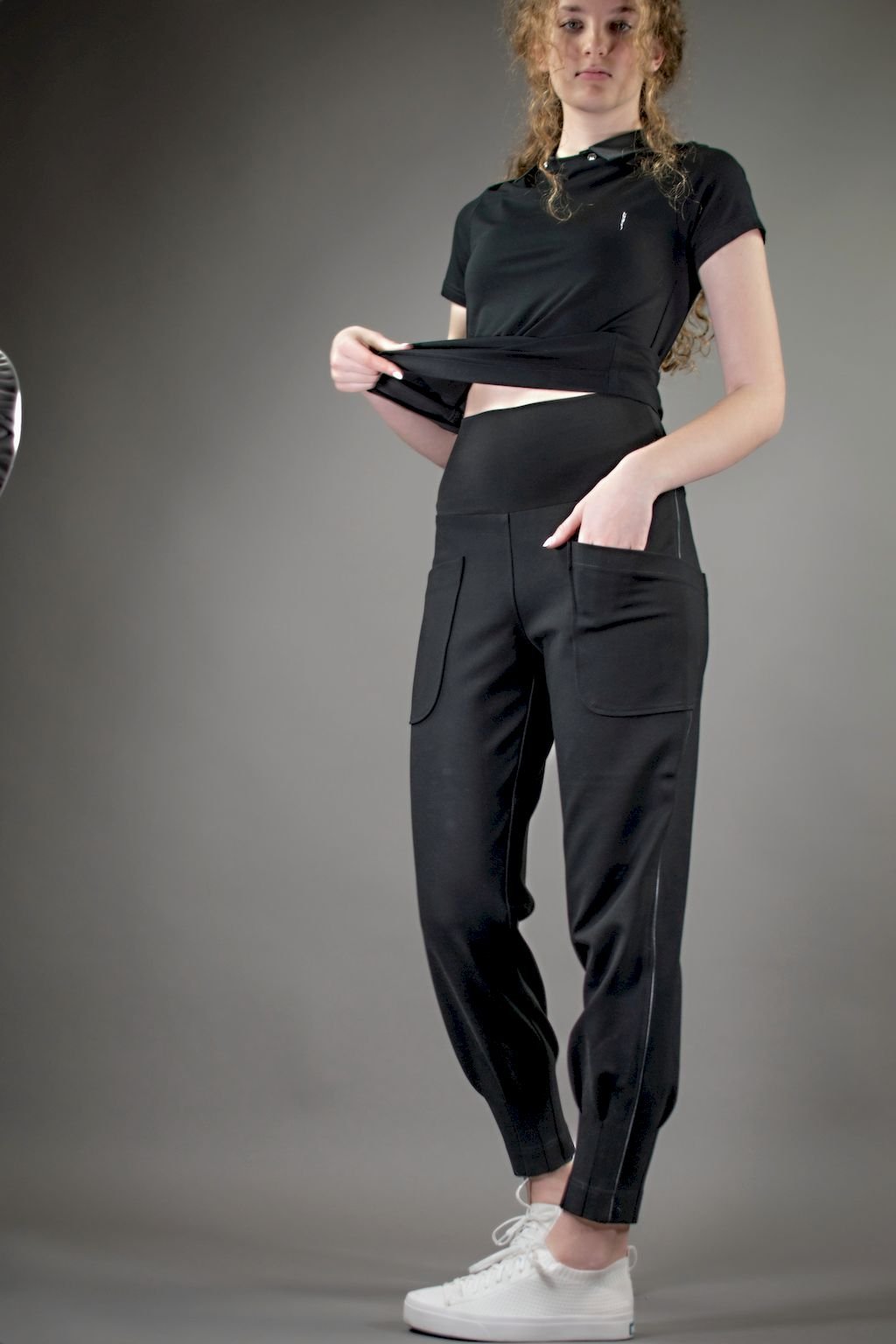 KALHOTY ČERNÉ PRUŽNÝ PAS VELKÉ KAPSY SÁMKOVÁ MANŽETA