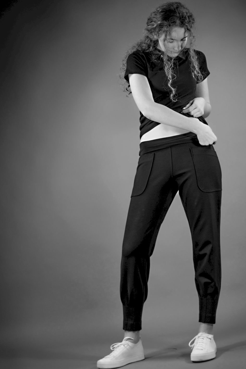 Dámské úpletové kalhoty, velké nakládané kapsy, ozdobný tenký lesklý proužek na bocích nohavic, délka zakončená efektní sámkovou manžetou, v pase do vysokého ohrnovacího pohodlného nápletu.
