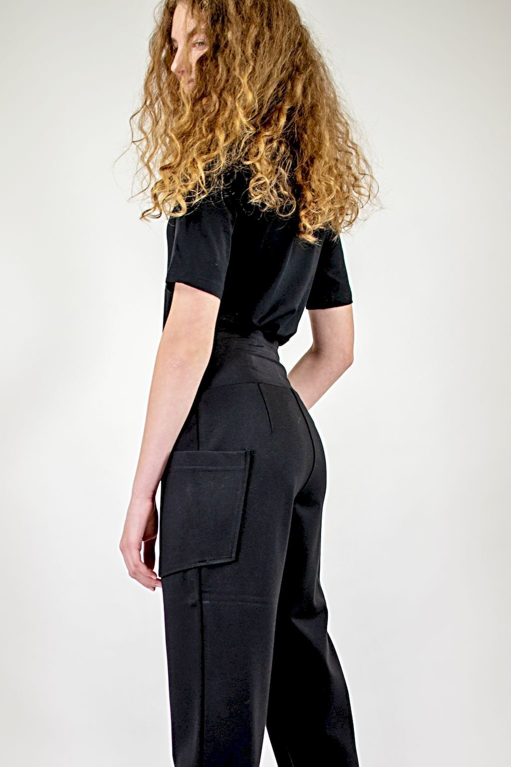 Dámské černé úpletové kalhoty s vysokou variabilní manžetou na nohavici, v pase do vysokého pohodlného nápletu, na bocích velké nakládané kapsy.