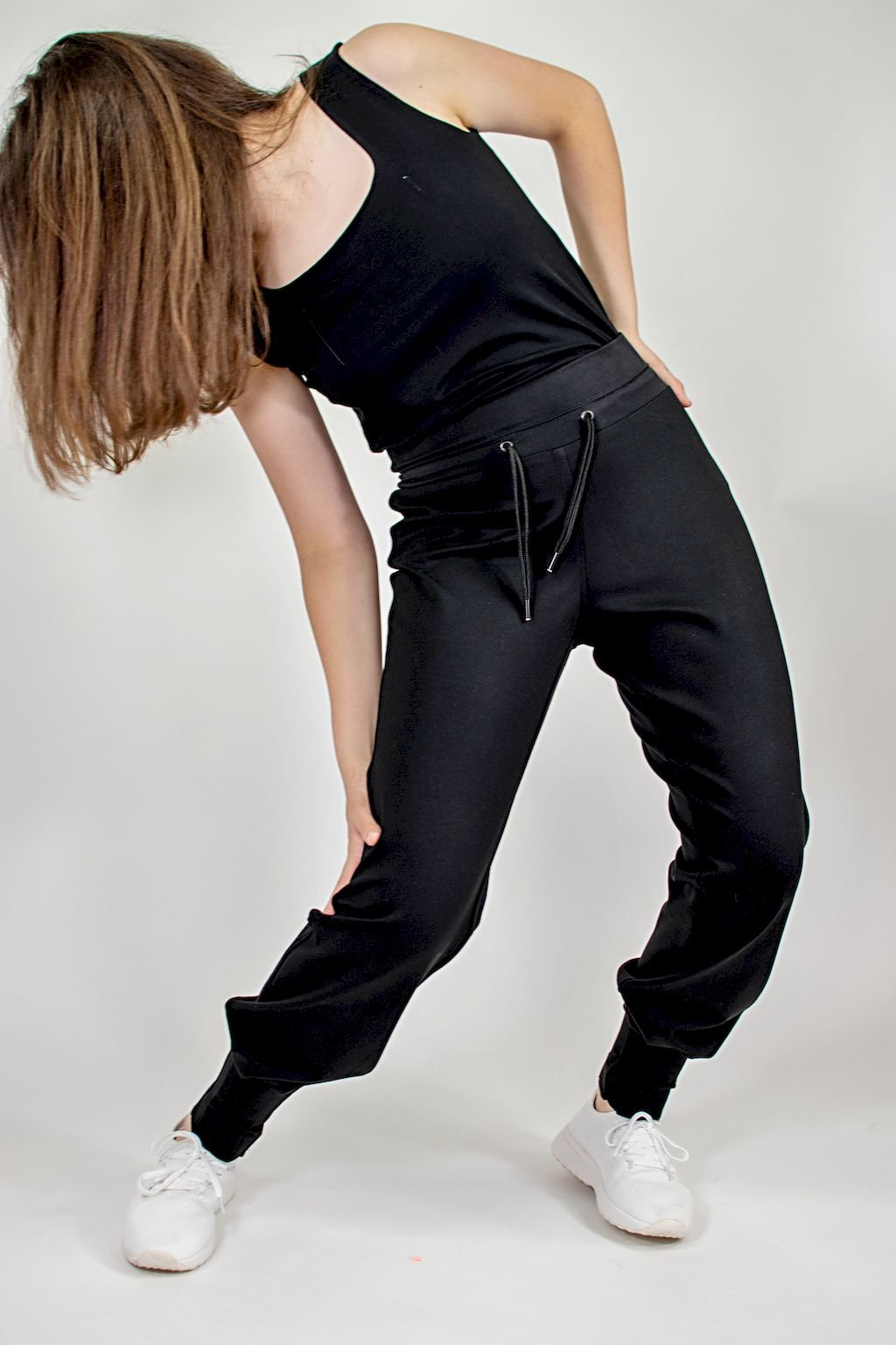 Dámské úpletové kalhoty ,,Tulipán'' do efektní sámkové manžety, v pase do nápletu s vazačkou, bez kapes.