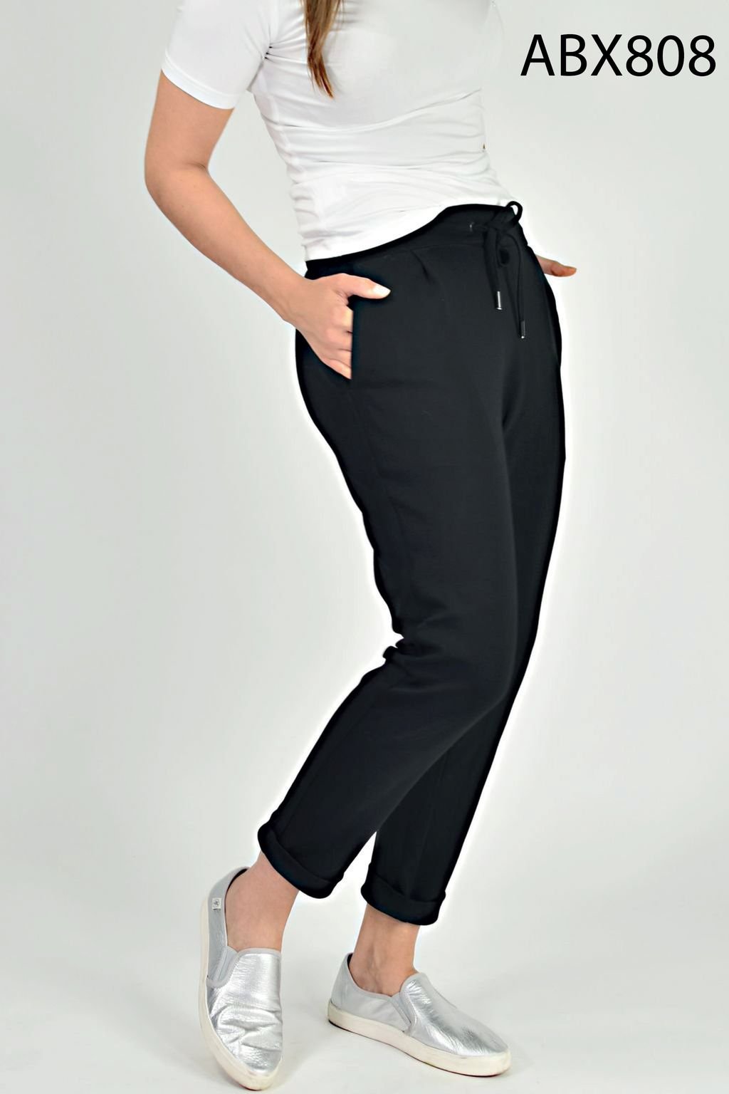 Dámské černé kalhoty, dokonalý, velmi ženský střih, boční kapsy, elastický pas do gumy s vazačkou na stažení.