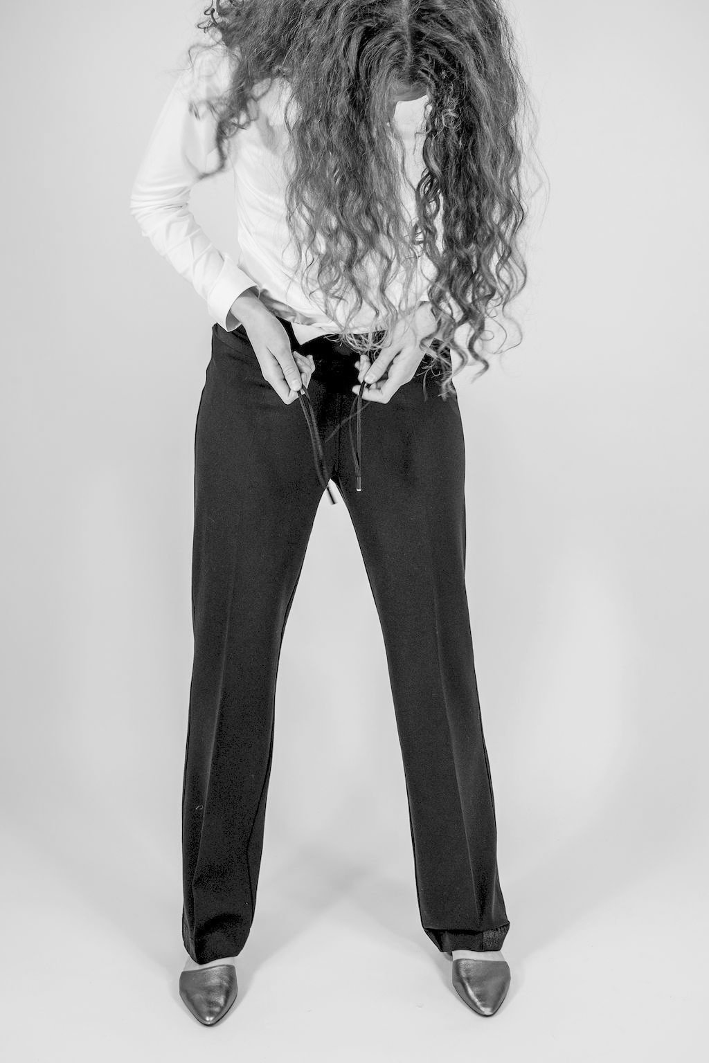 KLASICKÉ ROVNÉ KALHOTY Z PEVNÉHO ÚPLETU S PRUŽNÝM PASEM A VAZAČKOU