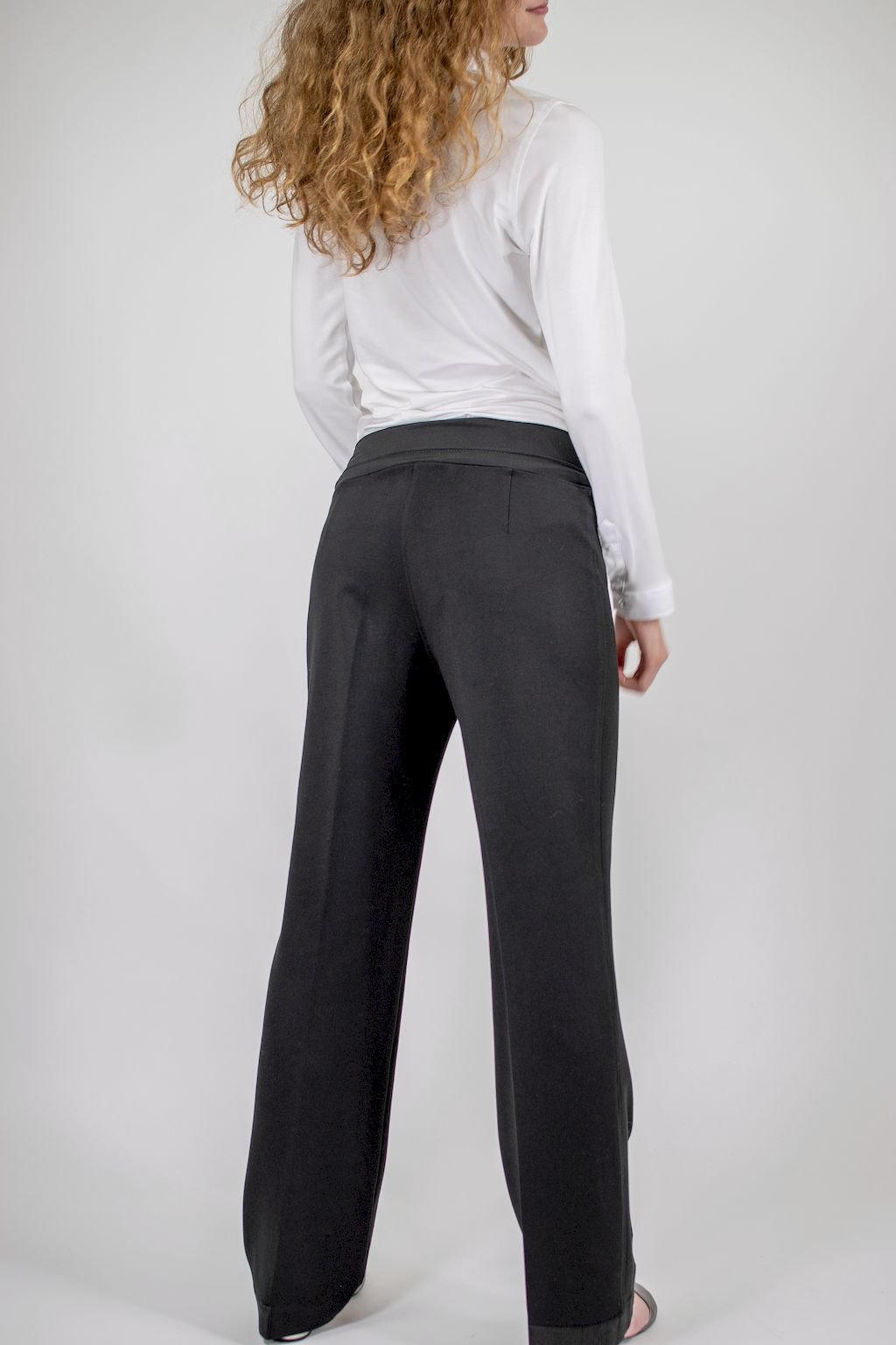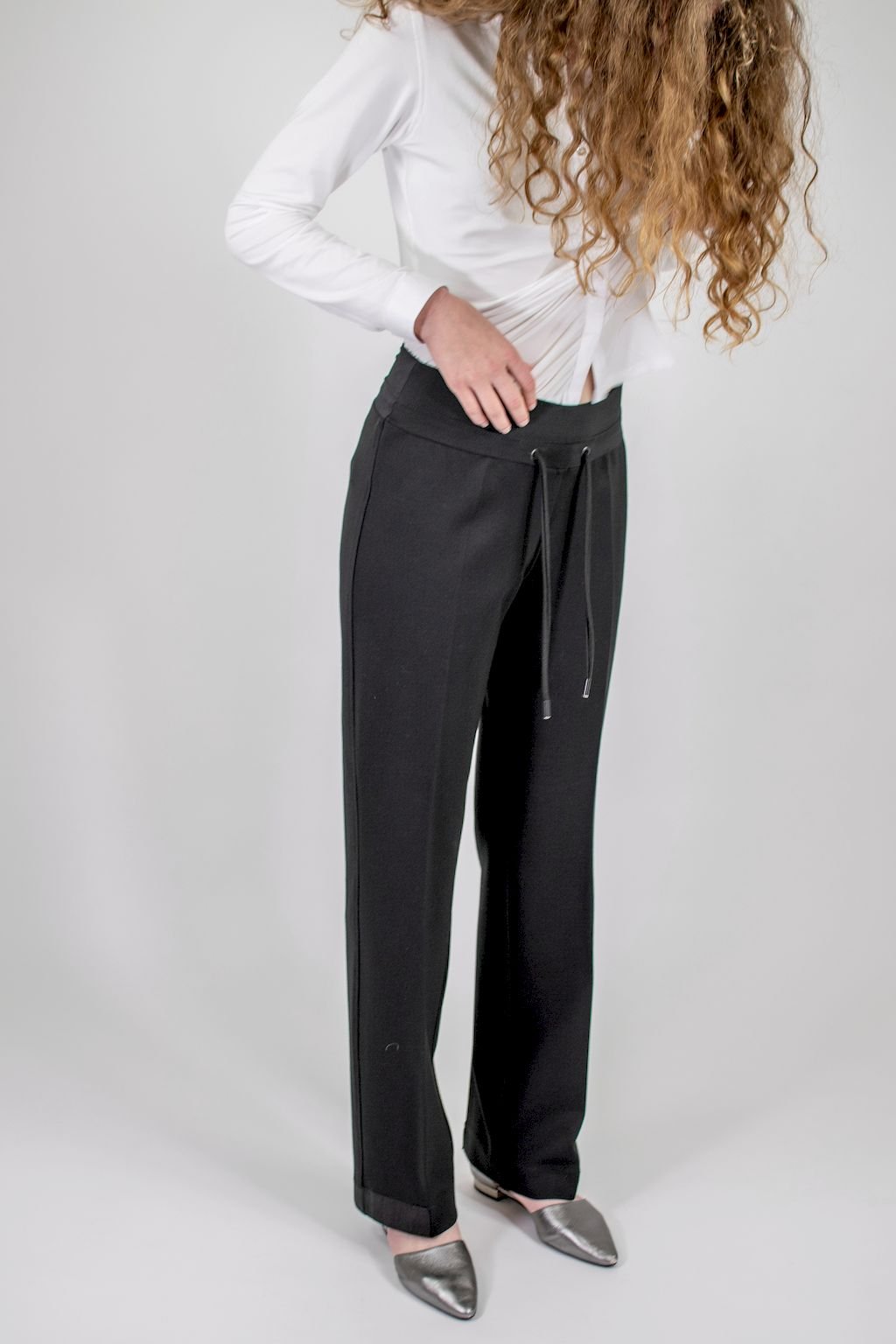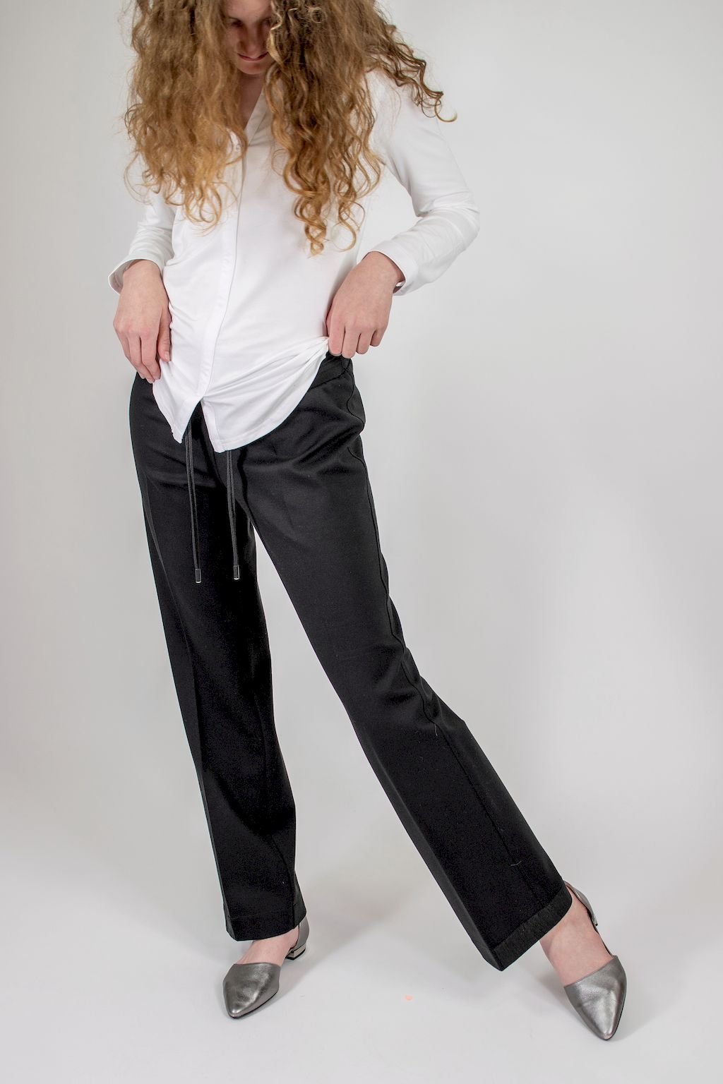 Dámské černé úpletové kaloty, klasického rovného střihu, pohodlný pružný pas s vazačkou. Kalhoty se kterými snadno vytvoříte pracovní i společenskou kombinaci.