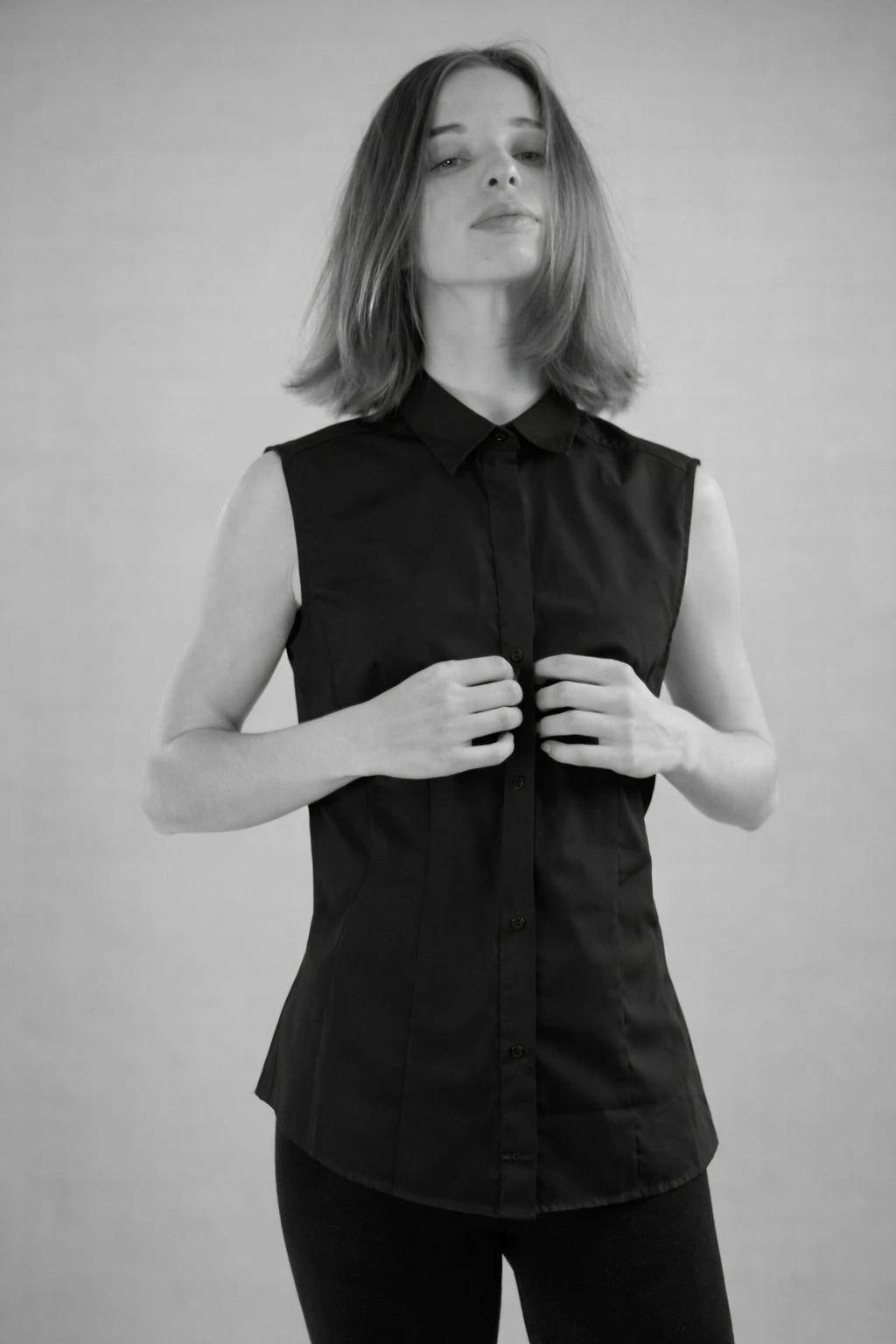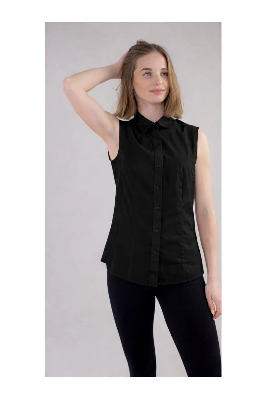 Elegantní dámská košile, bez rukávů, se skrytým zapínáním a možností ozdobit si límeček vlastním monogramem.
