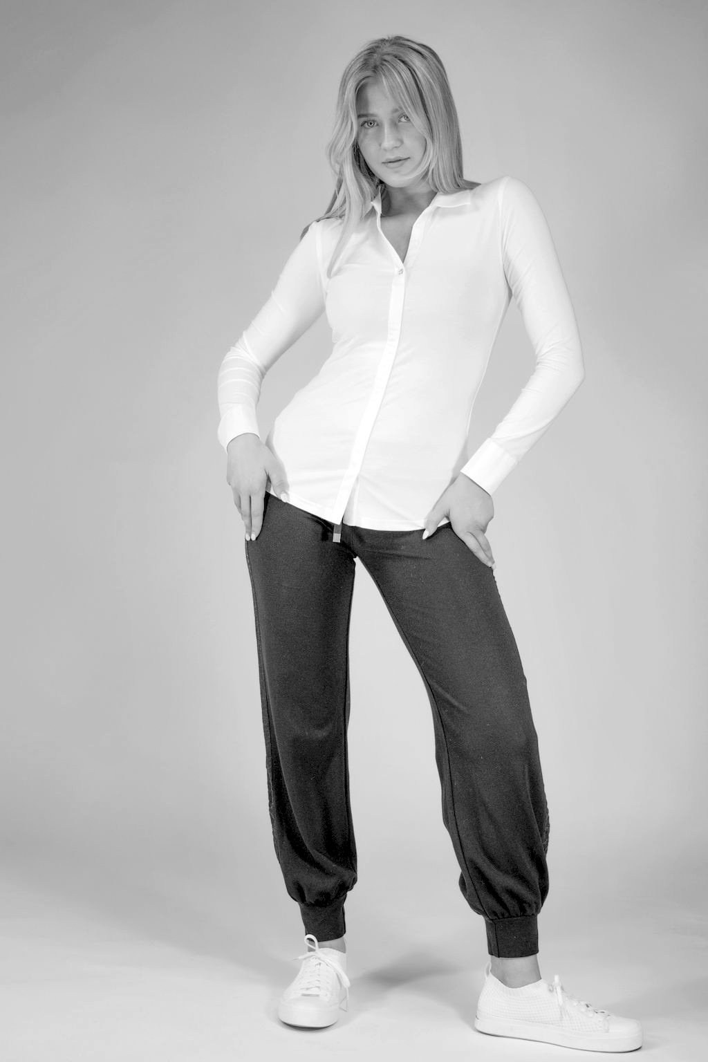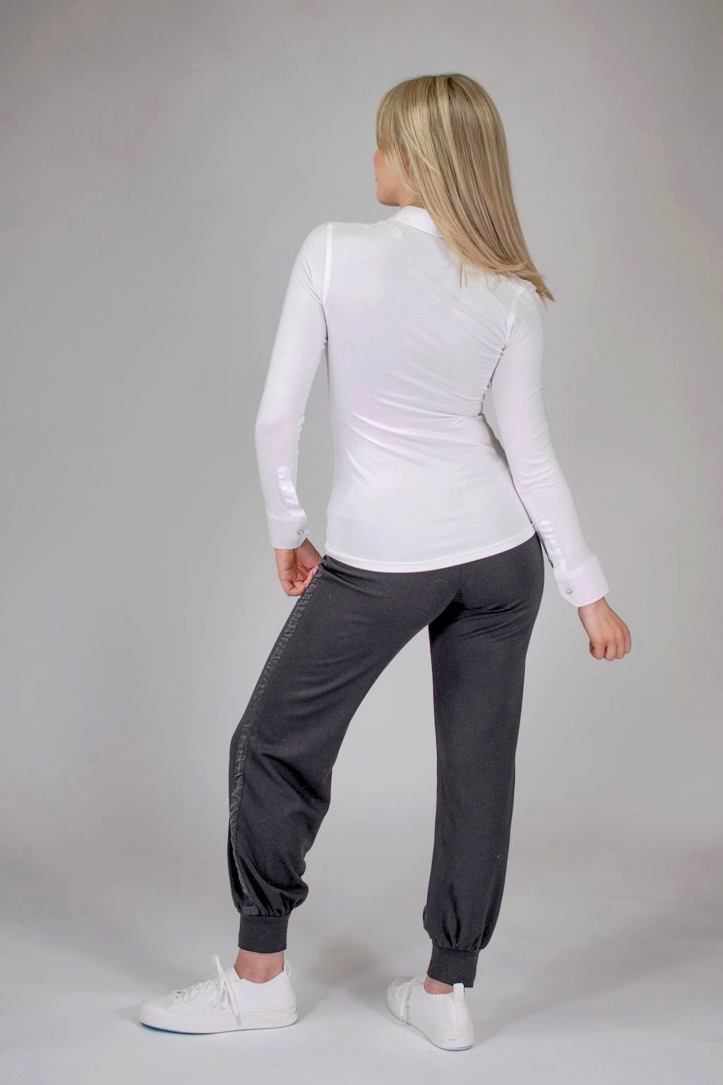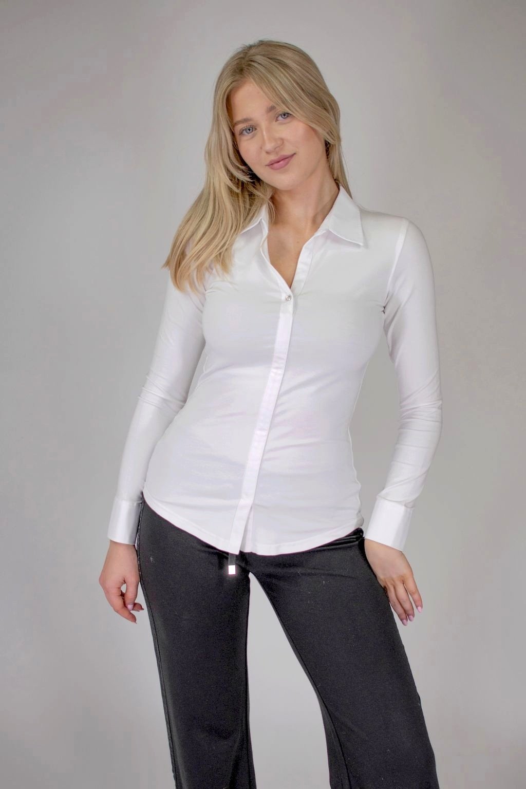 Dámská, bílá, úpletová košile s efektní saténovou légou, límcem a manžetami, doplněná o broušené knoflíčky Swarovski.