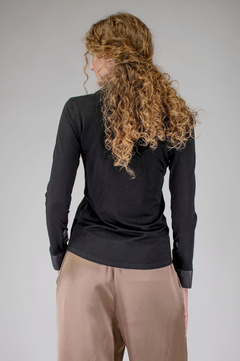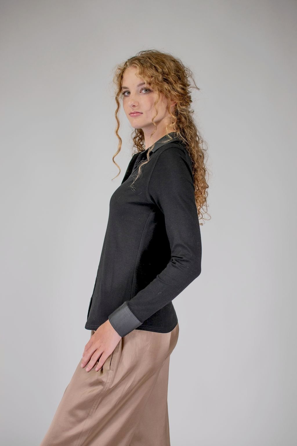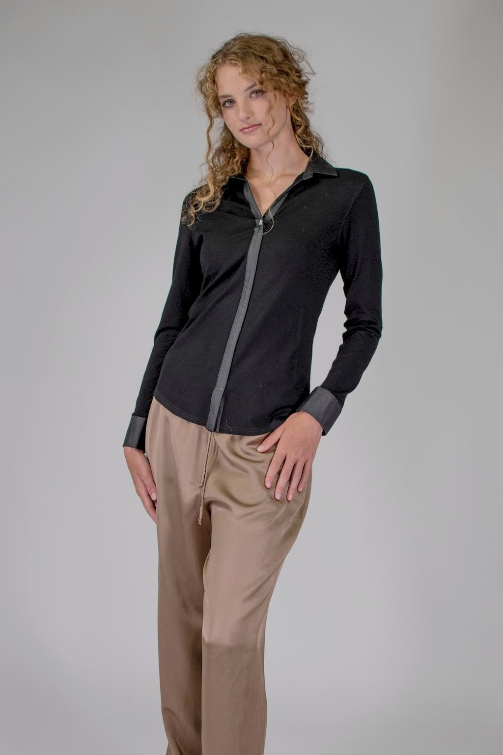 Dámská úpletová košile s efektní saténovou légou, límcem a manžetami, doplněná o broušené knoflíčky Swarovski. Volbou může být výšivka monogramu na manžetku.