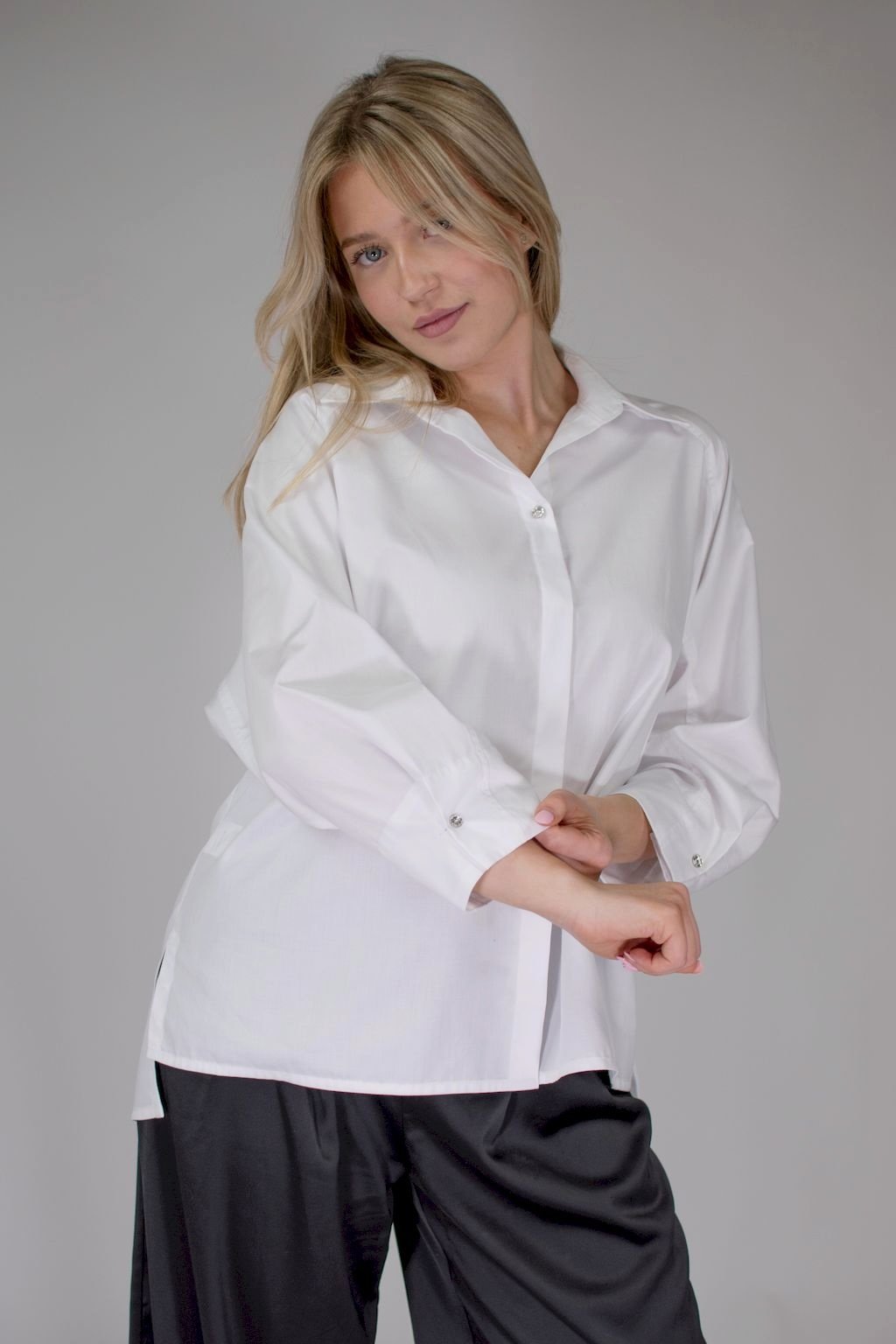Elegantní dámská bílá košile, se skrytým zapínáním a asymetrickou délkou, na liště zapínání a manžetách ozdobená broušenými knoflíčky Swarovski.