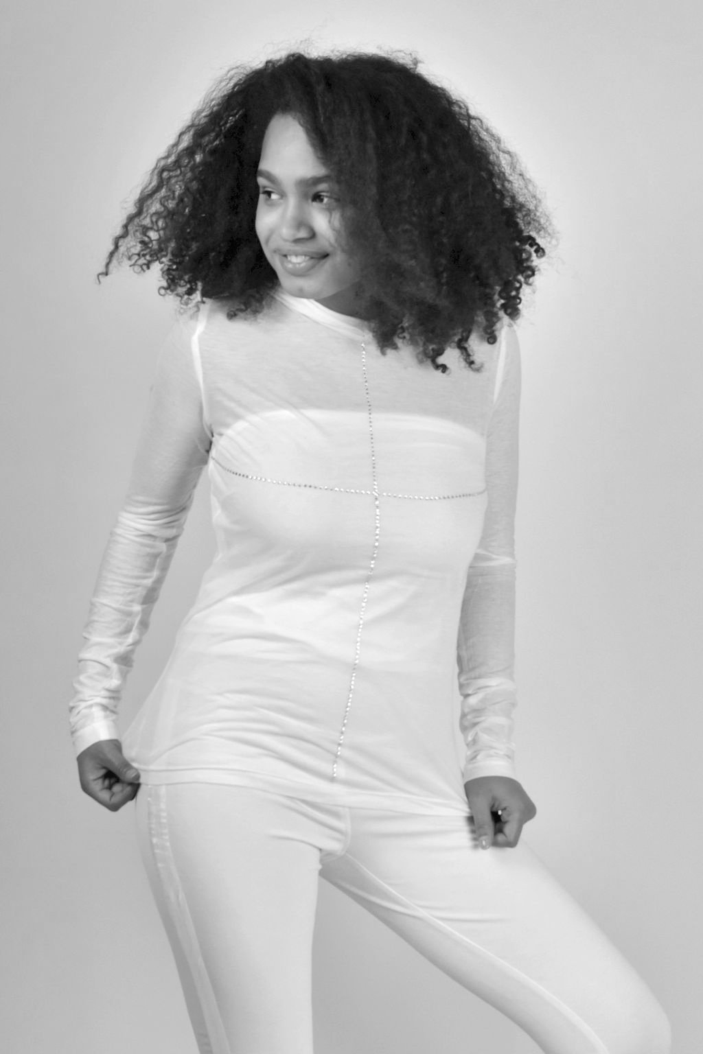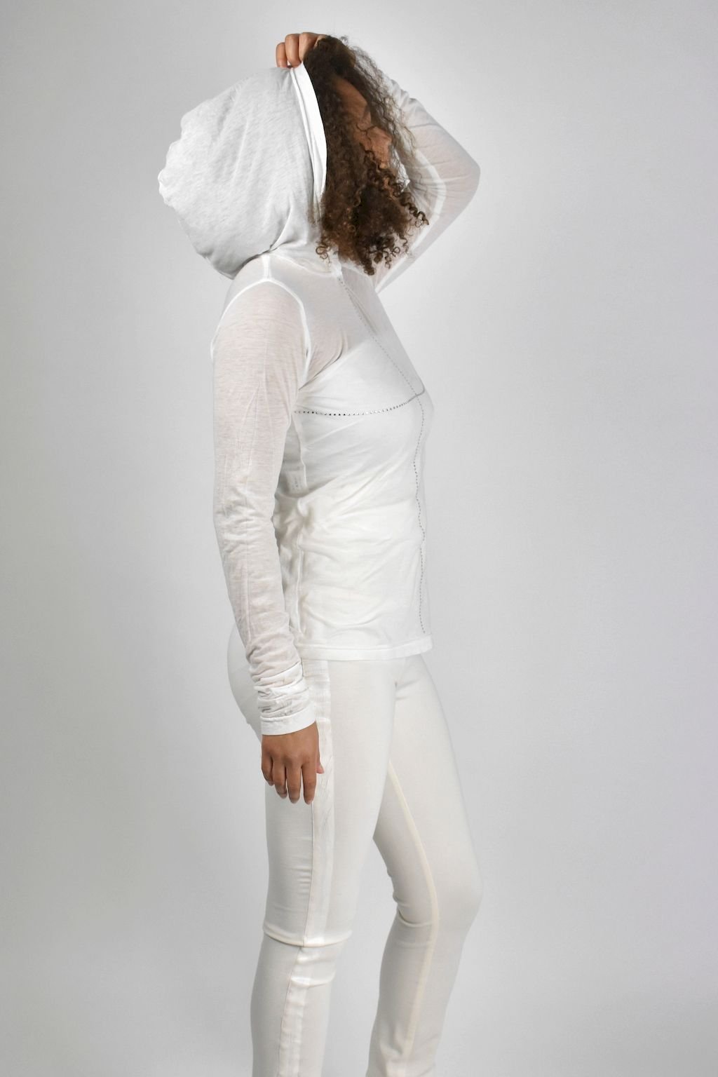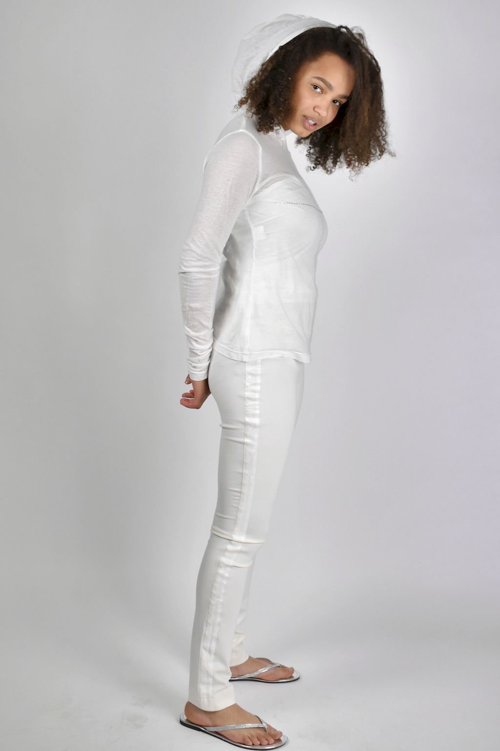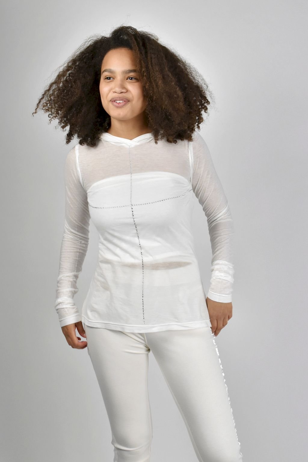 Sportovně elegantní, lehké triko s kapucí ve smetanové barvě, z lehoučkého viskózového materiálu, s aplikací broušenými čirými kamínky Swarovski.