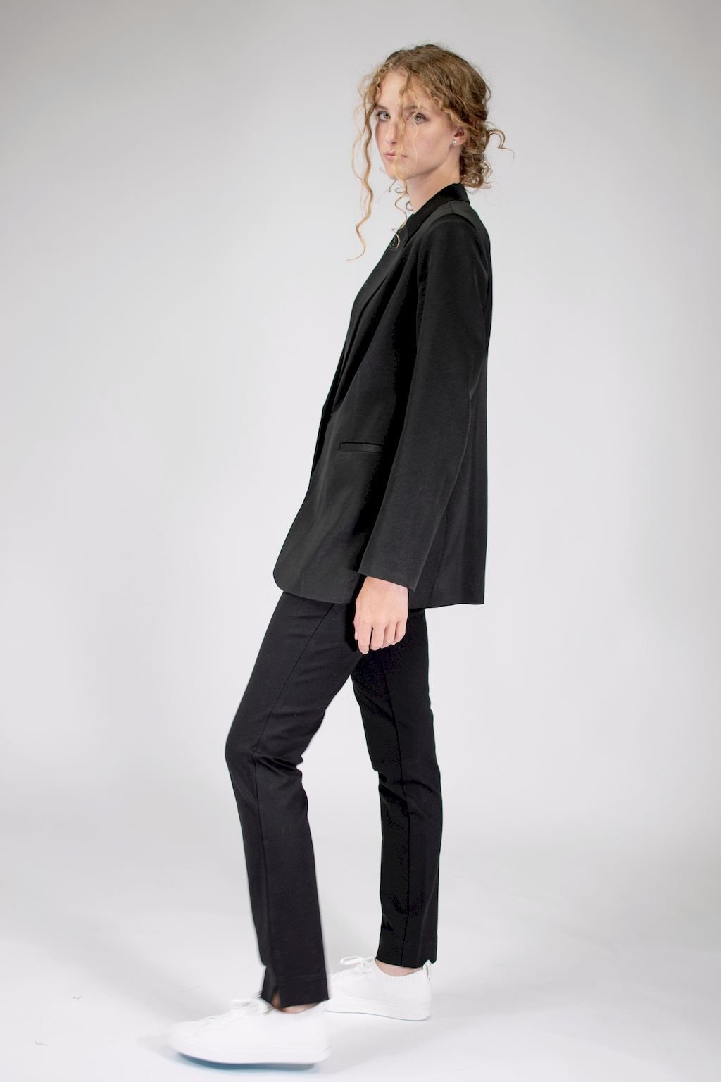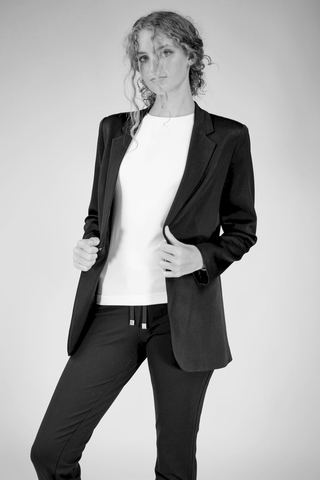 Dámské černé over size sako s klasickou fazonou. Navzdory ležérnímu, pohodlnému střihu, si sako stále zachovává elegantní vzhled. Ideální módní kousek vhodný pro vrstvení a snadné kombinování s dalšími modely ve vašem šatníku.