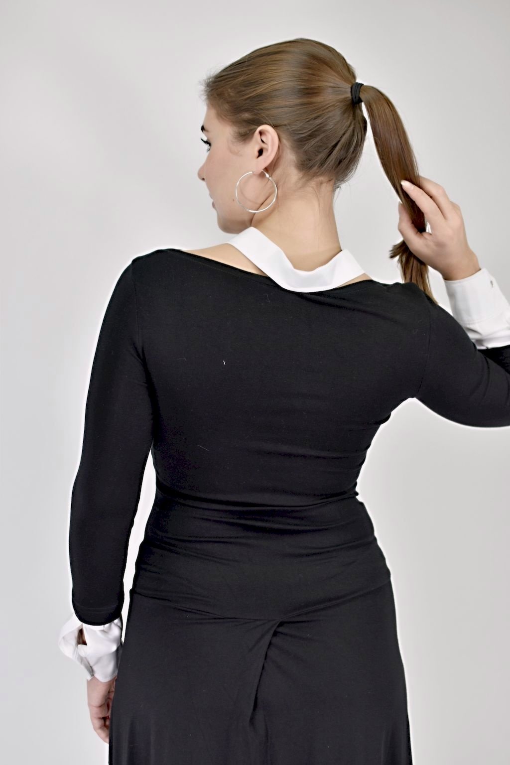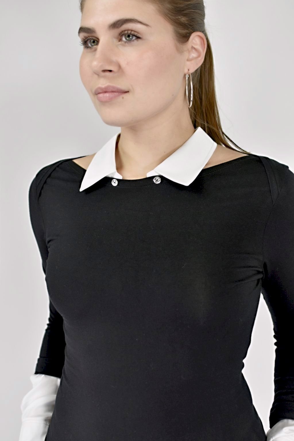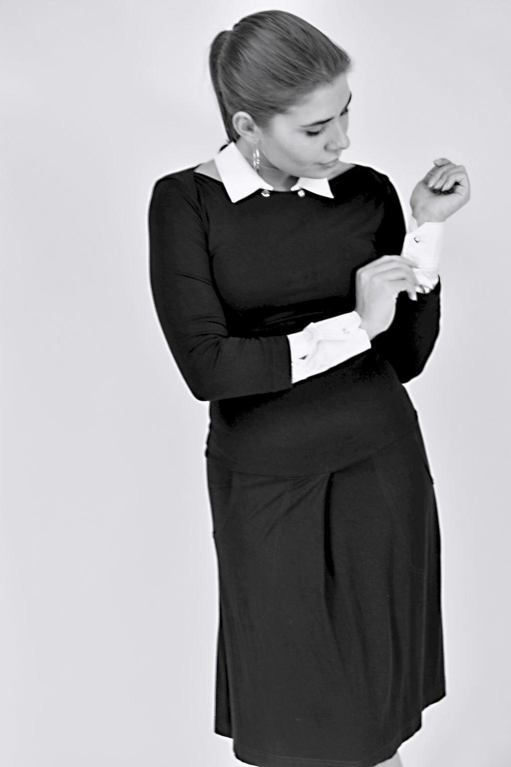 Úžasné, variabilní, úpletové šaty s odepínacím límcem a manžetami na ozdobné broušené knoflíčky. Jedny šaty, čtyři modely. Šaty s límečkem a manžetami? ANO! Šaty bez límečku a manžet? JISTĚ! Šaty jen s límečkem? PROČ NE?! Šaty bez límečku, ale s manžetami? KAŽDOPÁDNĚ! Prostě šaty pro každou vaší náladu a příležitost.