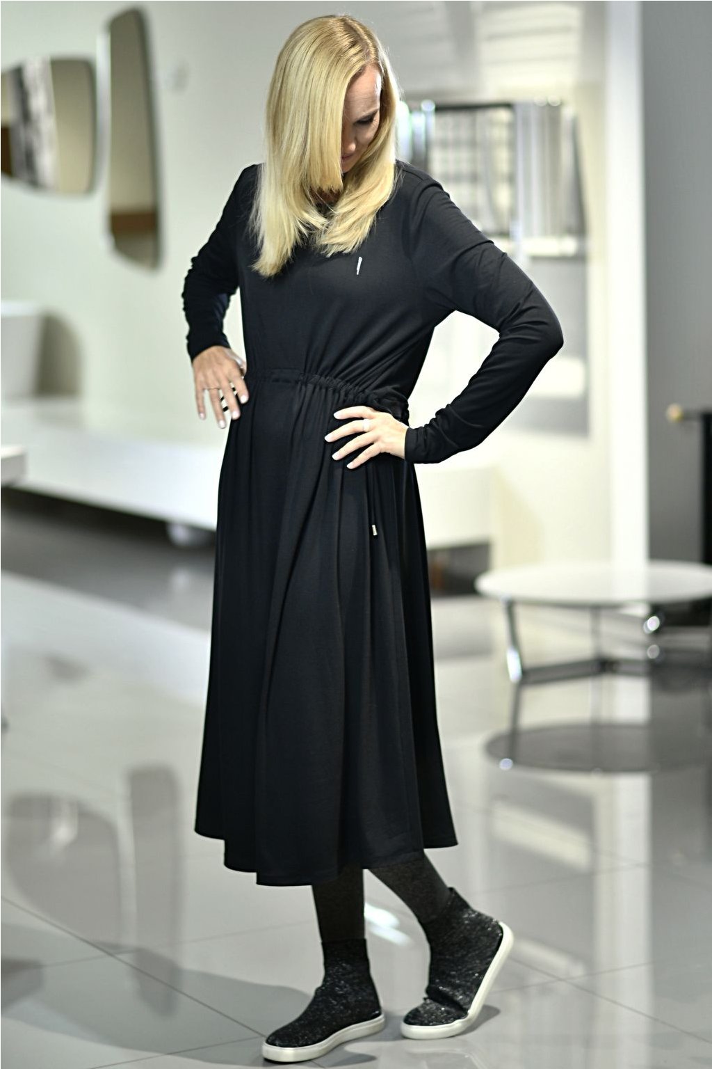 šaty řasené na předním i zadním díle, výstřih s rozparečkem, volný střih, pohodlný materiál