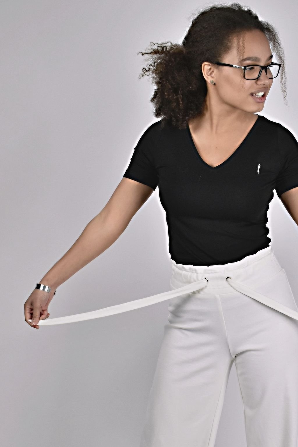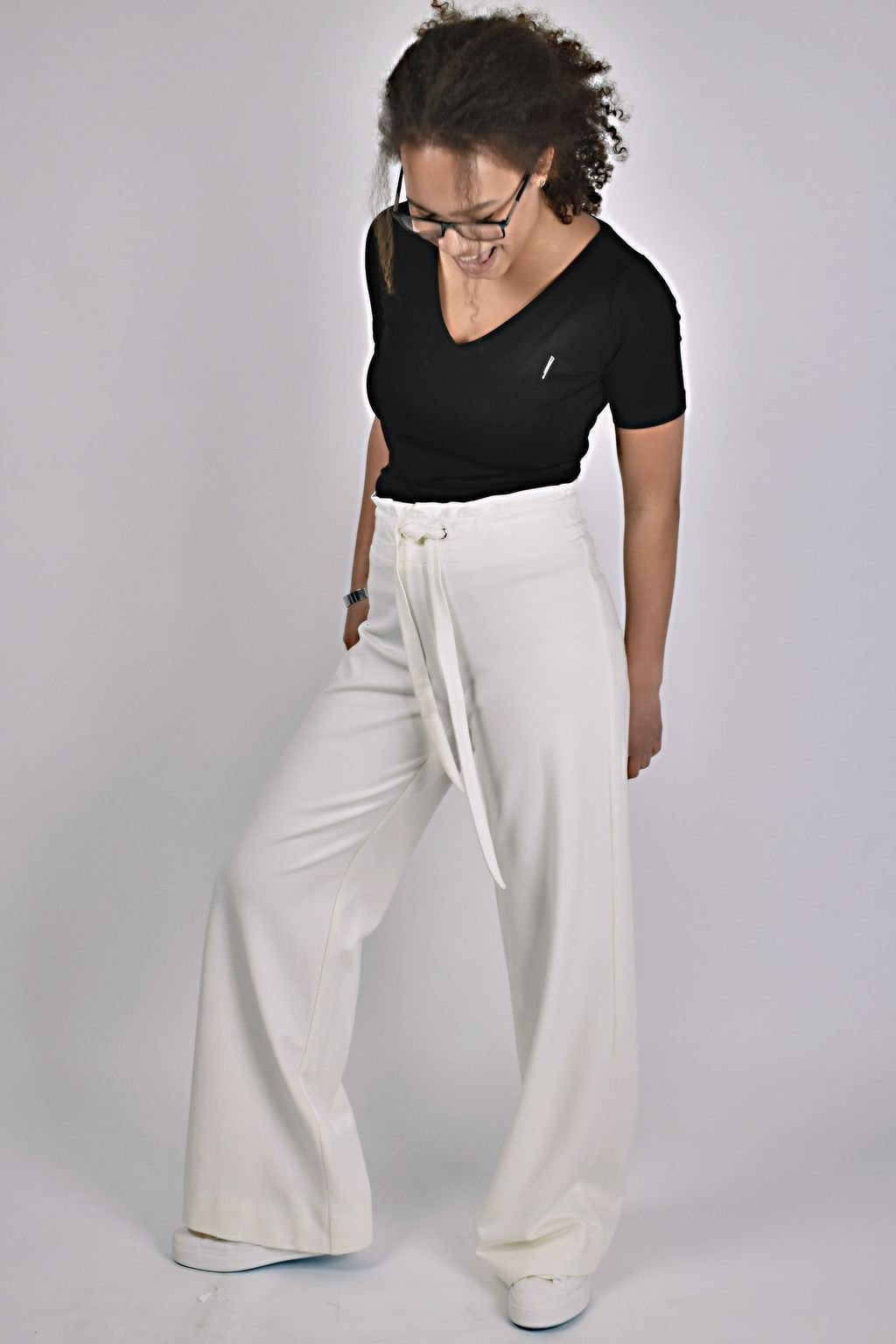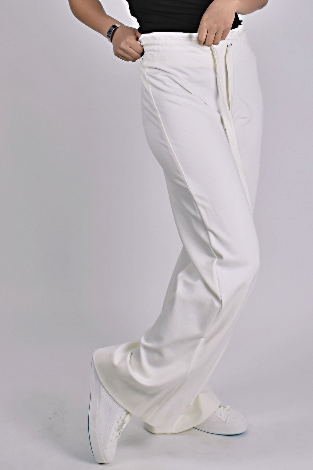 Dámské, široké, smetanové kalhoty s vysokým pasem a vazačkou. Kvalitní úpletový materiál, který si zachovává tvarovou stálost.
