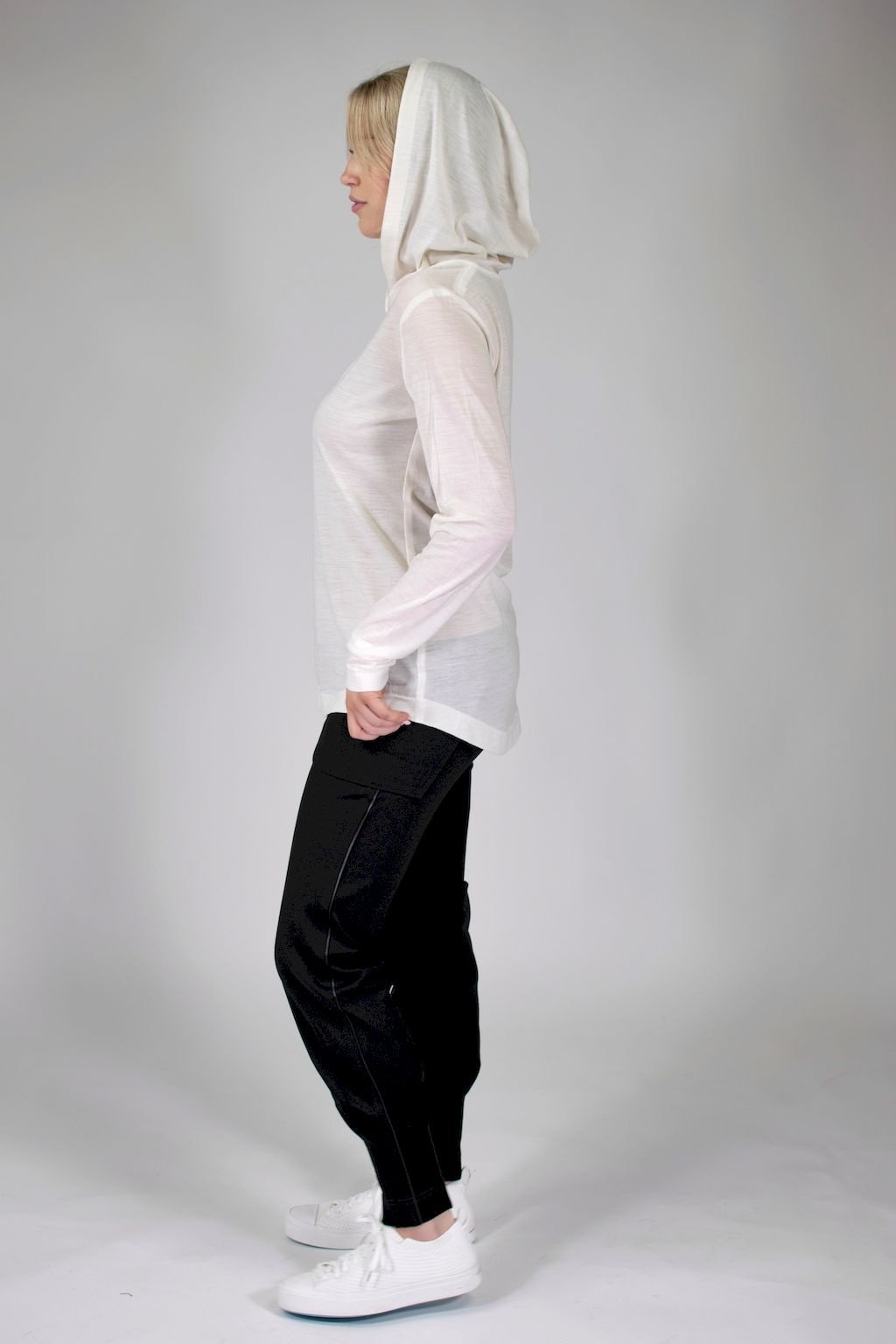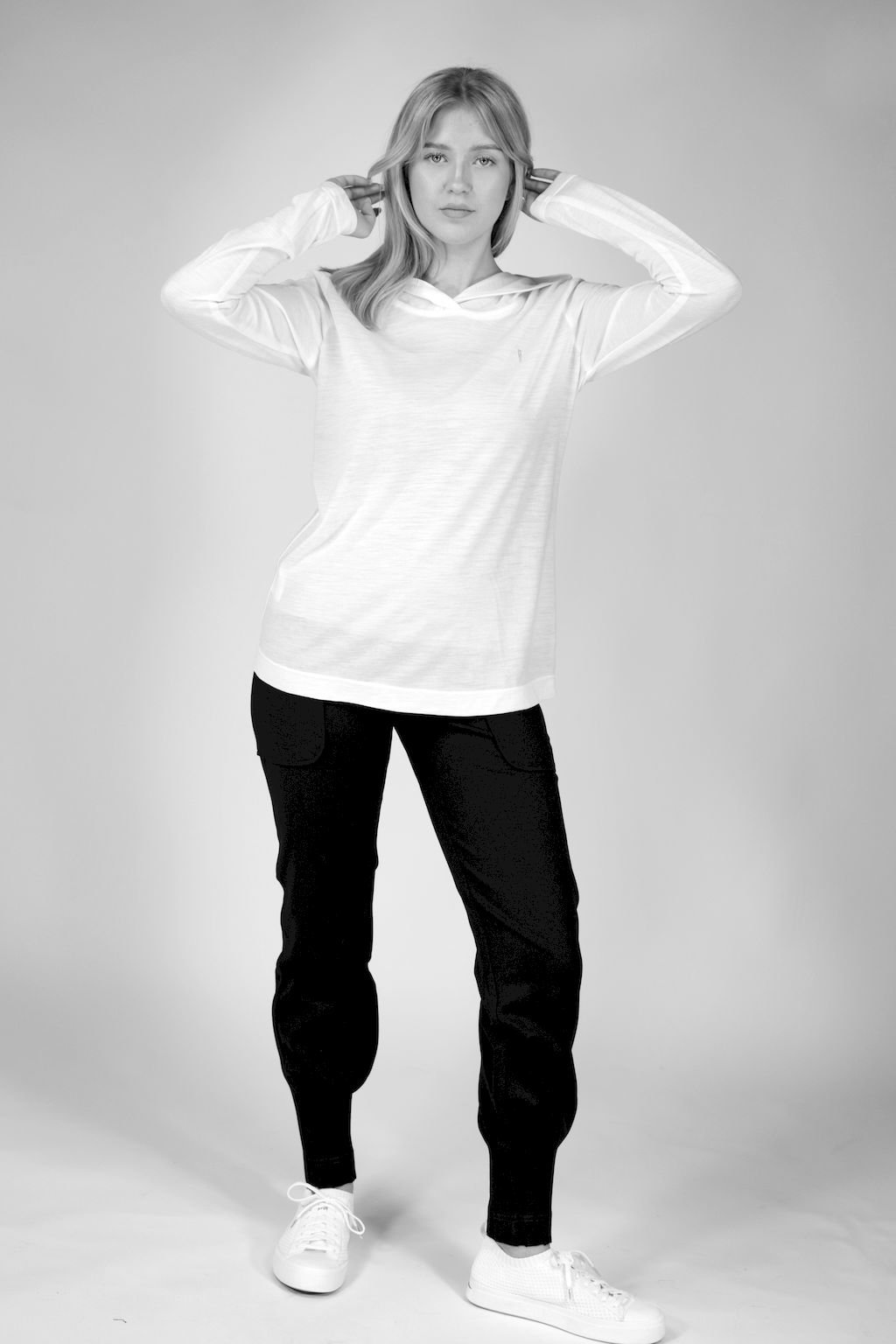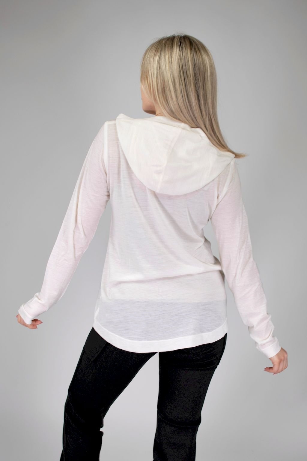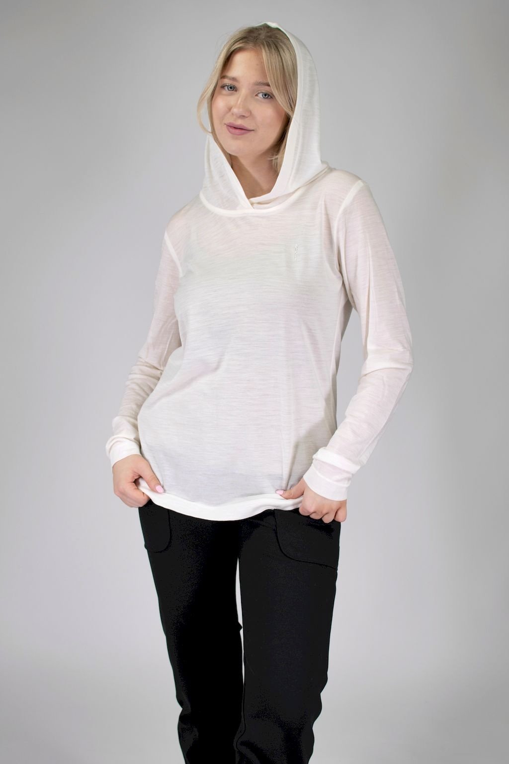 Dámské smetanové triko s kapucí a dlouhým rukávem a prodlouženým zadním dílem. Merino vlna se vyznačuje skvělými termoregulačními a přirozeně antibakteriálními vlastnostmi.