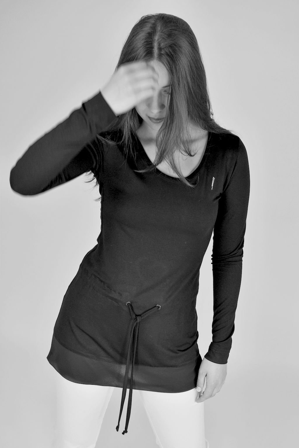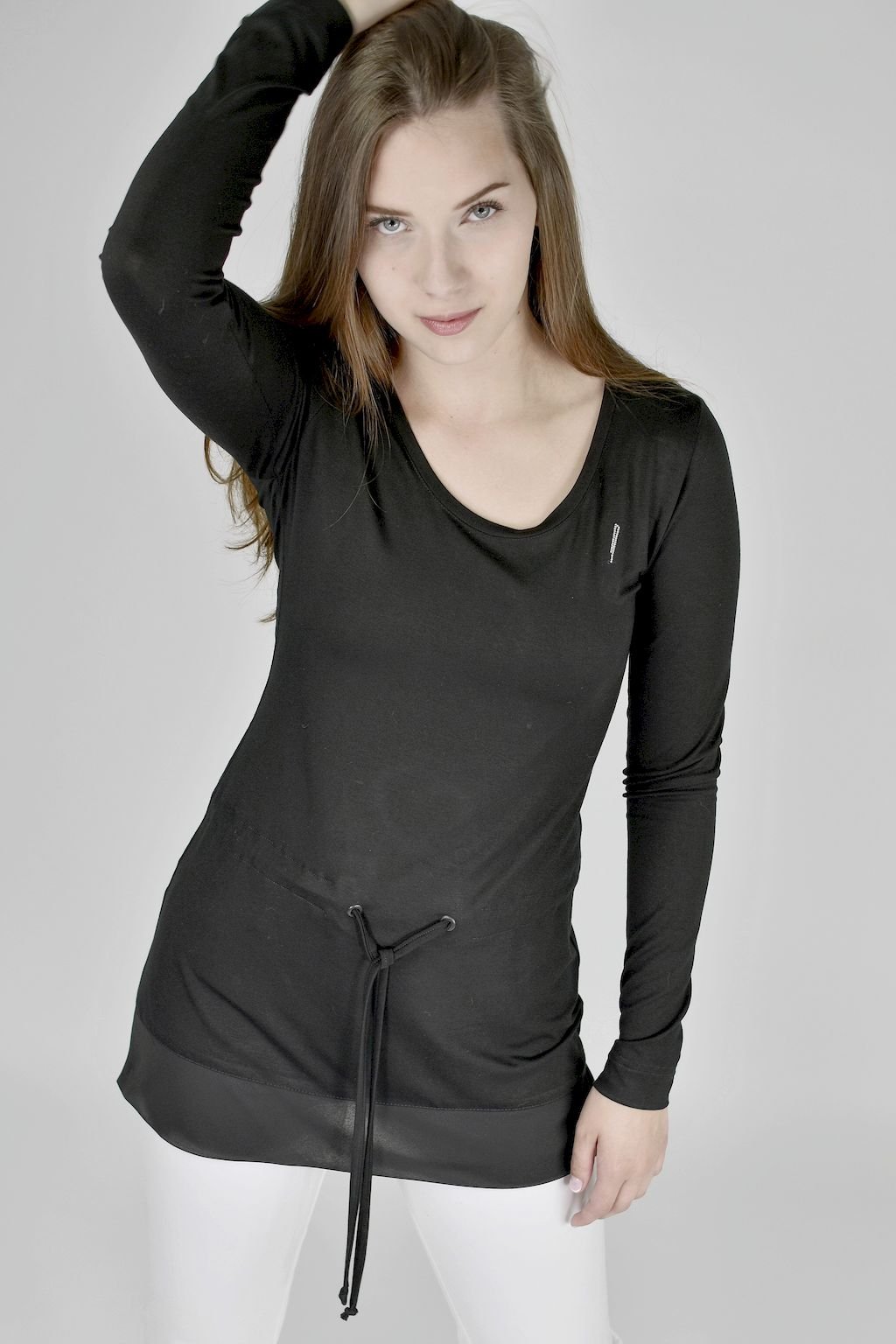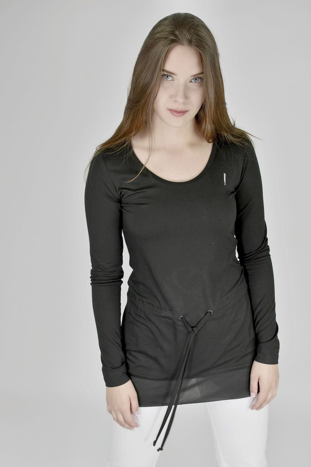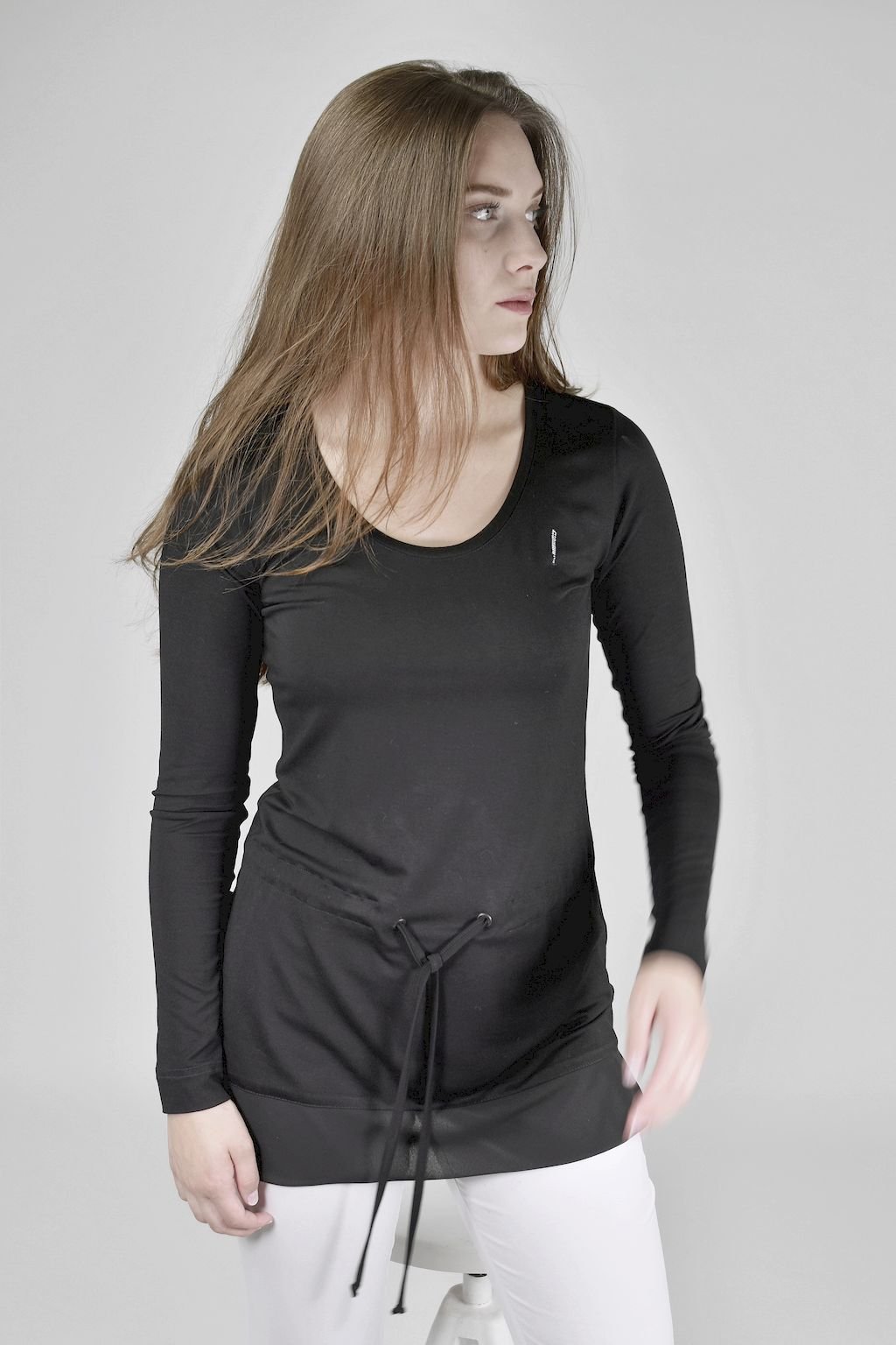 Dámská, černá tunika s výstřihem, dlouhým rukávem, v pase šňůrka na stahování, délka zakončená šifonovým lemem s rozparky, autorské logo z broušených kamínků.