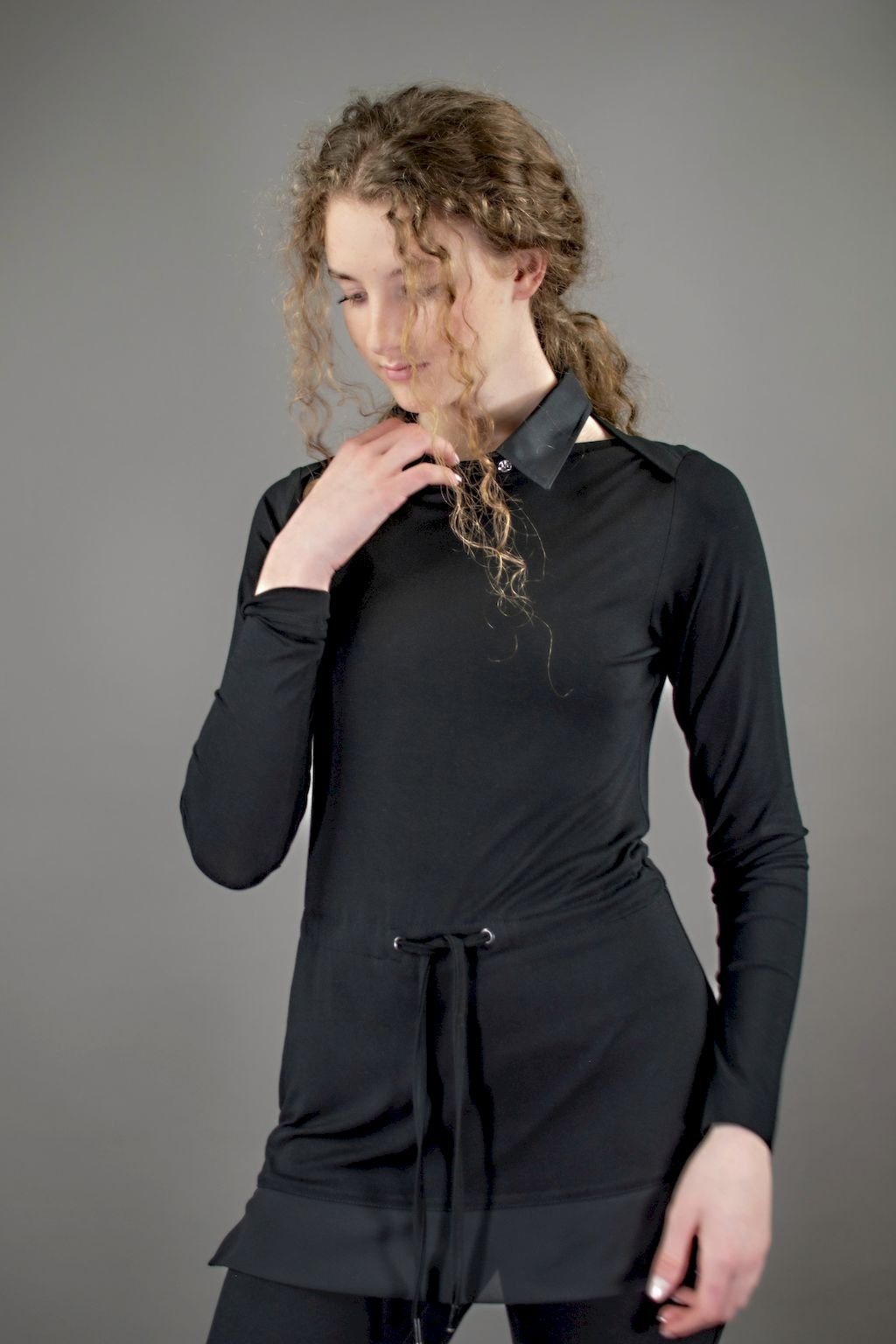Dámská černá tunika lichotivého střihu, s dlouhým rukávem, černým odepínacím límečkem, v pase na zavazování.
