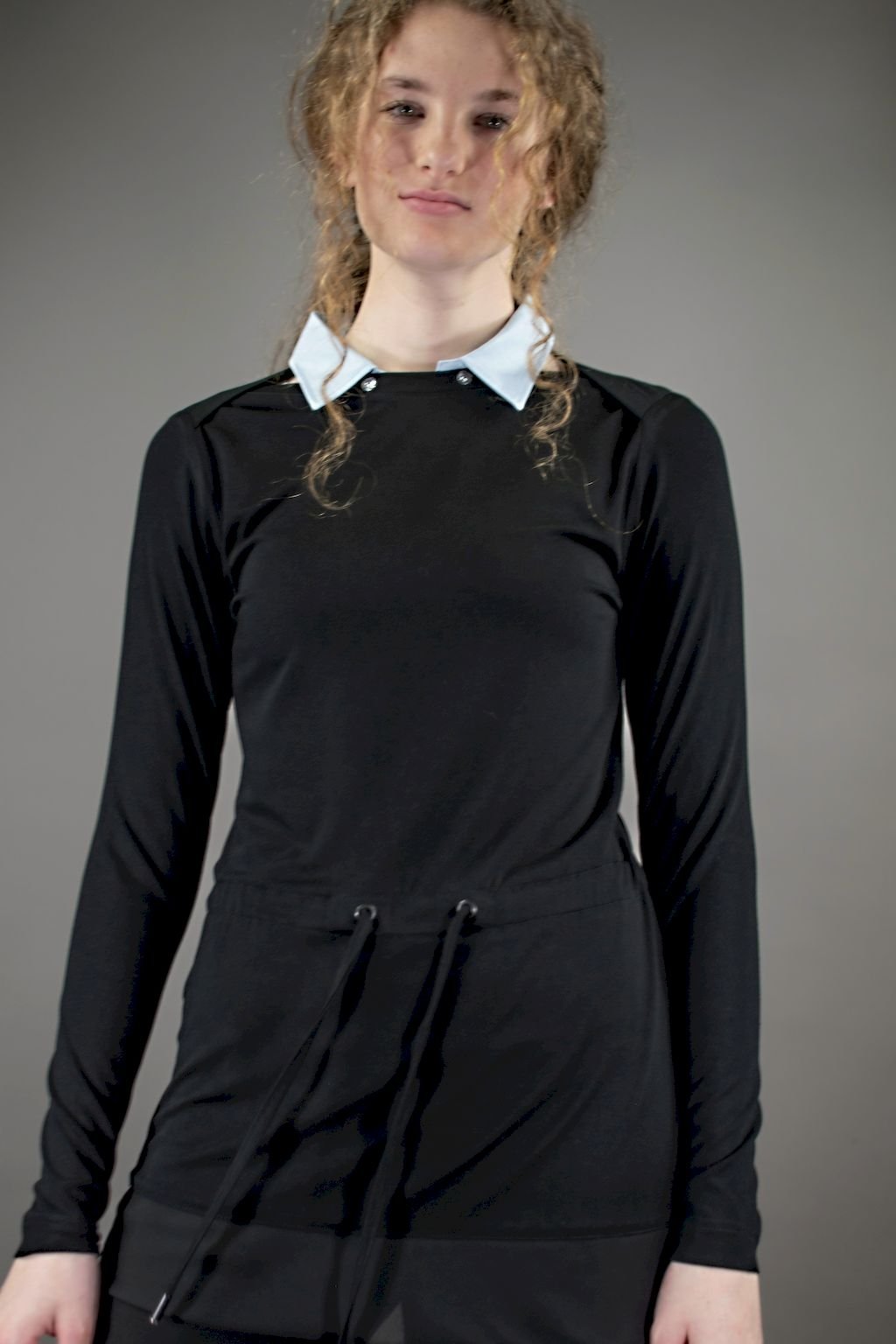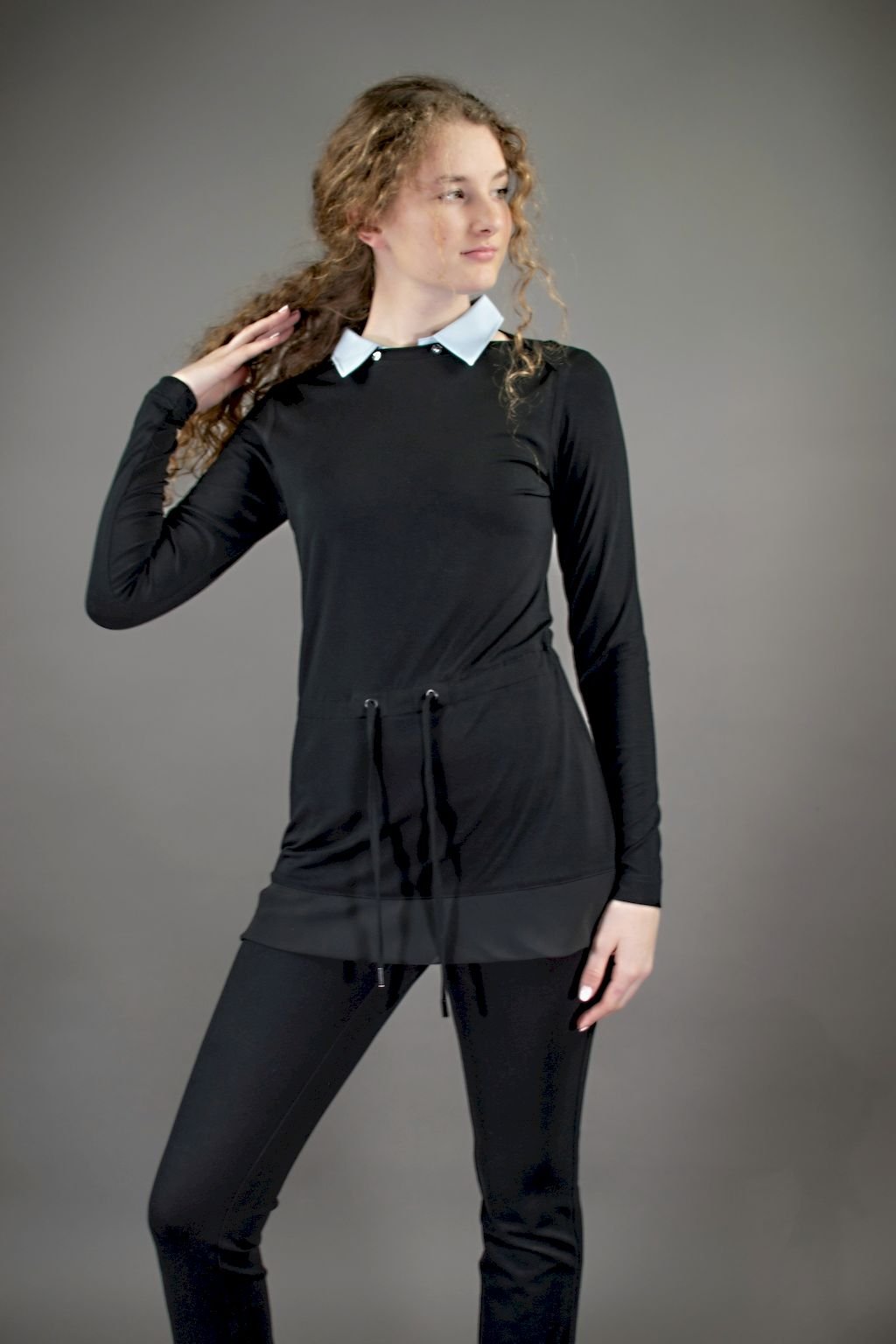 Dámská černá tunika lichotivého střihu s dlouhým rukávem a blankytně modrým, elegantním odepínacím límečkem, v pase na stažení vazačkou.