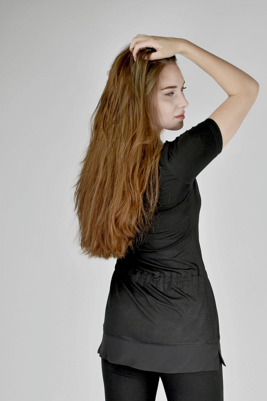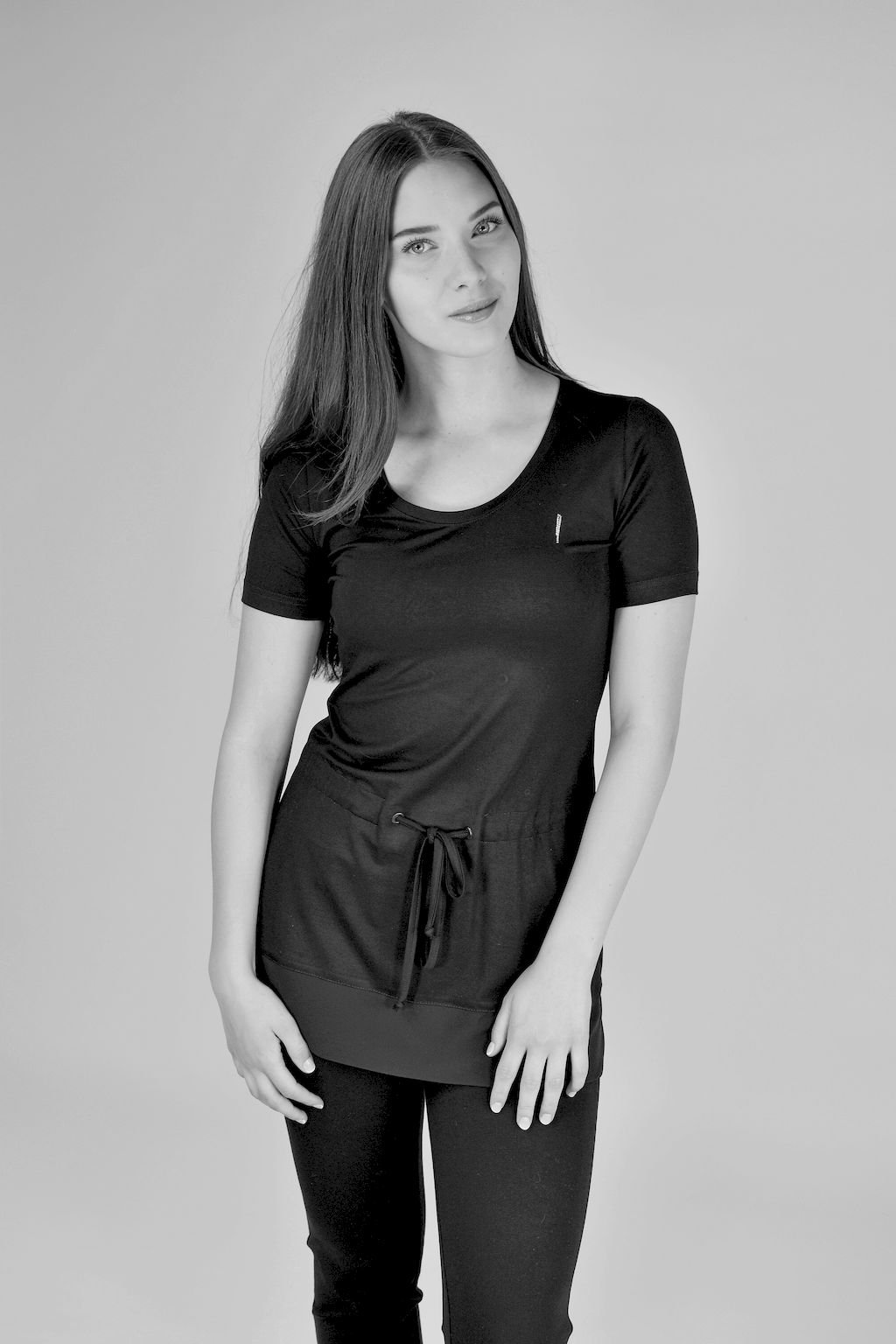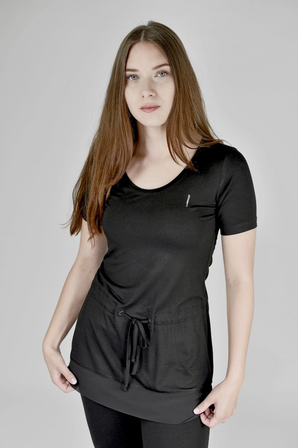 Dámská černá tunika s krátkým rukávem, je vyrobena ze speciálně upraveného materiálu, z opalovaného viskózového vlákna. Toto vlákno je extrémně odolné vůči oděru. A právě díky této vlastnosti si tunika zachovává po dlouhý čas svůj luxusní vzhled. Je proto vhodná pro jakoukoliv příležitost, lze ji kombinovat v nekonečném počtu outfitů.