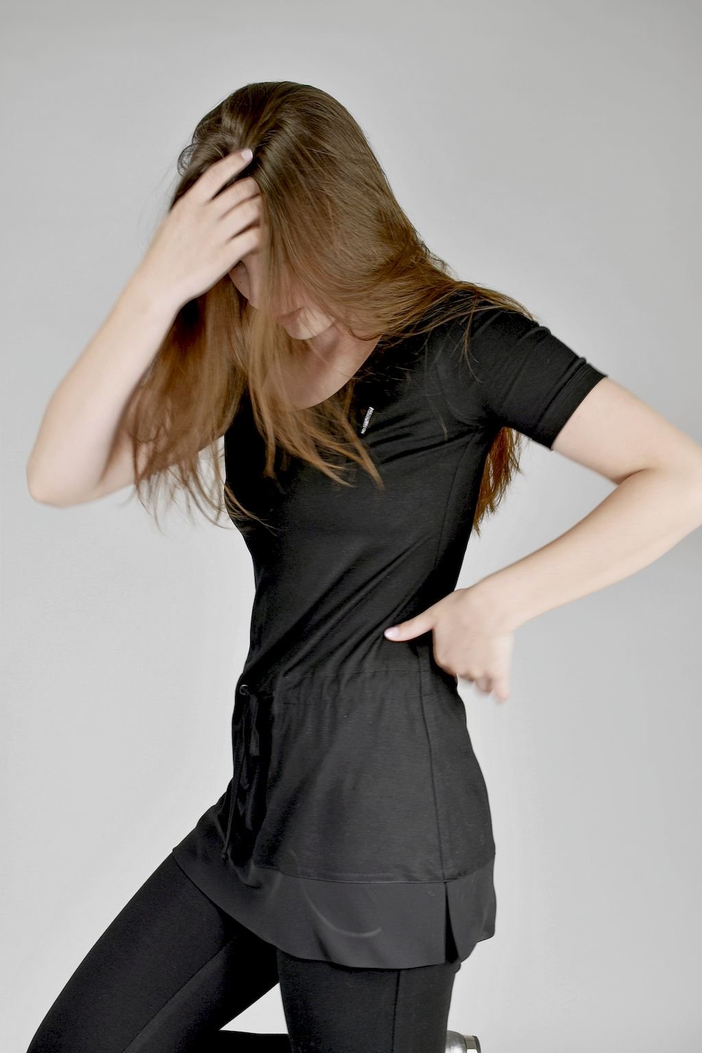 Dámská, černá tunika s výstřihem, krátkým rukávem, v pase šňůrka na stahování, délka zakončená šifonovým lemem s rozparky, autorské logo z broušených kamínků.