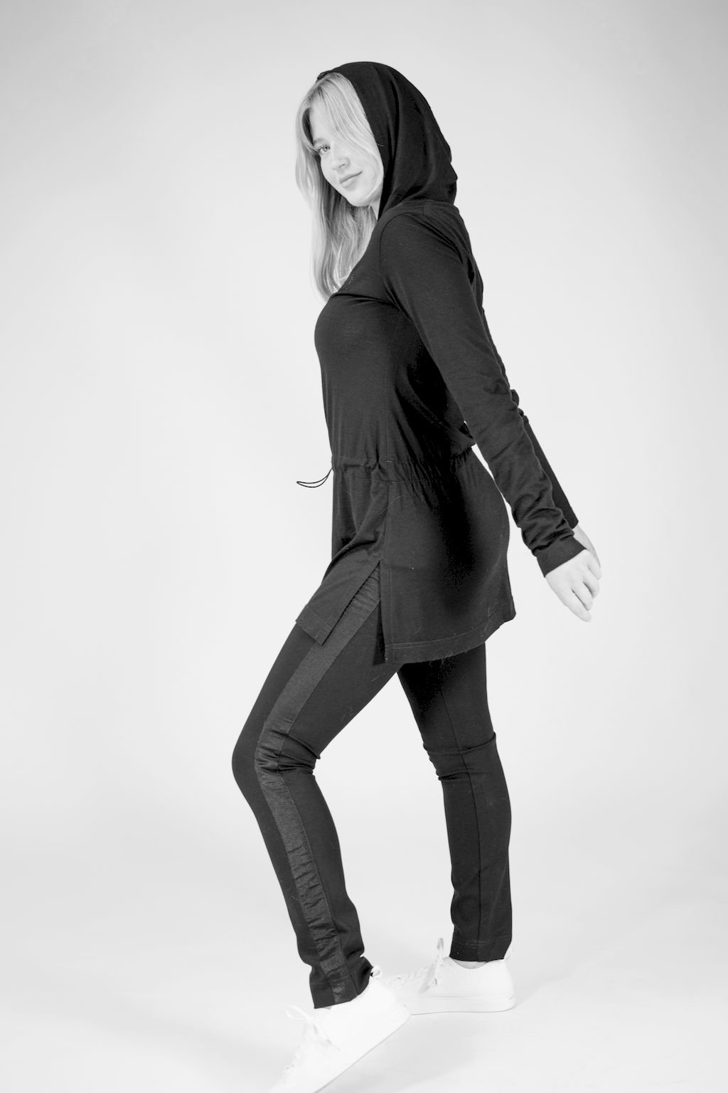 Dámská černá tunika s kapucí, dlouhým rukávem, v pase na stažení, je vyrobena z kvalitního vlněného materiálu. Tyto jedinečné vlastnosti merino materiálu vám zajistí maximální pohodlí ať, už relaxujete, nebo se věnujete sportovním aktivitám.
